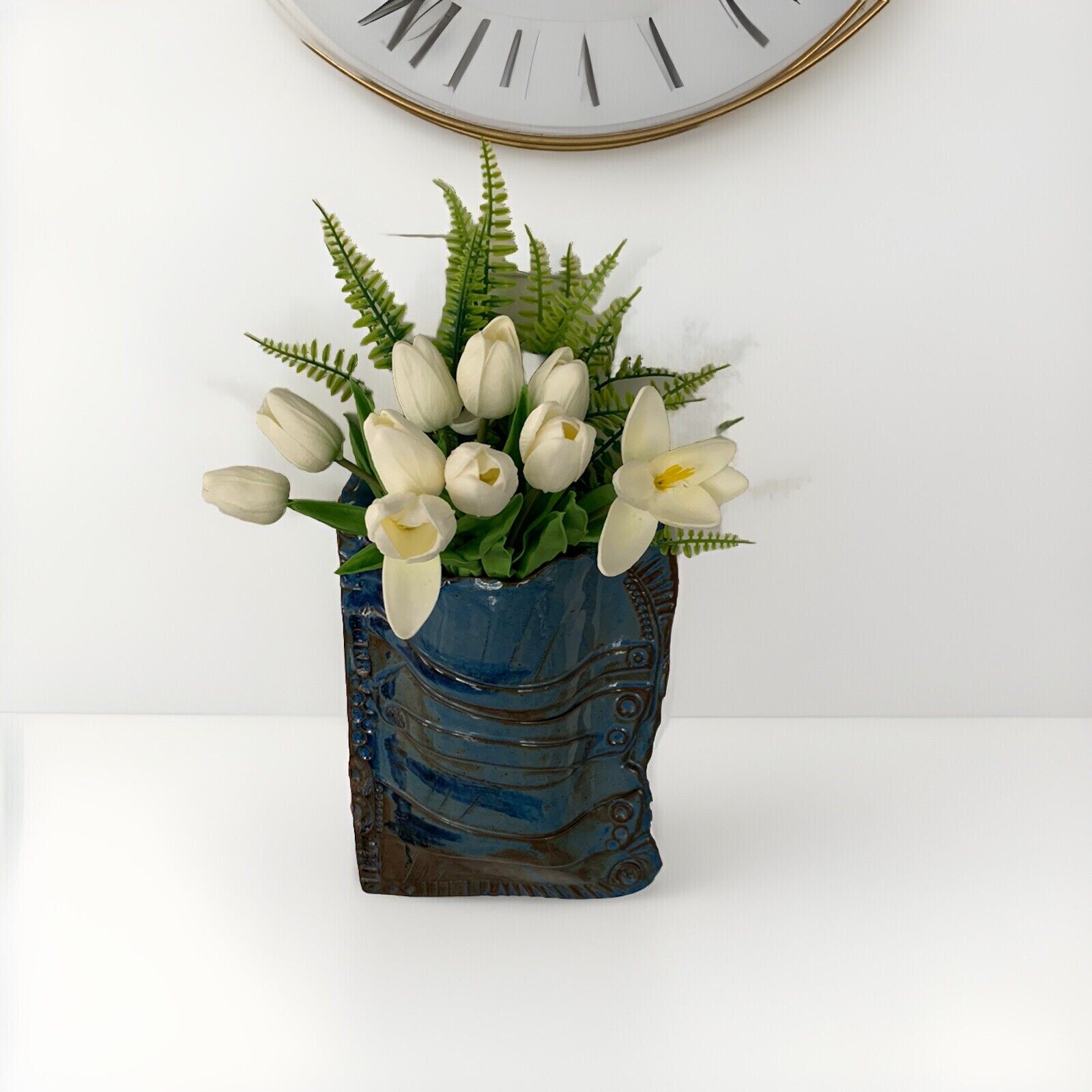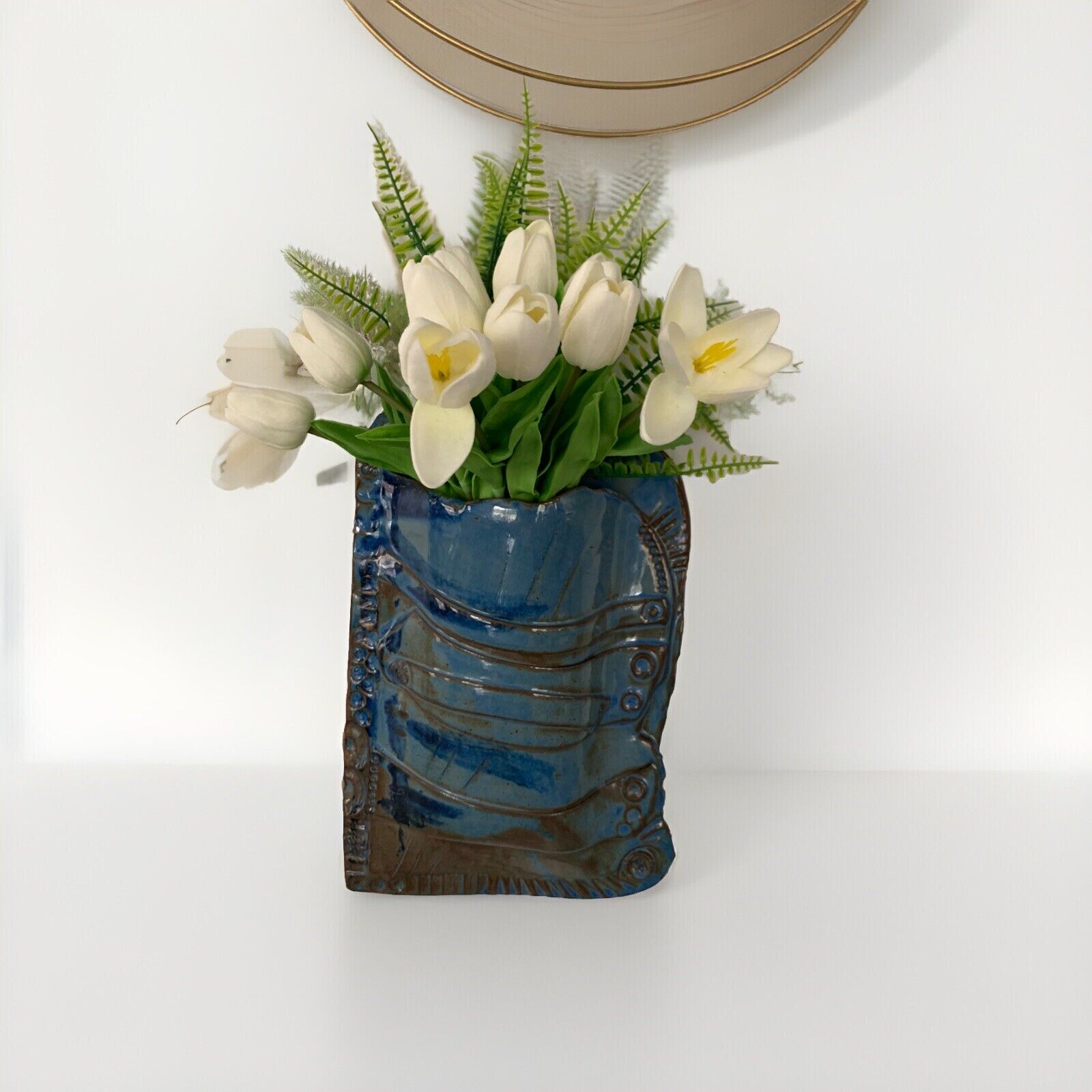 Add a touch of elegance to your home decor with this stunning handcrafted wall pocket vase. The glossy blue speckle finish gives it a unique and charming appearance that is sure to catch the eye of any visitor. Measuring 3 inches in height, 8.5 inches in width, and 12 inches in length, this vintage piece is perfect for displaying your favorite flowers or as a standalone decorative item.
