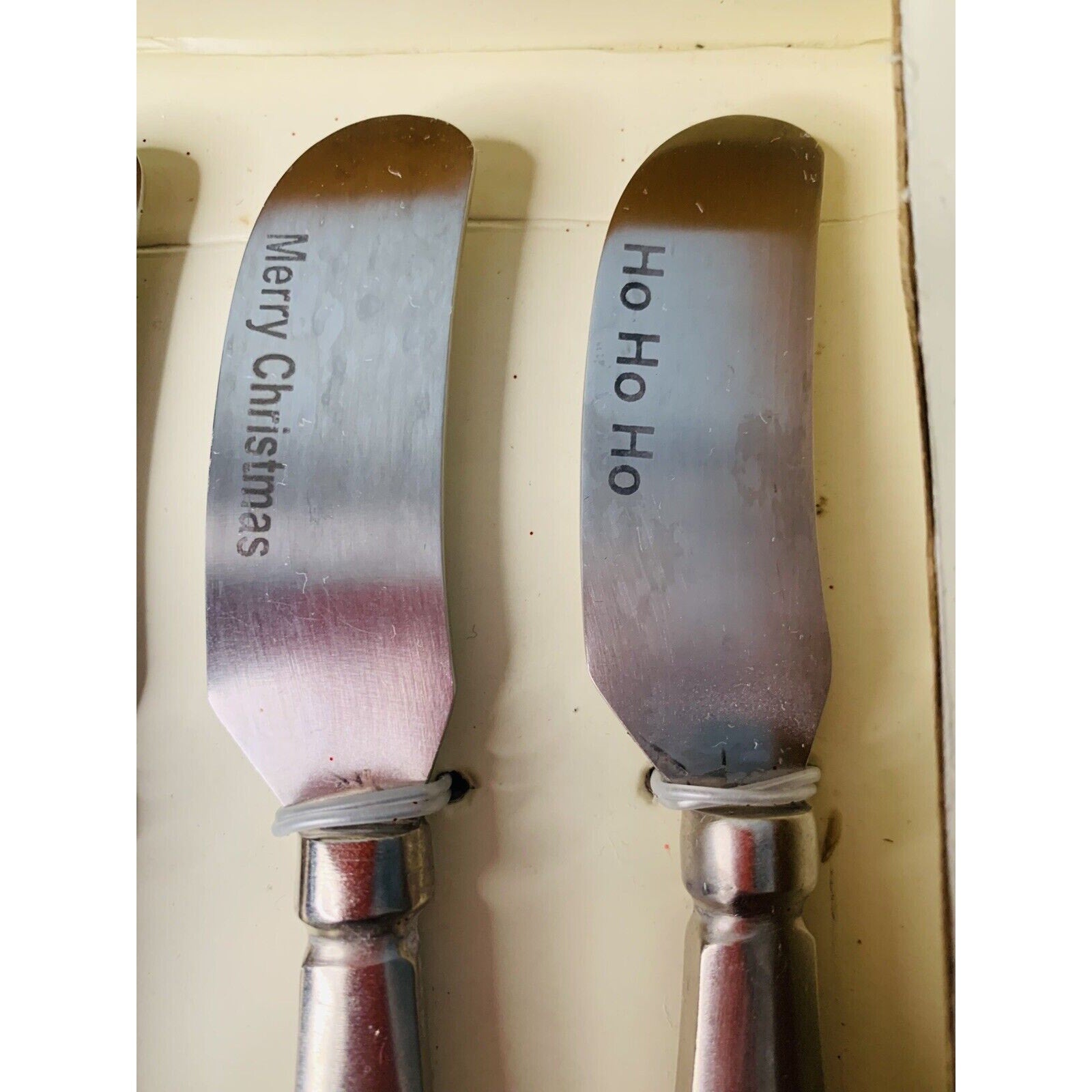 New old stock. Boxes may have wear from storage. This is a 2-piece Cynthia Rowley cheese spreader set in a festive Merry Christmas design. The set includes 8 pieces, perfect for everyday use or parties. The spreaders are made of stainless steel with a glossy finish and have handles in a farmhouse style. They are reusable and feature a holiday theme with a "Ho Ho" design.