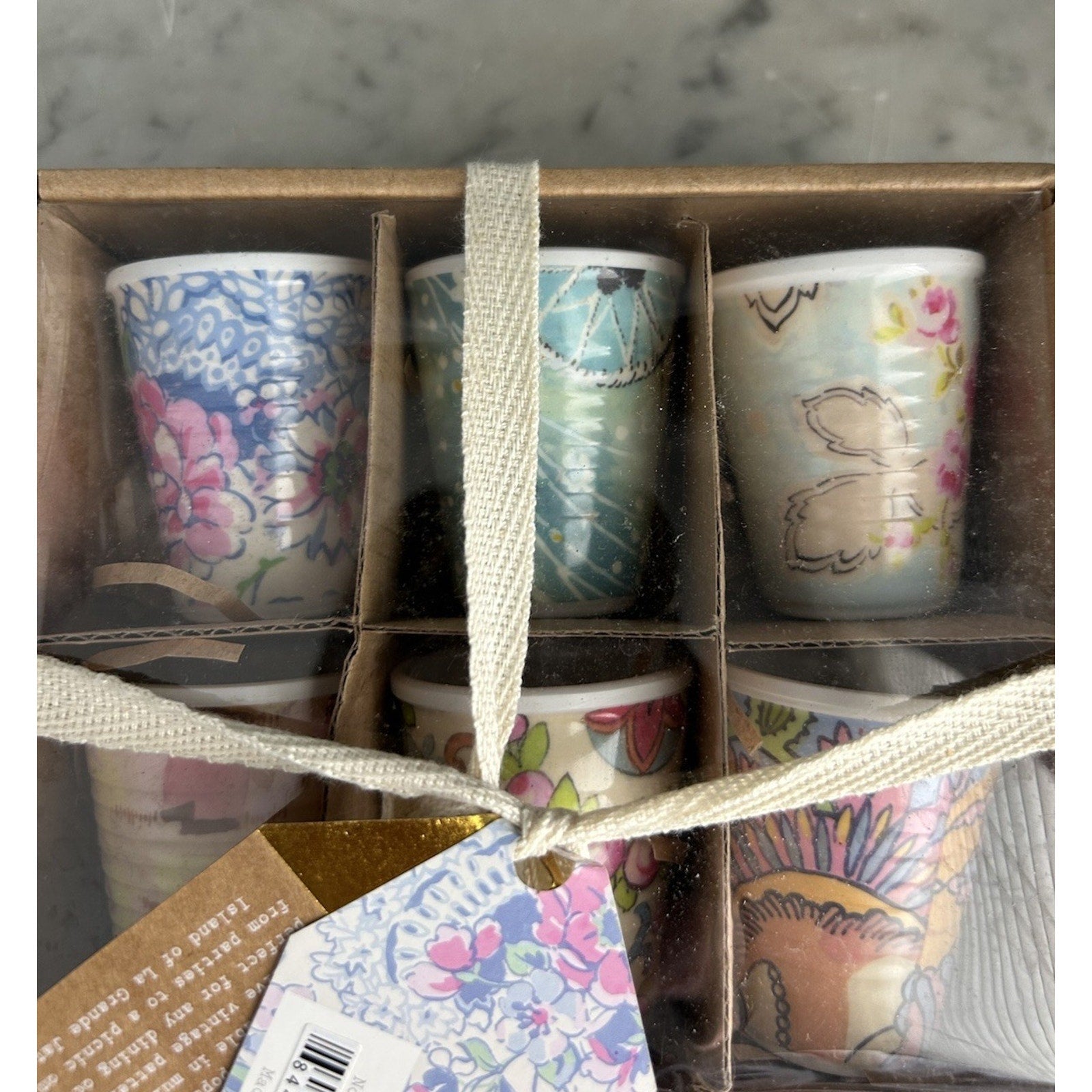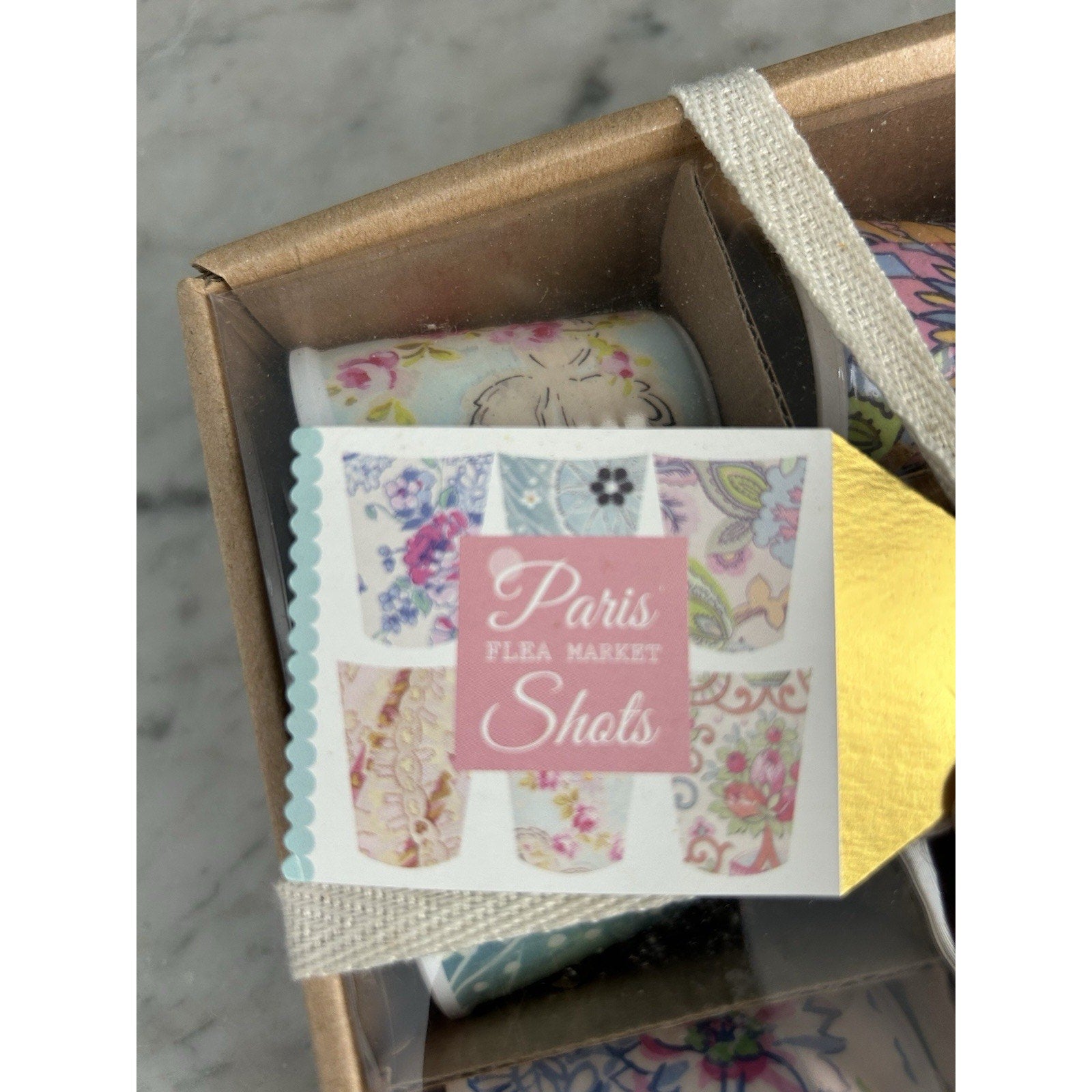 New in box. This set of 12 Glitterville Paris Flea Market shot glasses is a must-have for any collector or party host. Made of high-quality ceramic, these round glasses are break and chip resistant, making them perfect for any occasion. Each glass measures 2.2 inches in height and 2 inches in width, and weighs 1 pound 3 ounces total.