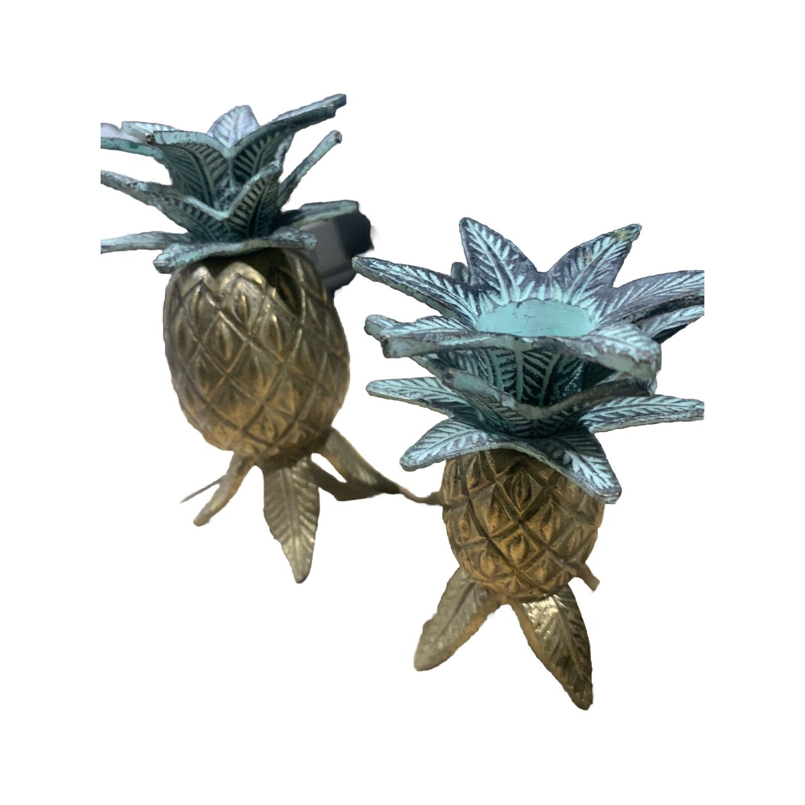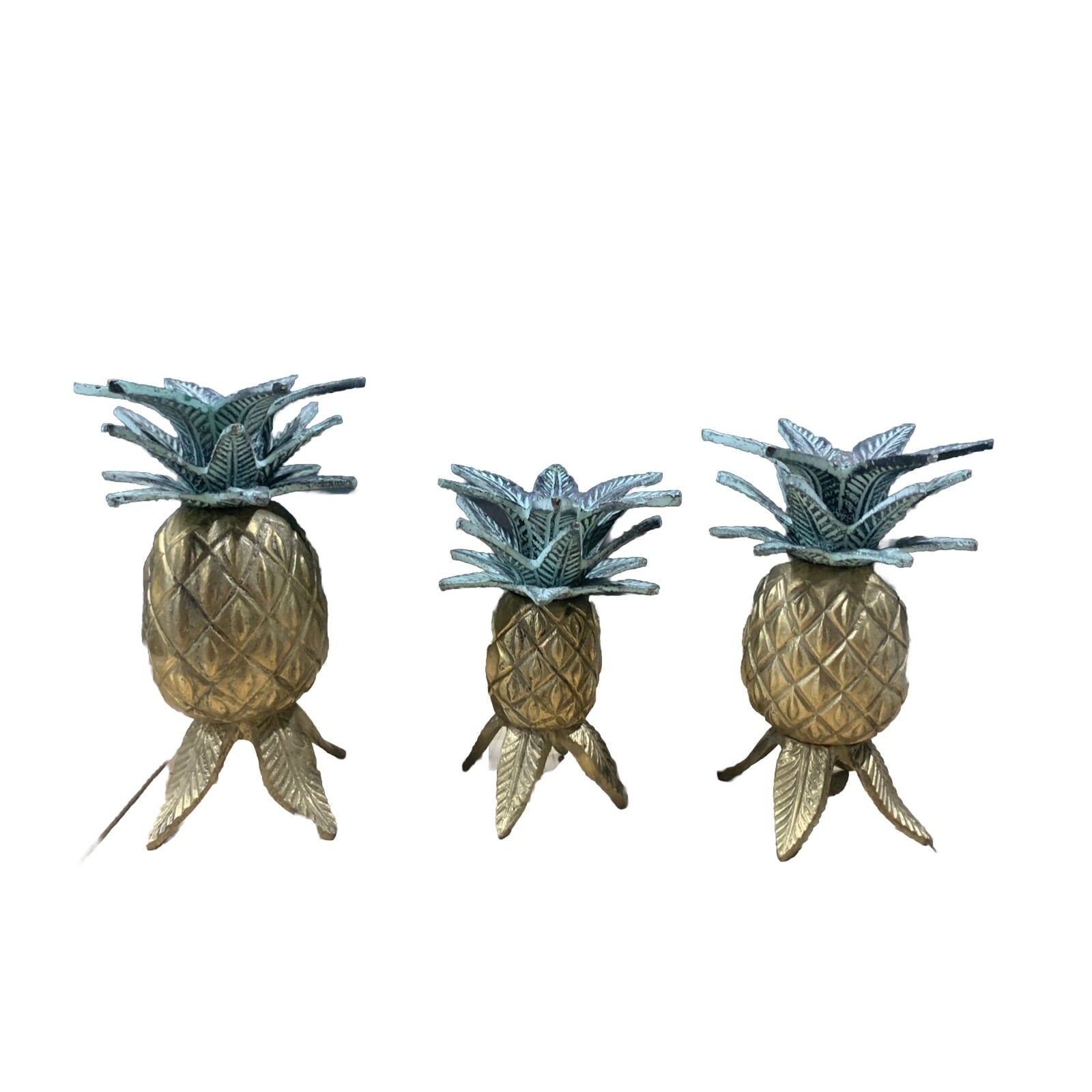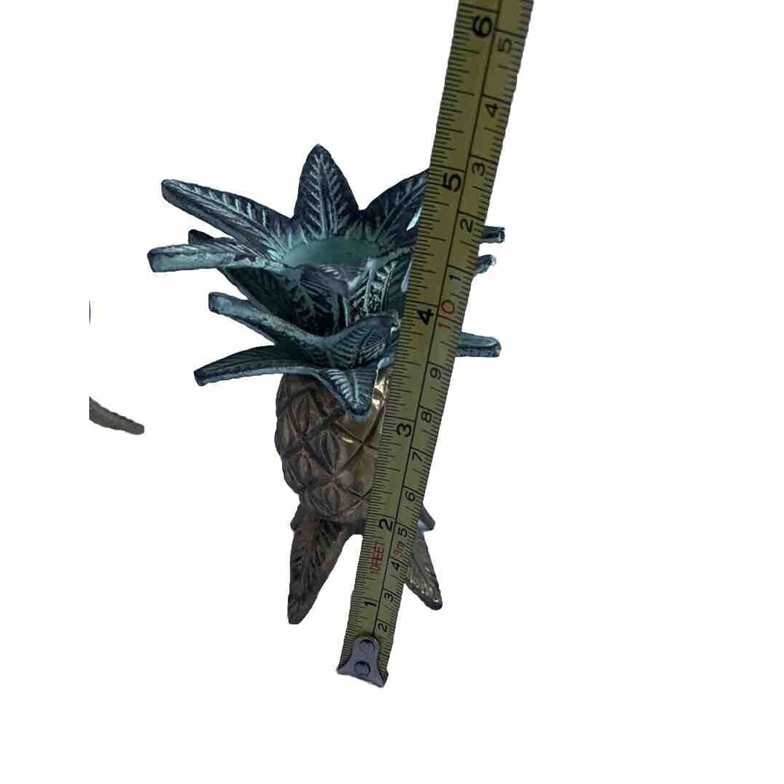 Add a touch of vintage charm to any room with this set of 3 antique brass pineapple candlestick holders. Measuring at 5.5 inches in length and 5 inches in height, they are suitable for candles and perfect for all occasions. The pineapple pattern brings a textured 3D effect that will make them stand out in any décor style.