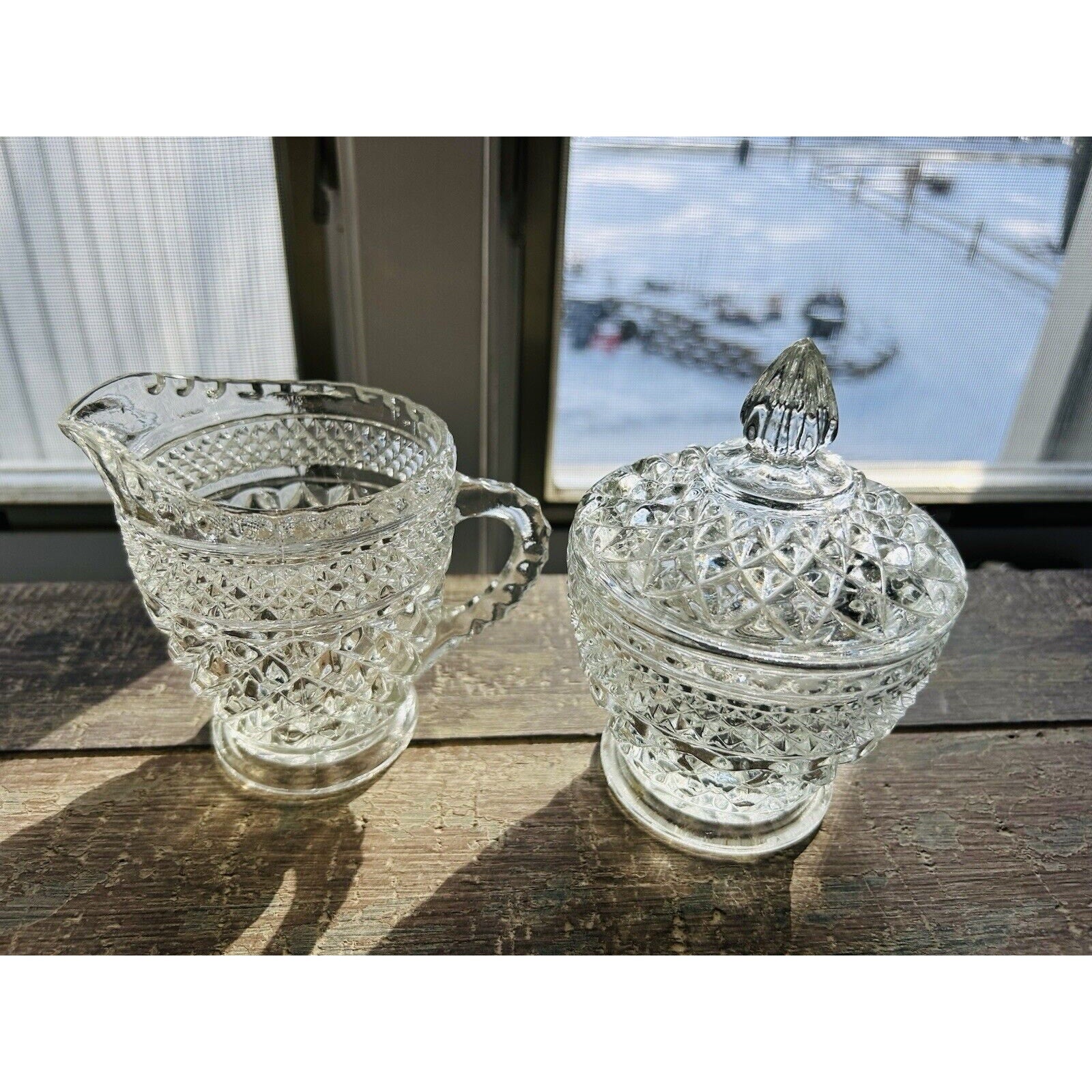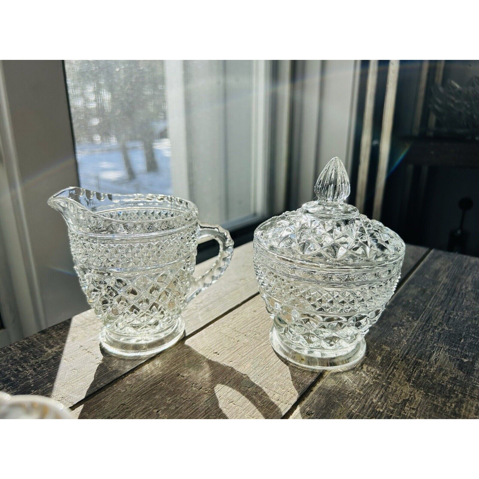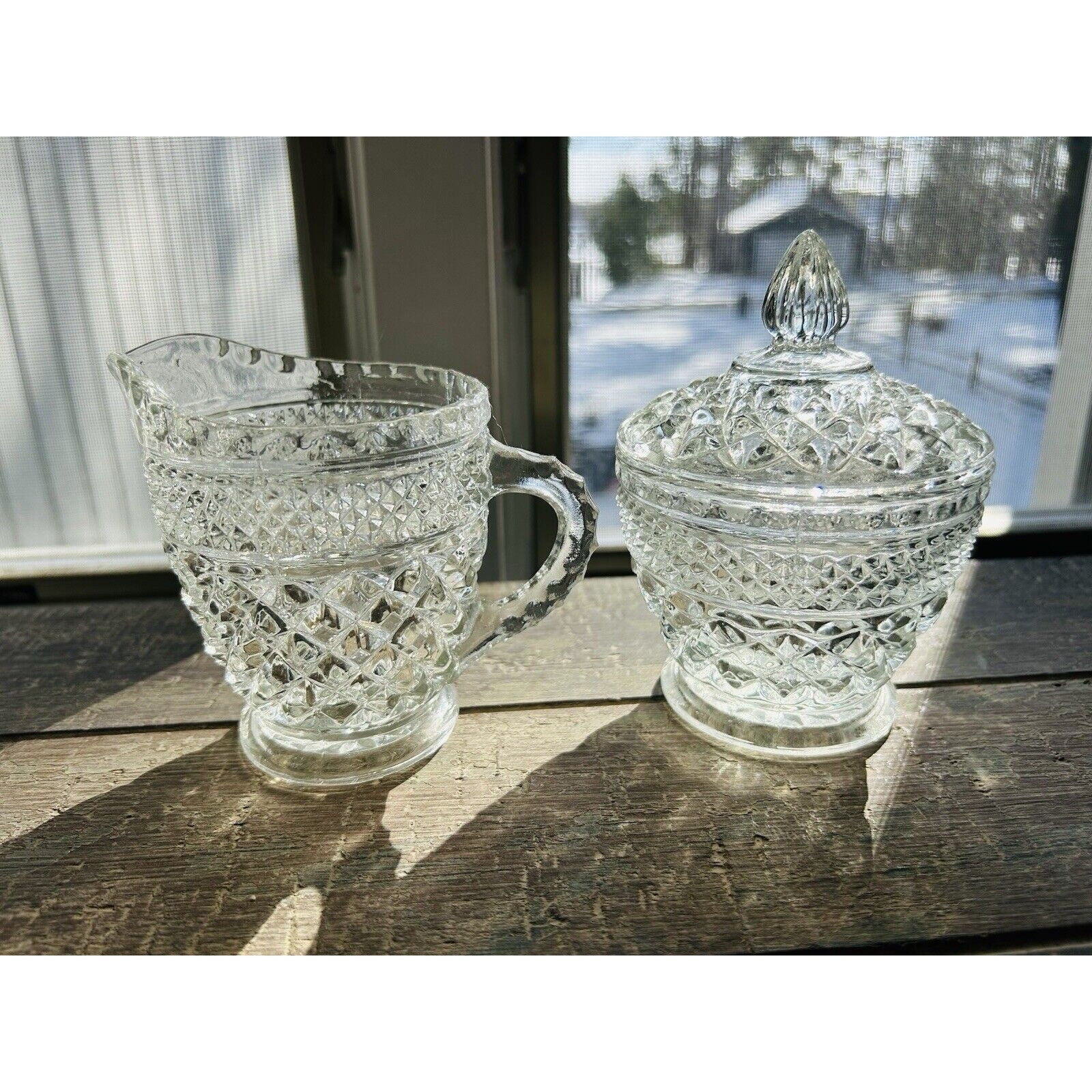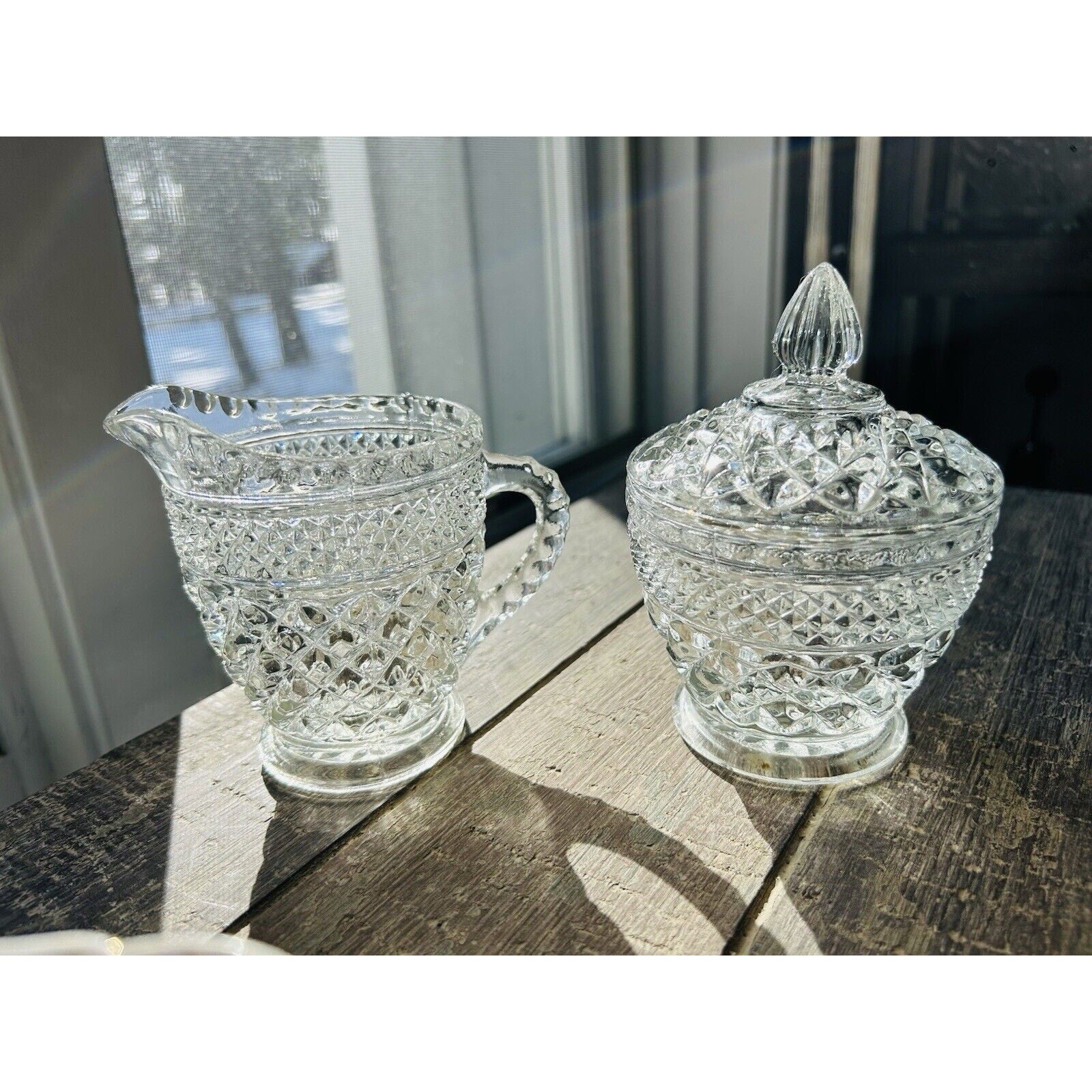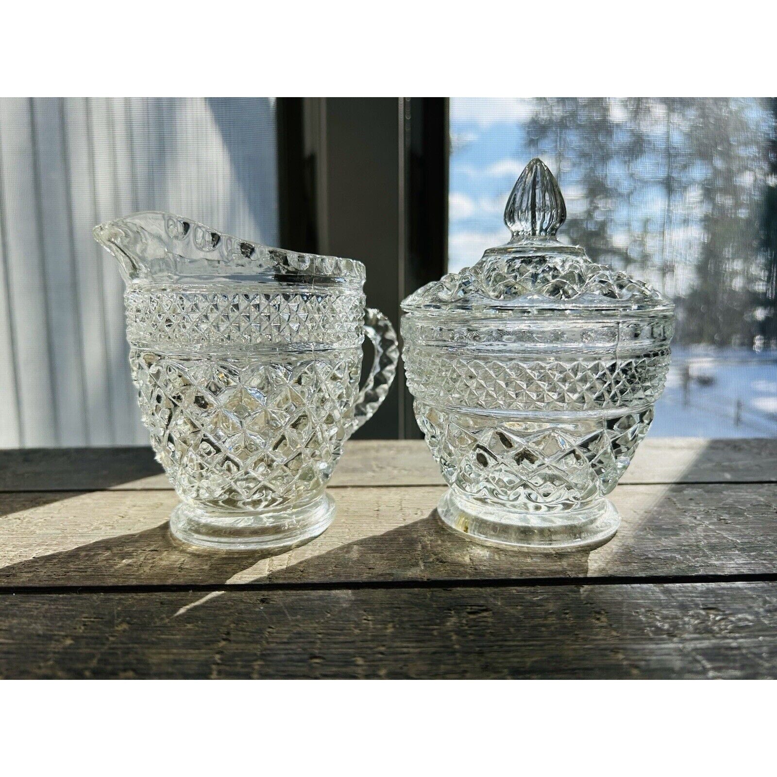 Anchor Hocking Wexford Crystal Clear Cut Glass Cream & Sugar Set Vintage