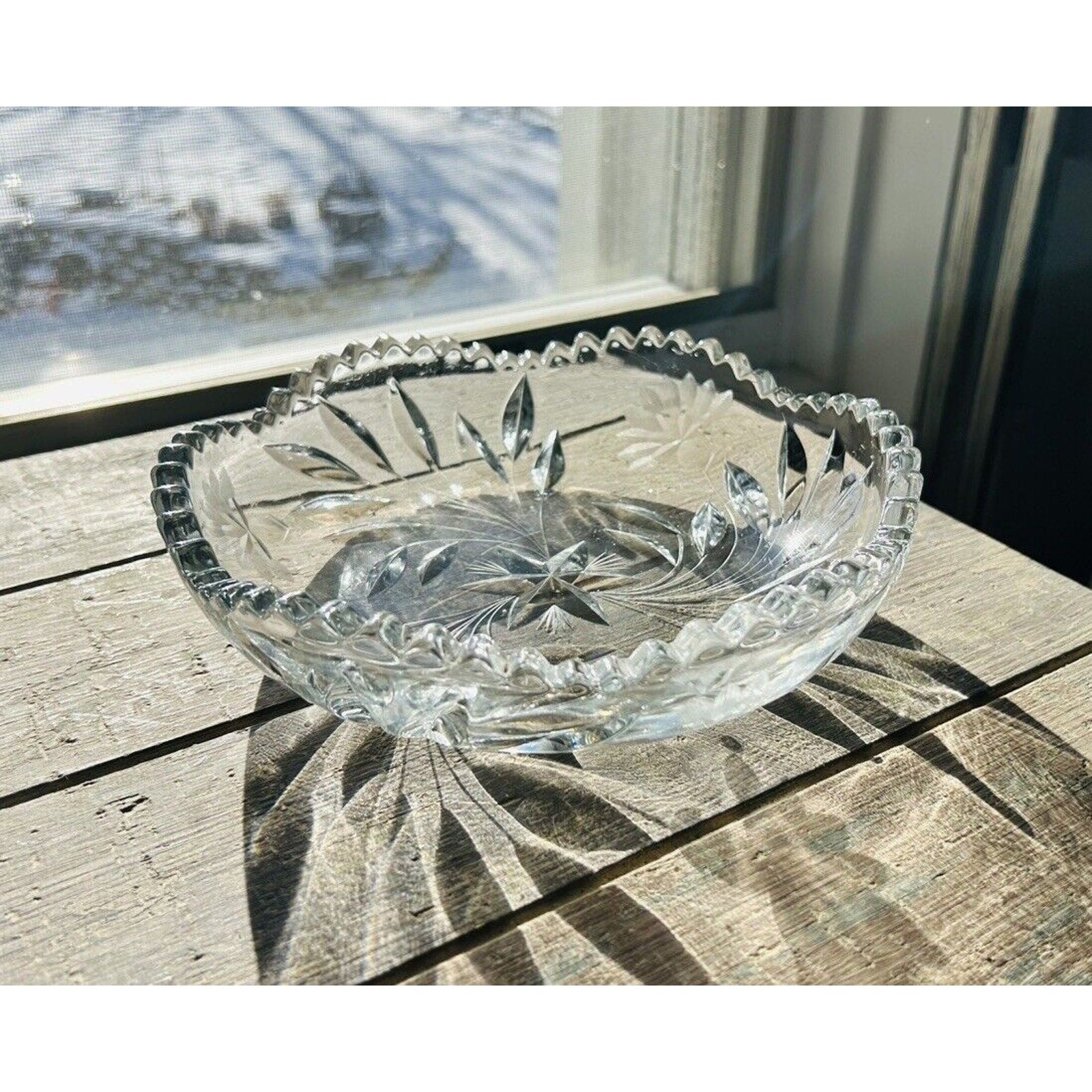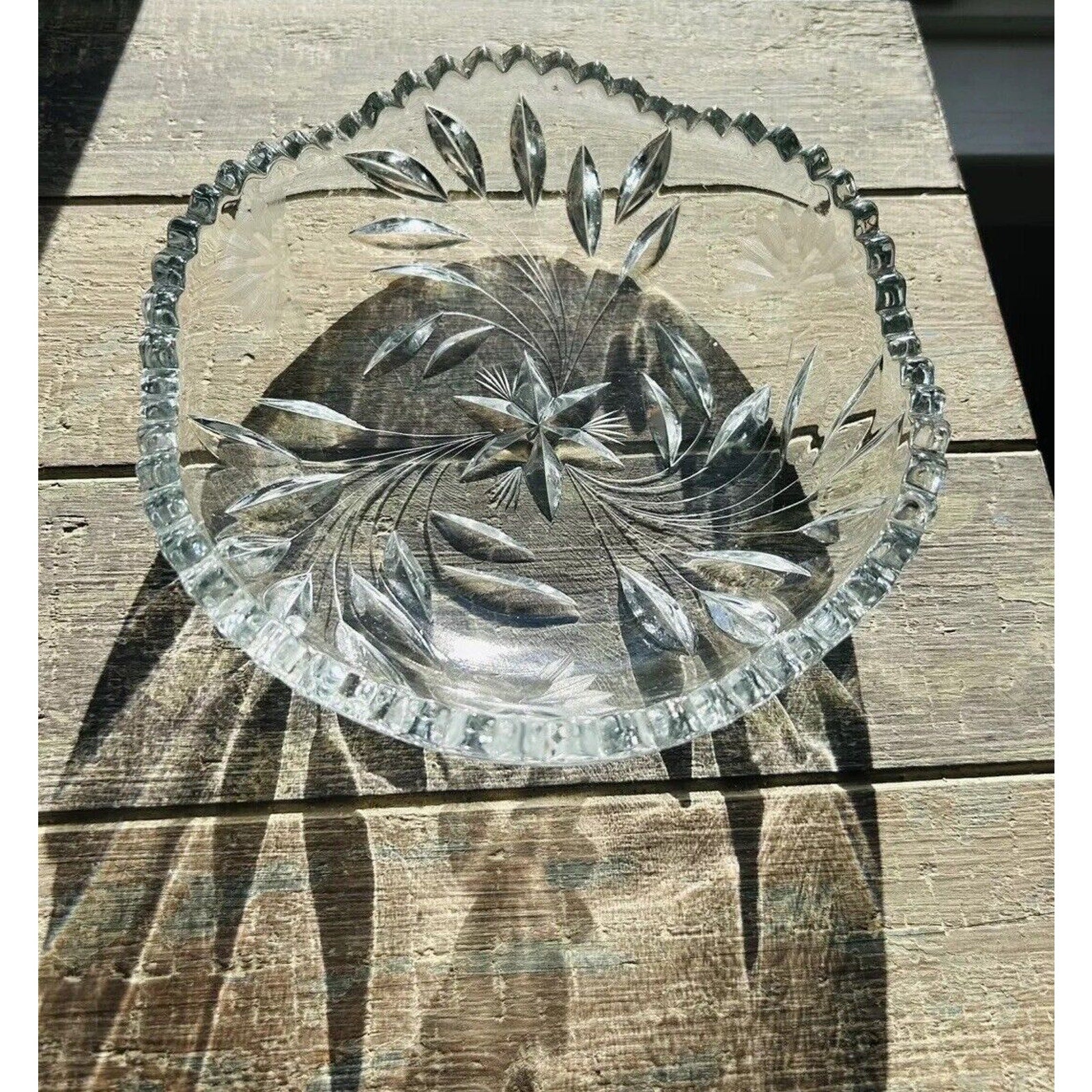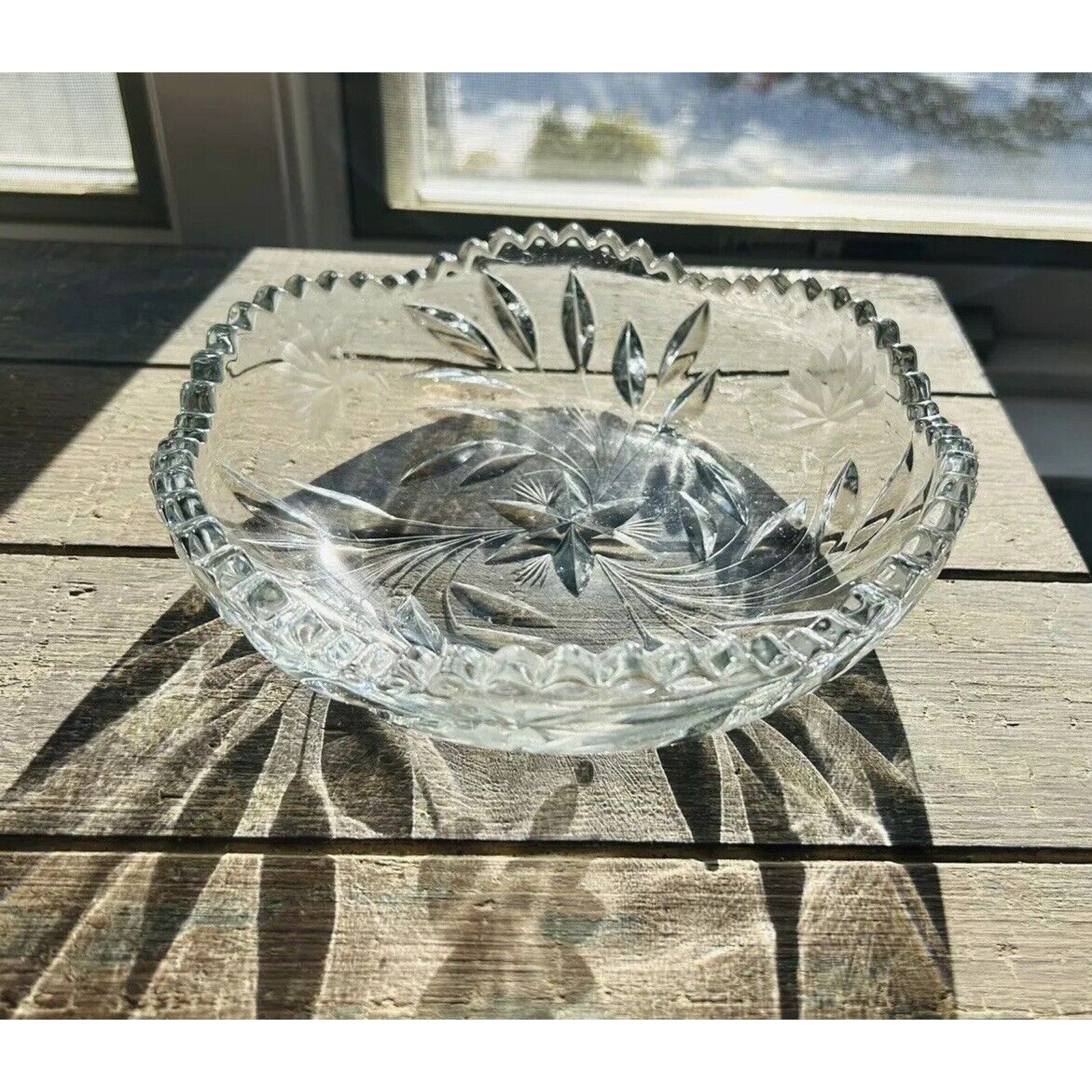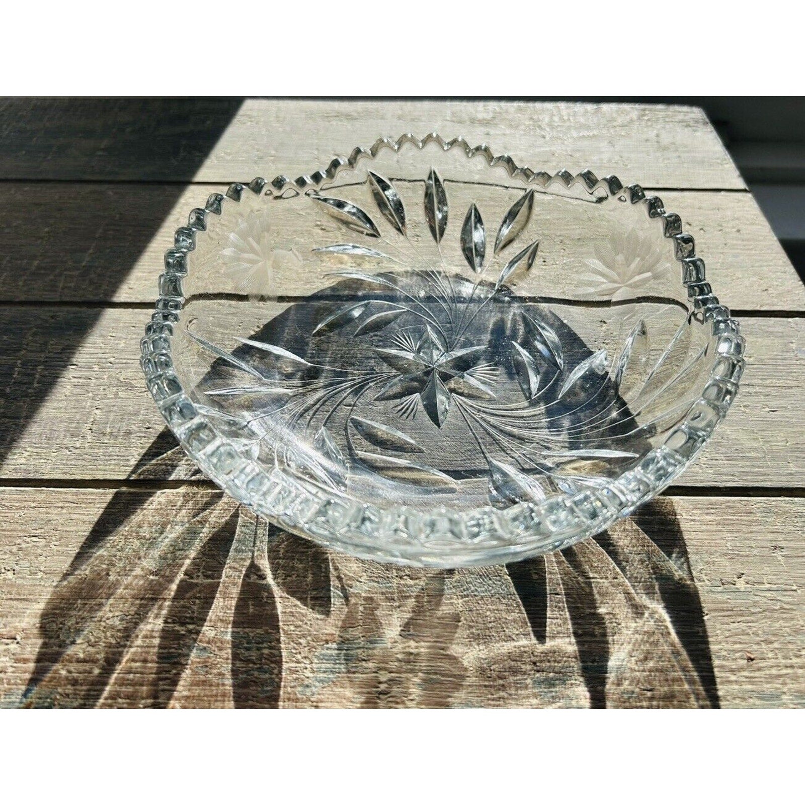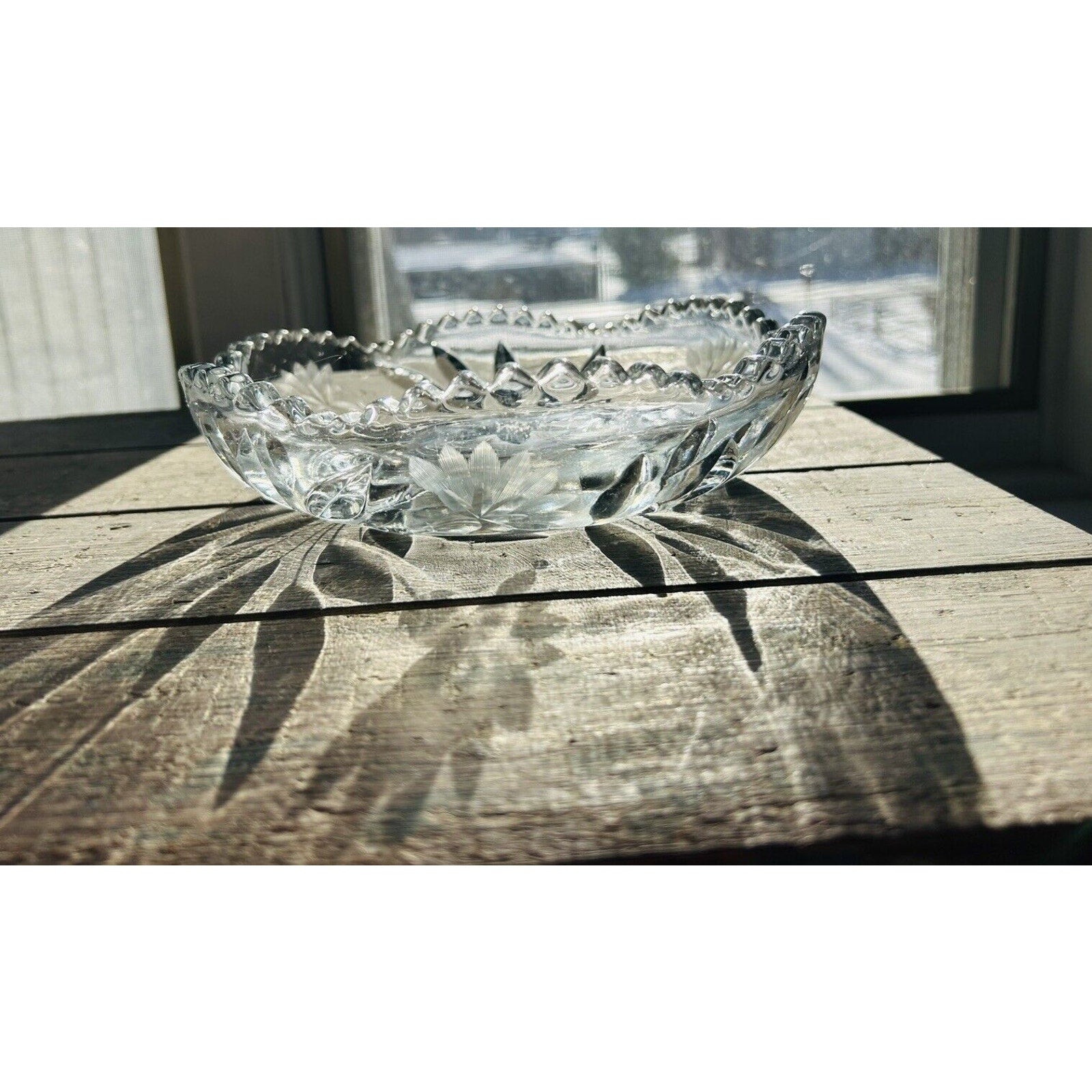 Excellent condition. Beautiful piece without any flaws. An Antique Edwardian Crystal Etched Clear Cut Glass Bowl Dish featuring a Flower theme. This round dish has a diameter of 8.5” and a height of 2.5”. It was manufactured in the 1900s-1910s, weighs 2 pounds 12 ounces, and showcases intricate etched detailing. With a vintage appeal, this unmarked piece exudes Edwardian style and is a stunning example of early 20th-century glass craftsmanship.