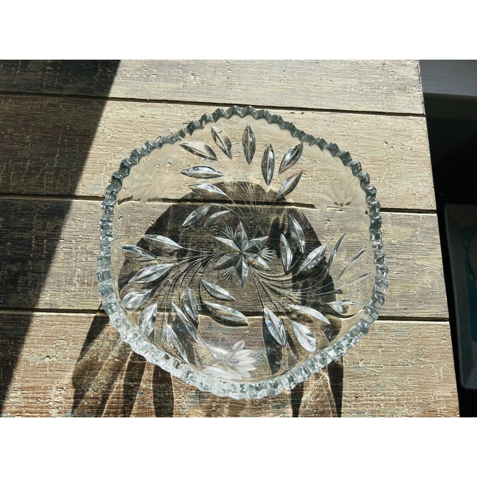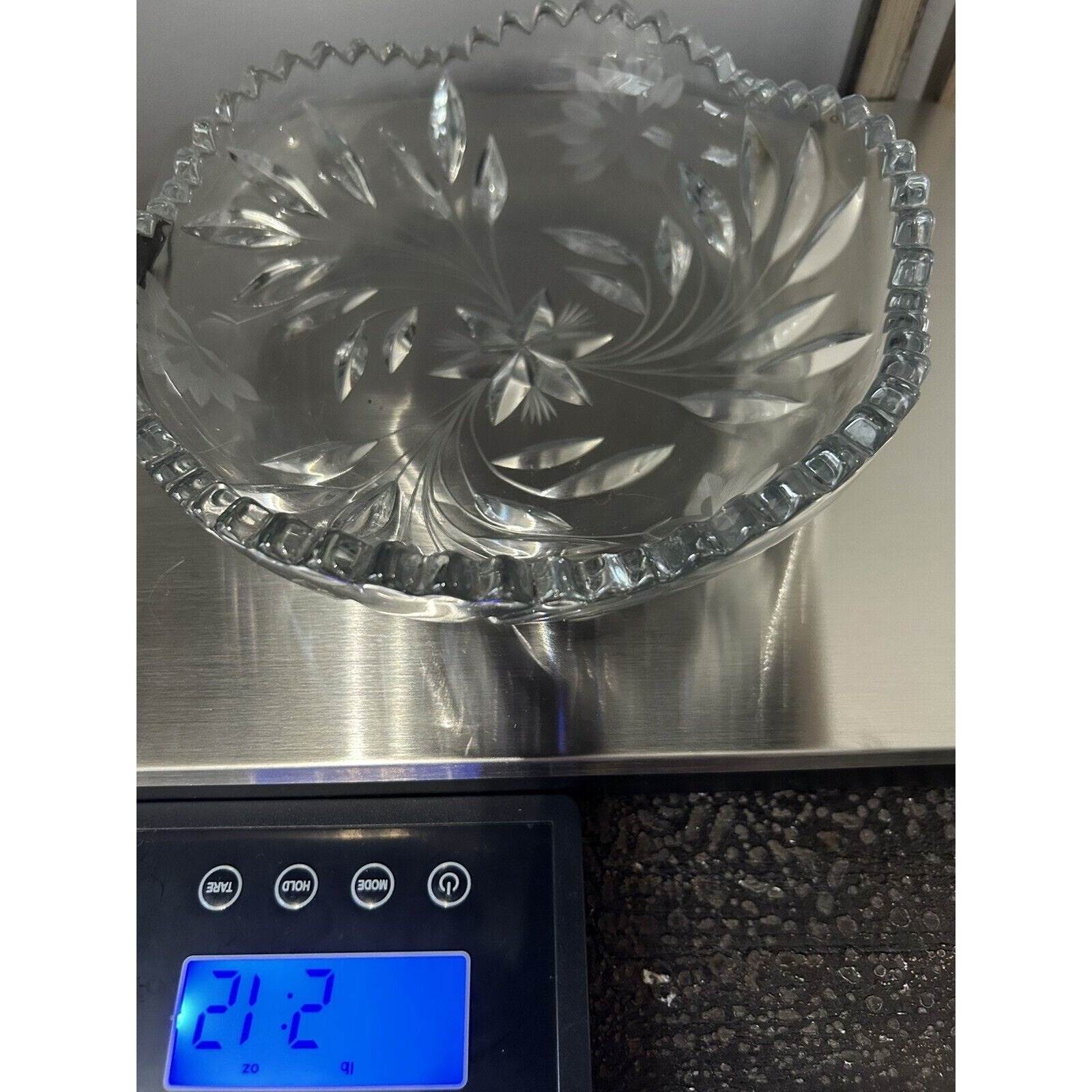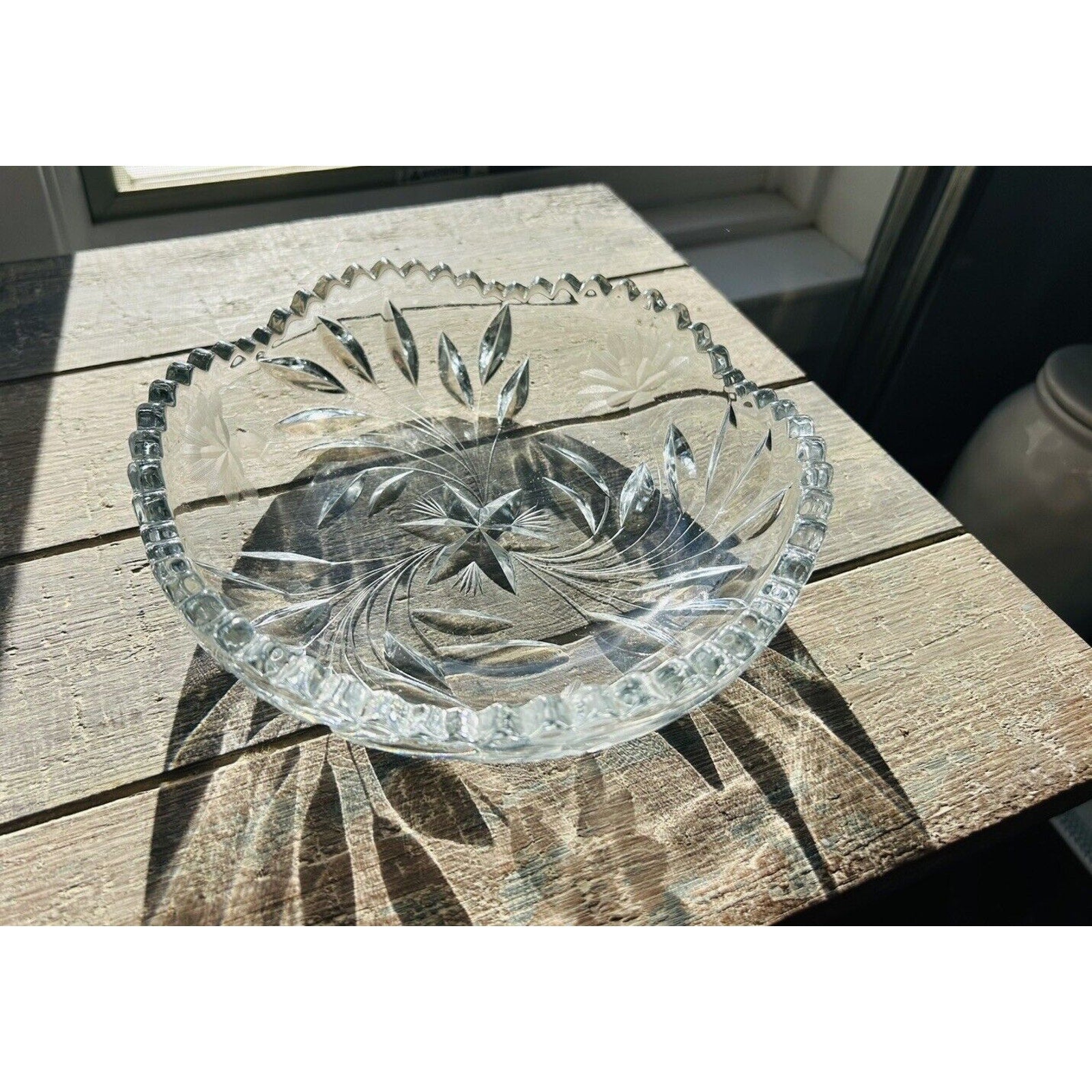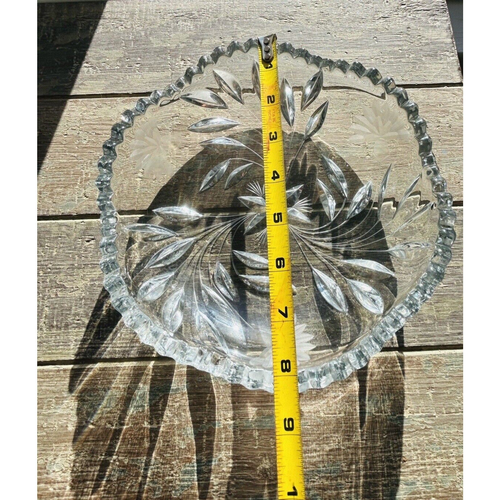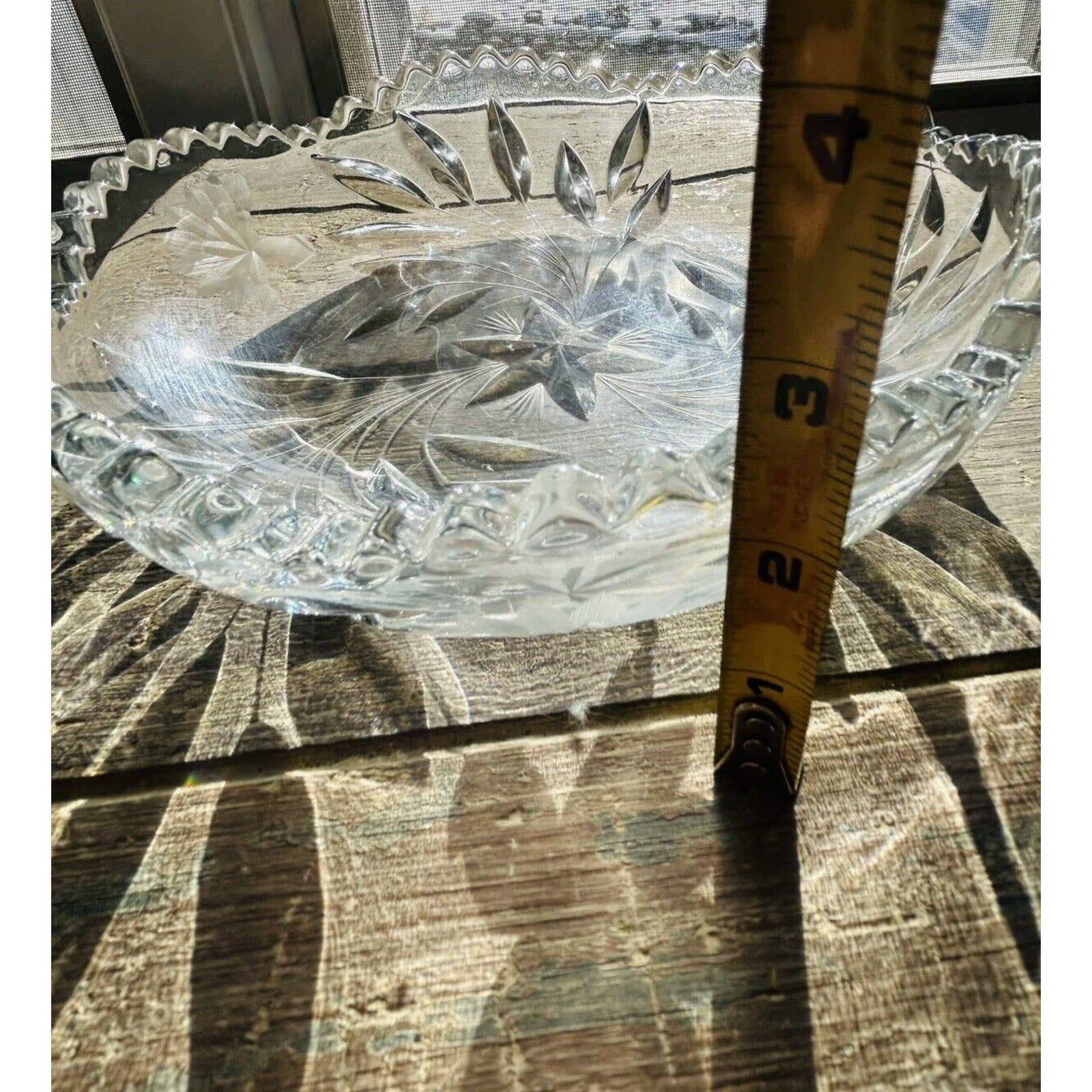 Excellent condition. Beautiful piece without any flaws. An Antique Edwardian Crystal Etched Clear Cut Glass Bowl Dish featuring a Flower theme. This round dish has a diameter of 8.5” and a height of 2.5”. It was manufactured in the 1900s-1910s, weighs 2 pounds 12 ounces, and showcases intricate etched detailing. With a vintage appeal, this unmarked piece exudes Edwardian style and is a stunning example of early 20th-century glass craftsmanship.