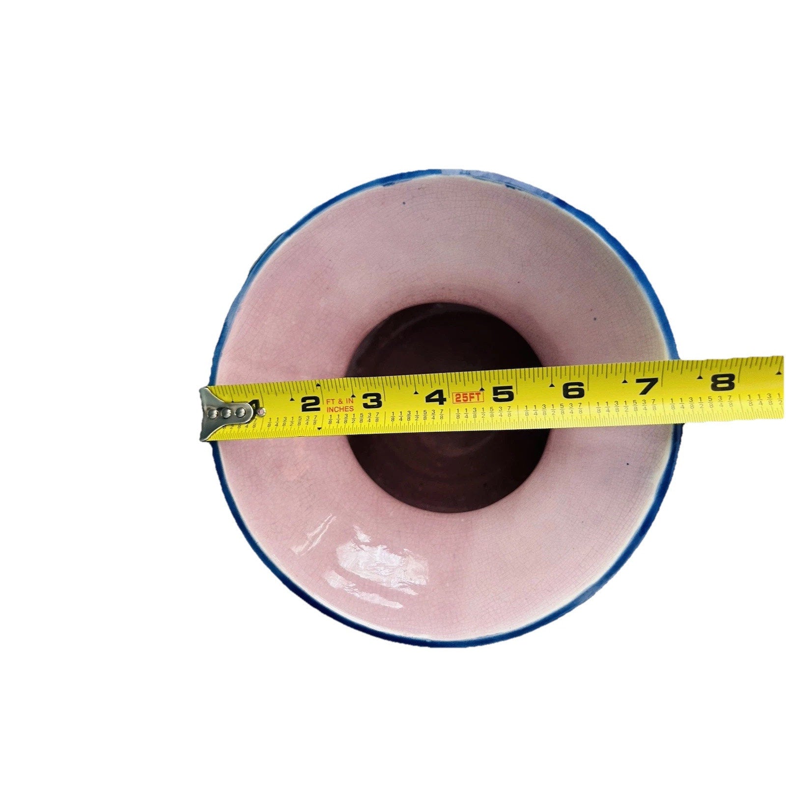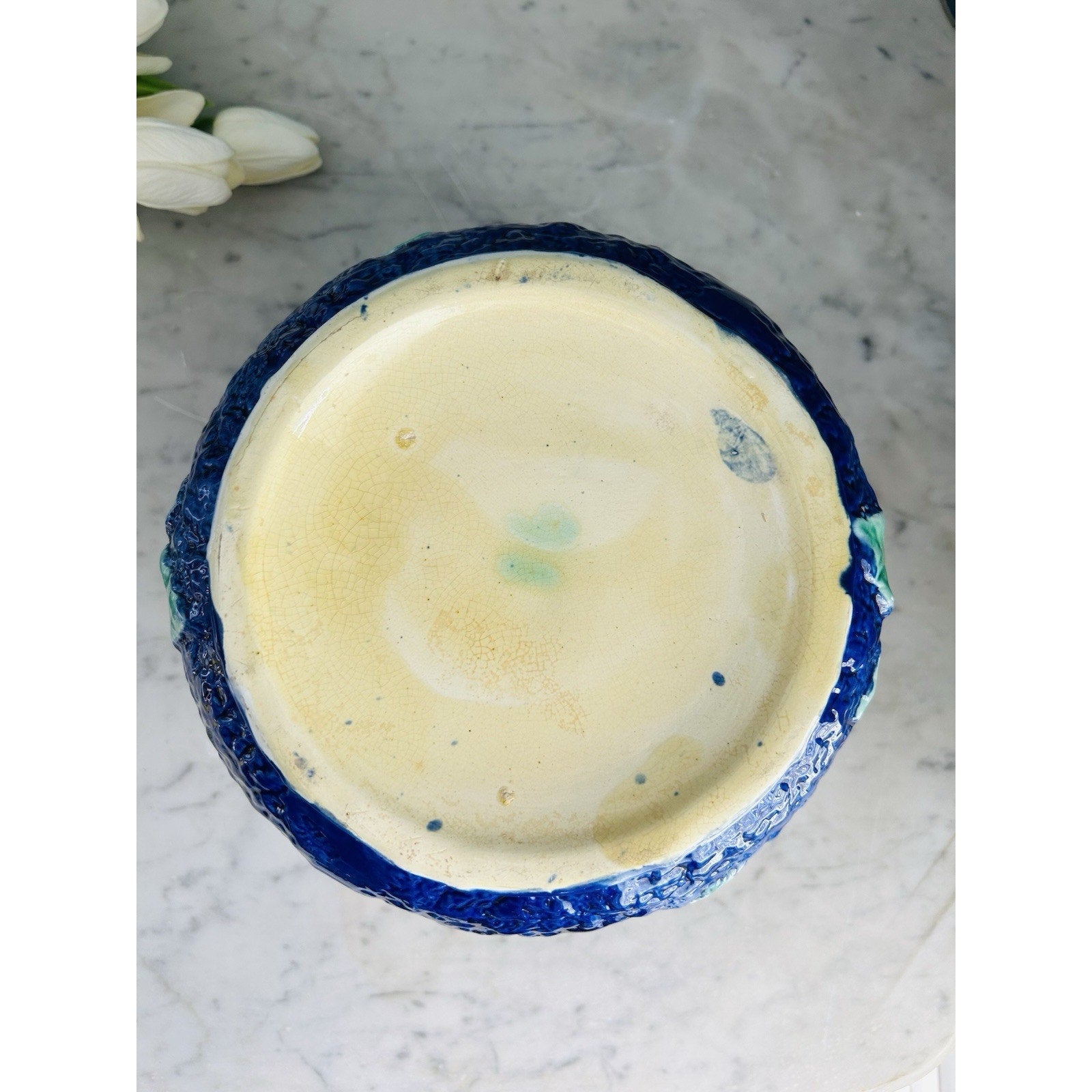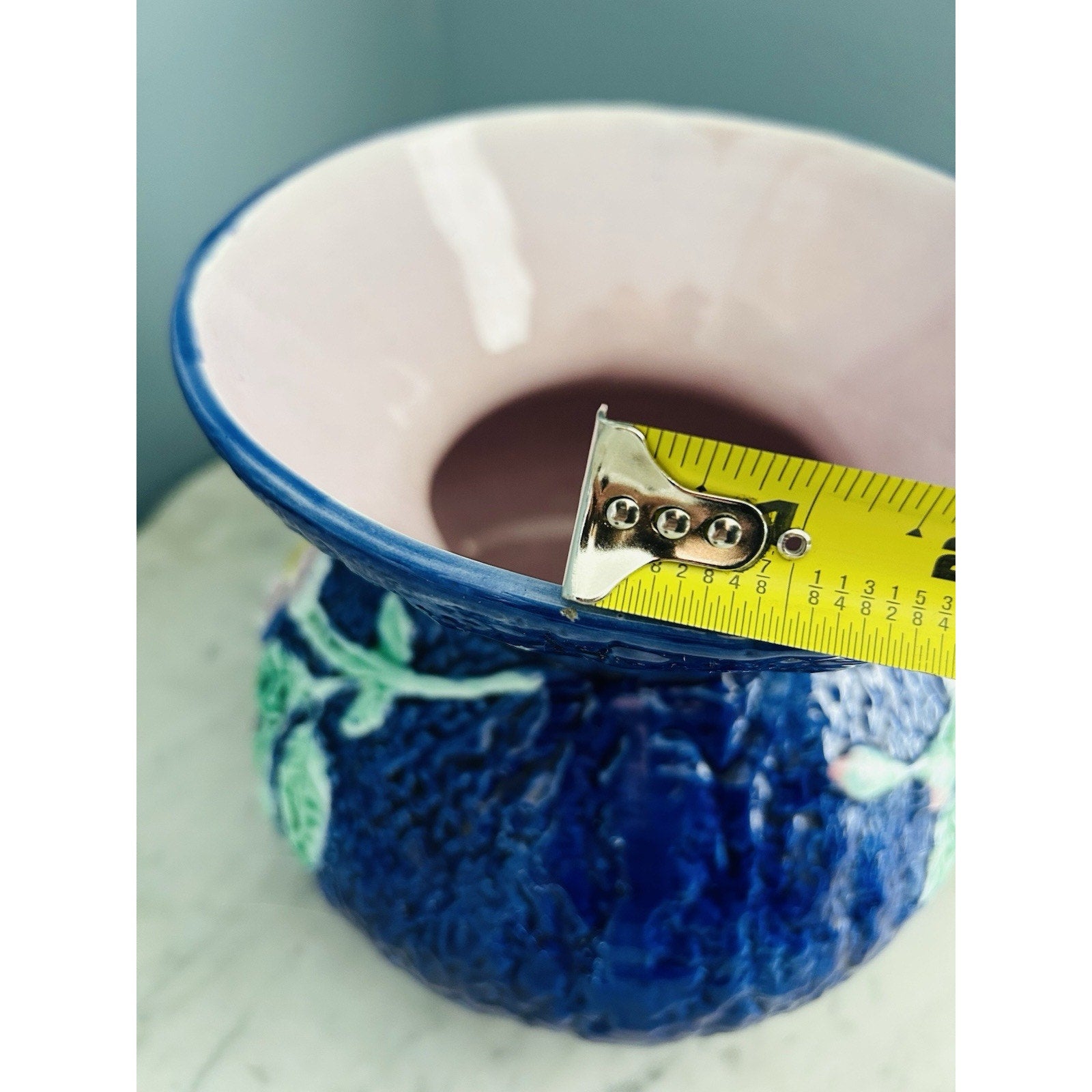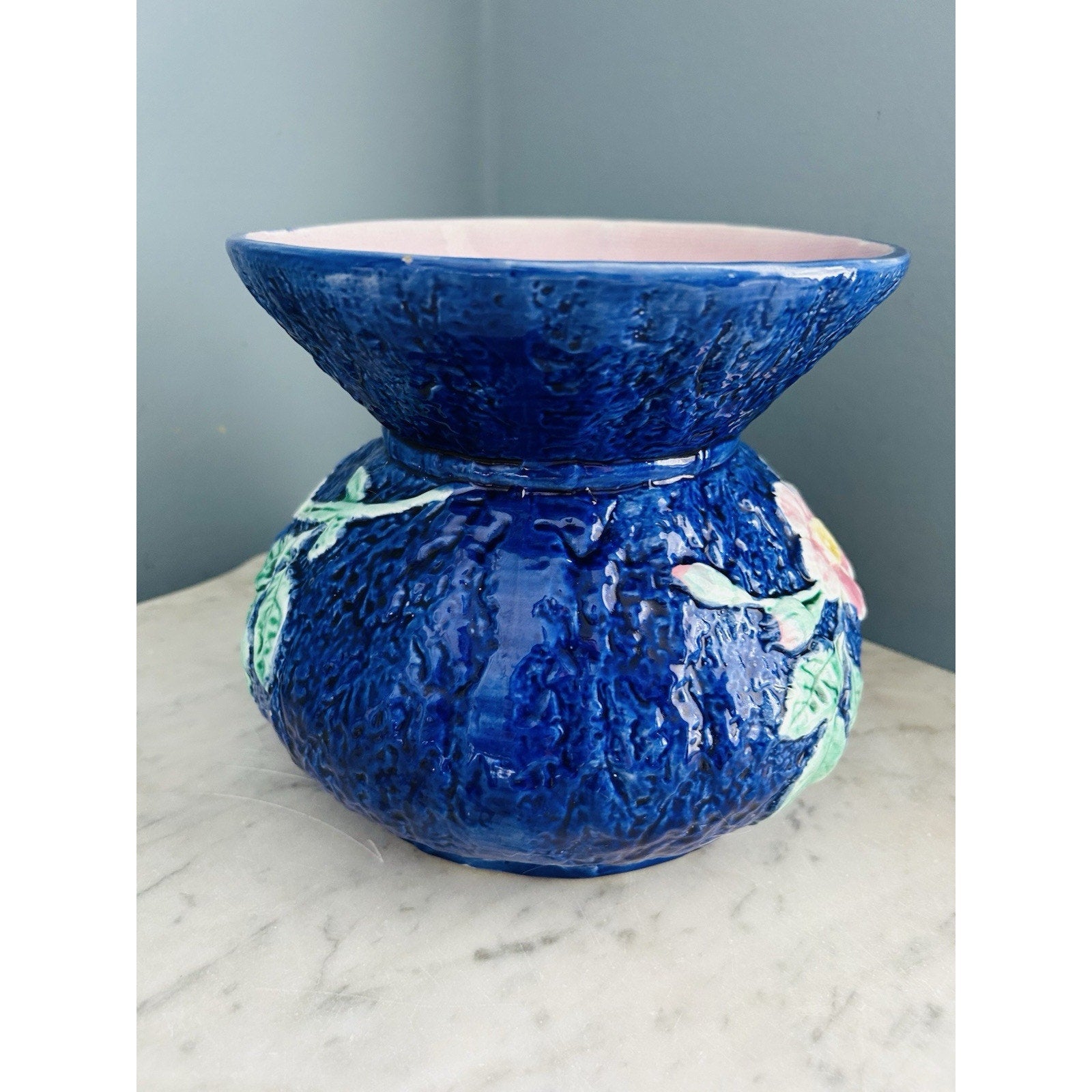 Antique Wild Rose Majolica Cupsidor 19th Century Squat Vase Home Decor Blue Pink