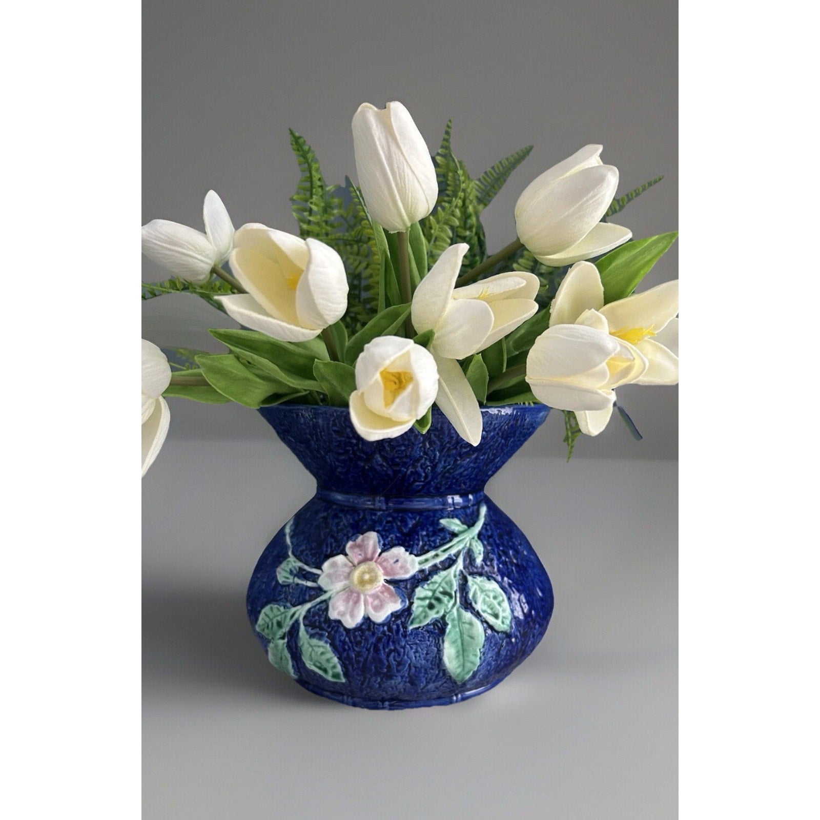 An Antique Wild Rose Majolica Cupsidor vase from the 19th century. This Edwardian era decorative piece features a floral pattern in blue and pink colors. With an antique look and a squat shape, this vase would make a charming addition to any home decor. Gorgeous piece!
