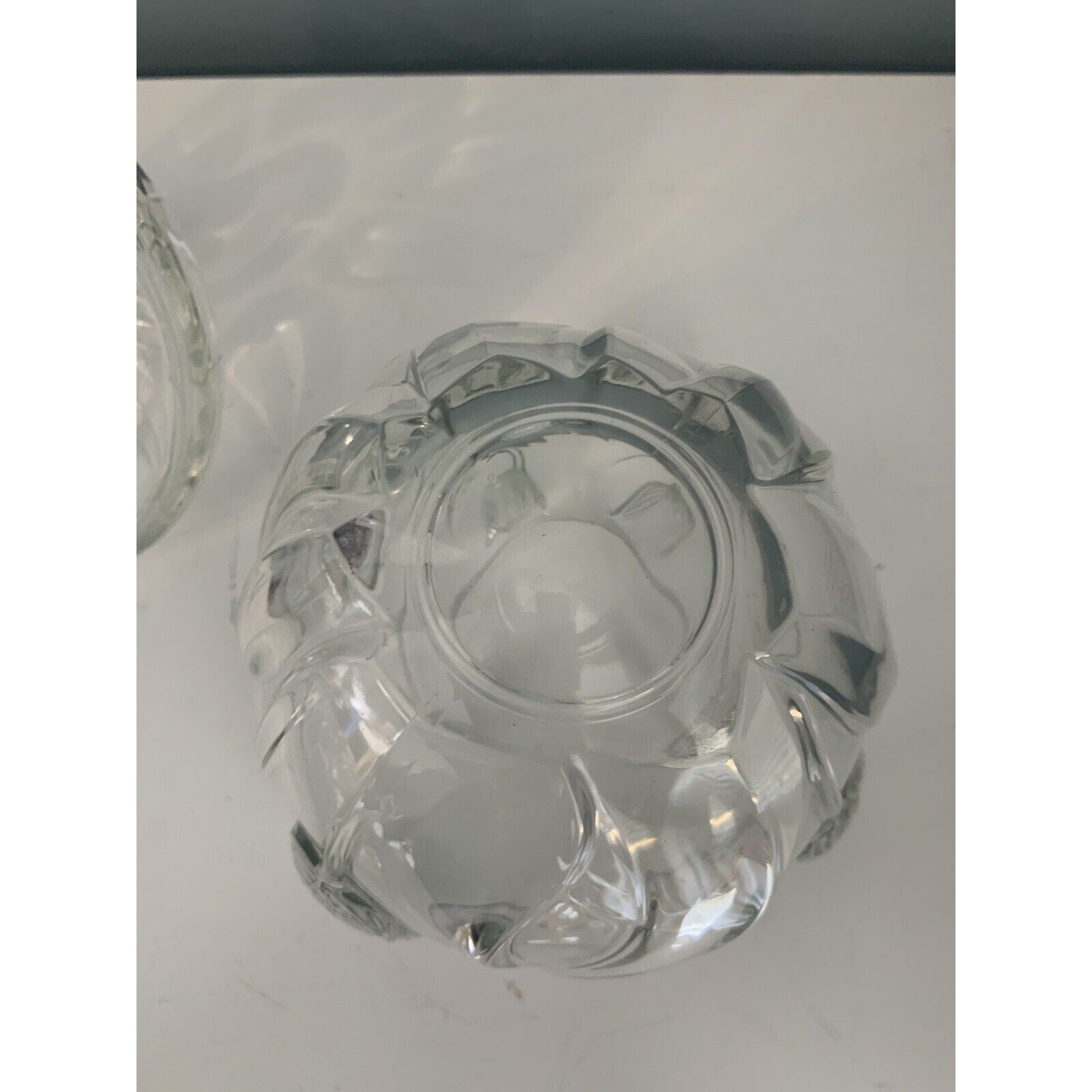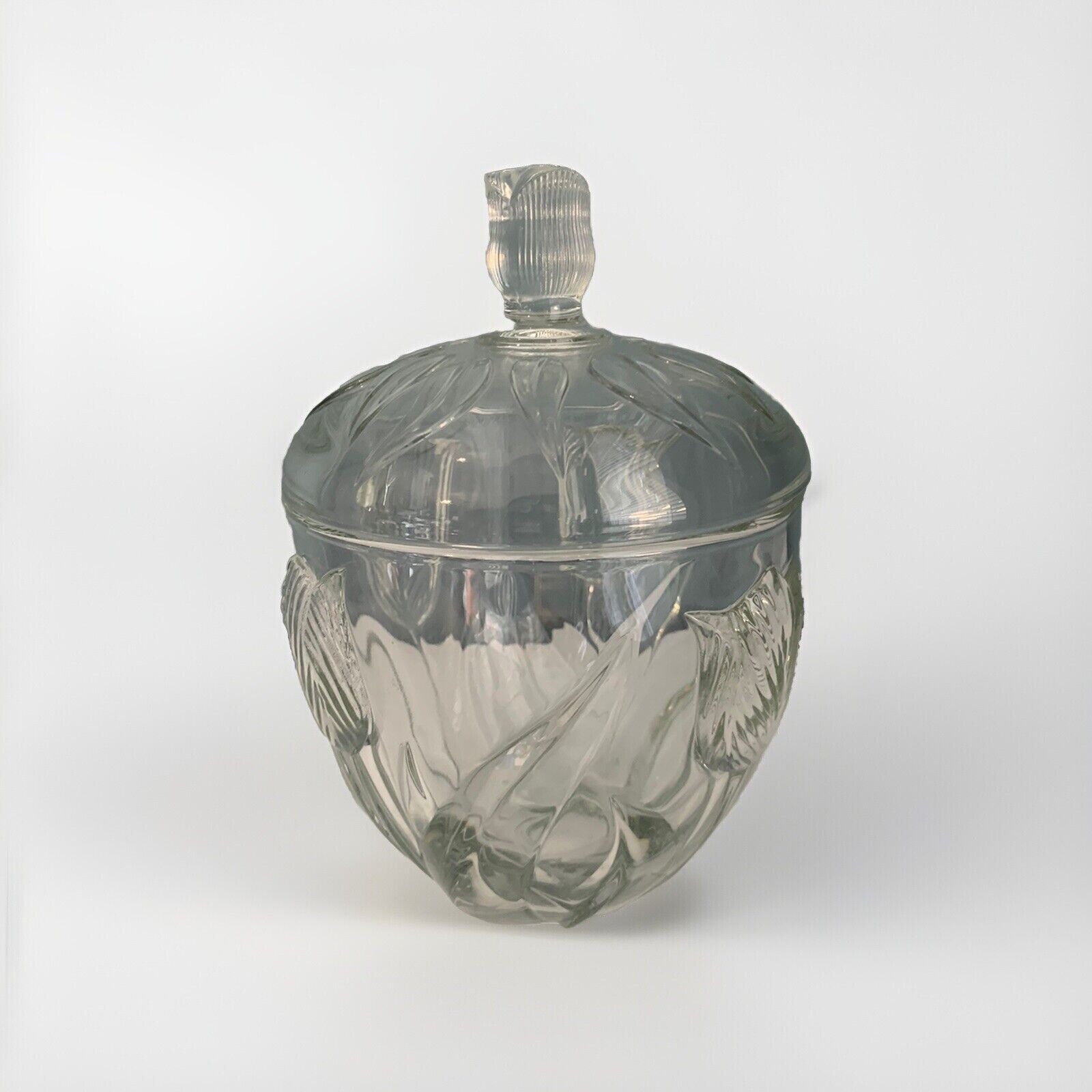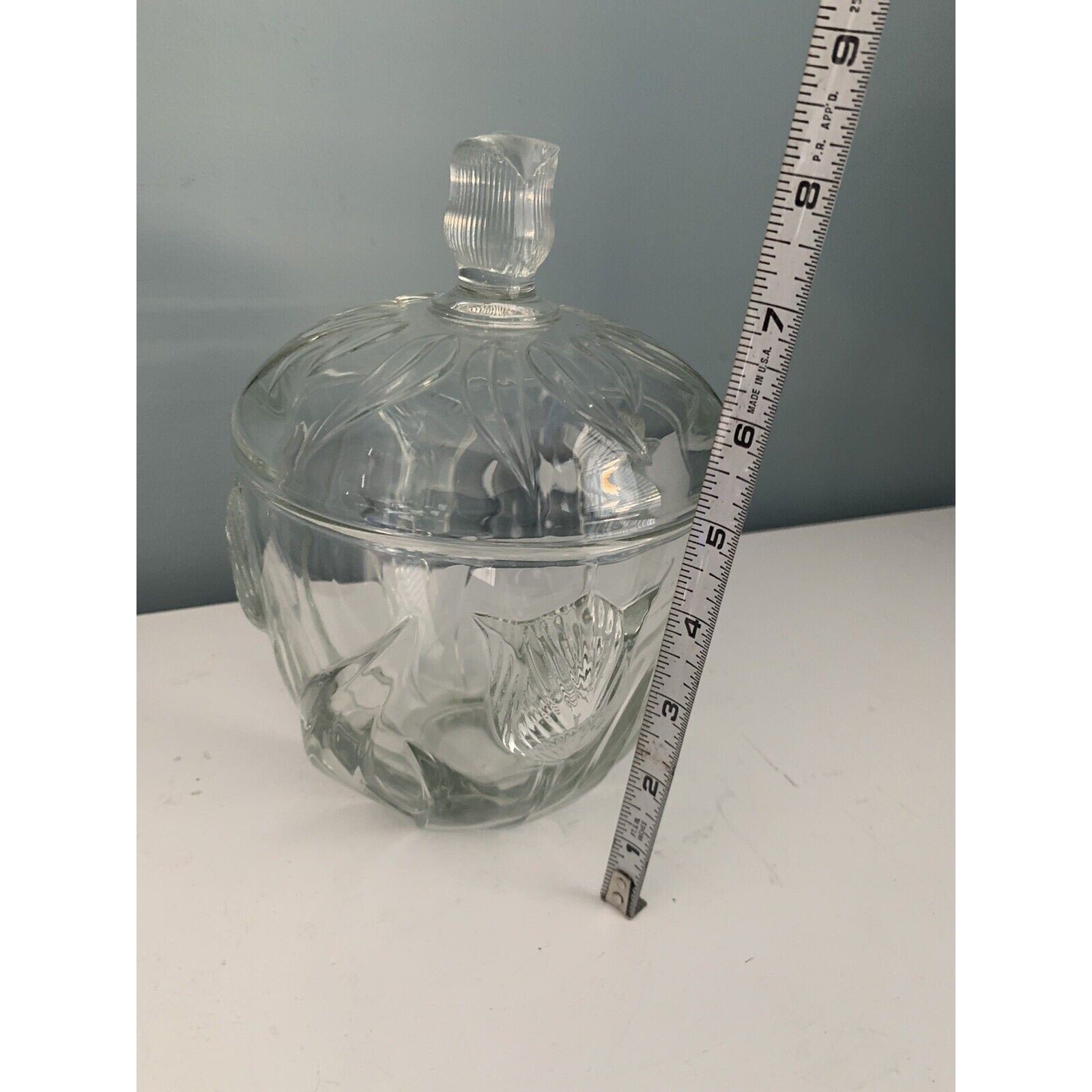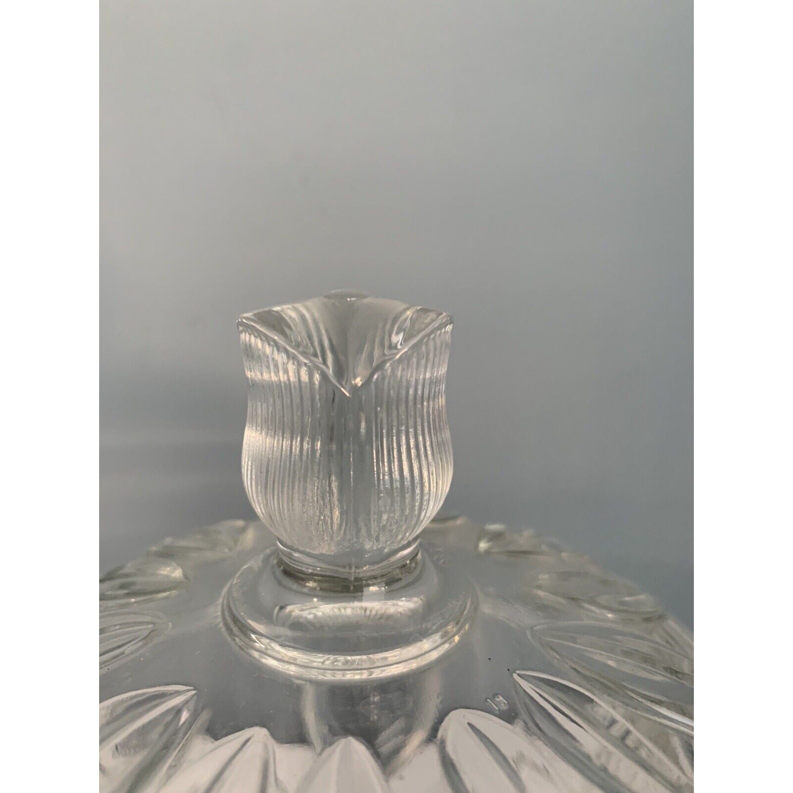 The candy dish is vintage and original, with a production style that is cut glass. It has a lid included and is perfect for storing candies, biscuits, or any other small items. The item diameter is 5.5 inches, and the item depth is 4 6/8 inches. The dish is unmarked, and the model is a lid. The theme is tulips, and the color is clear. This candy dish is a great addition to any collection and is sure to impress.