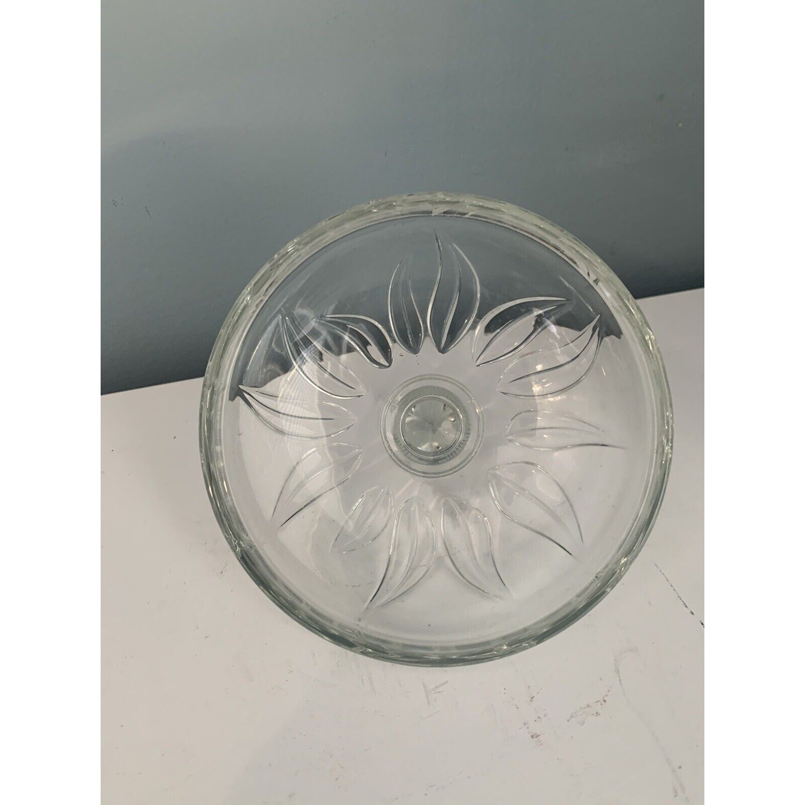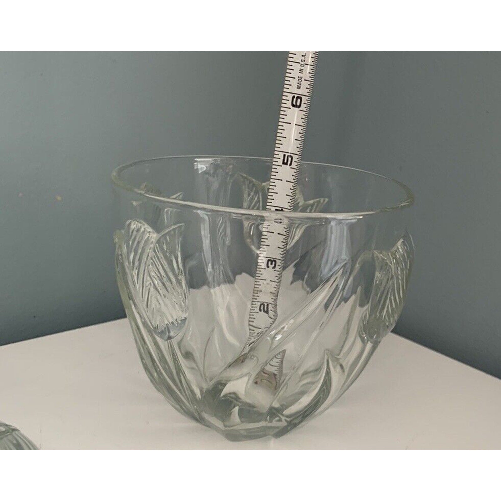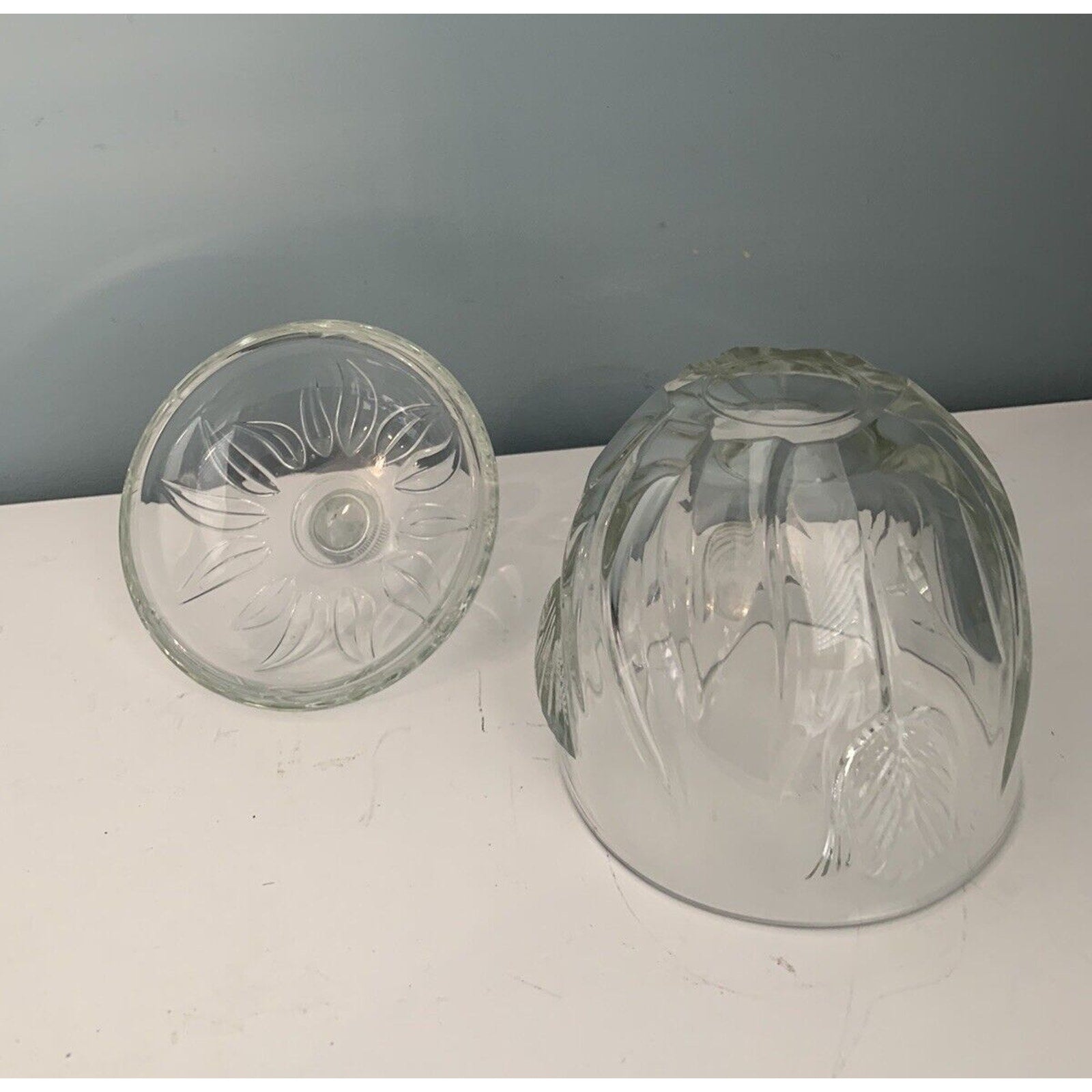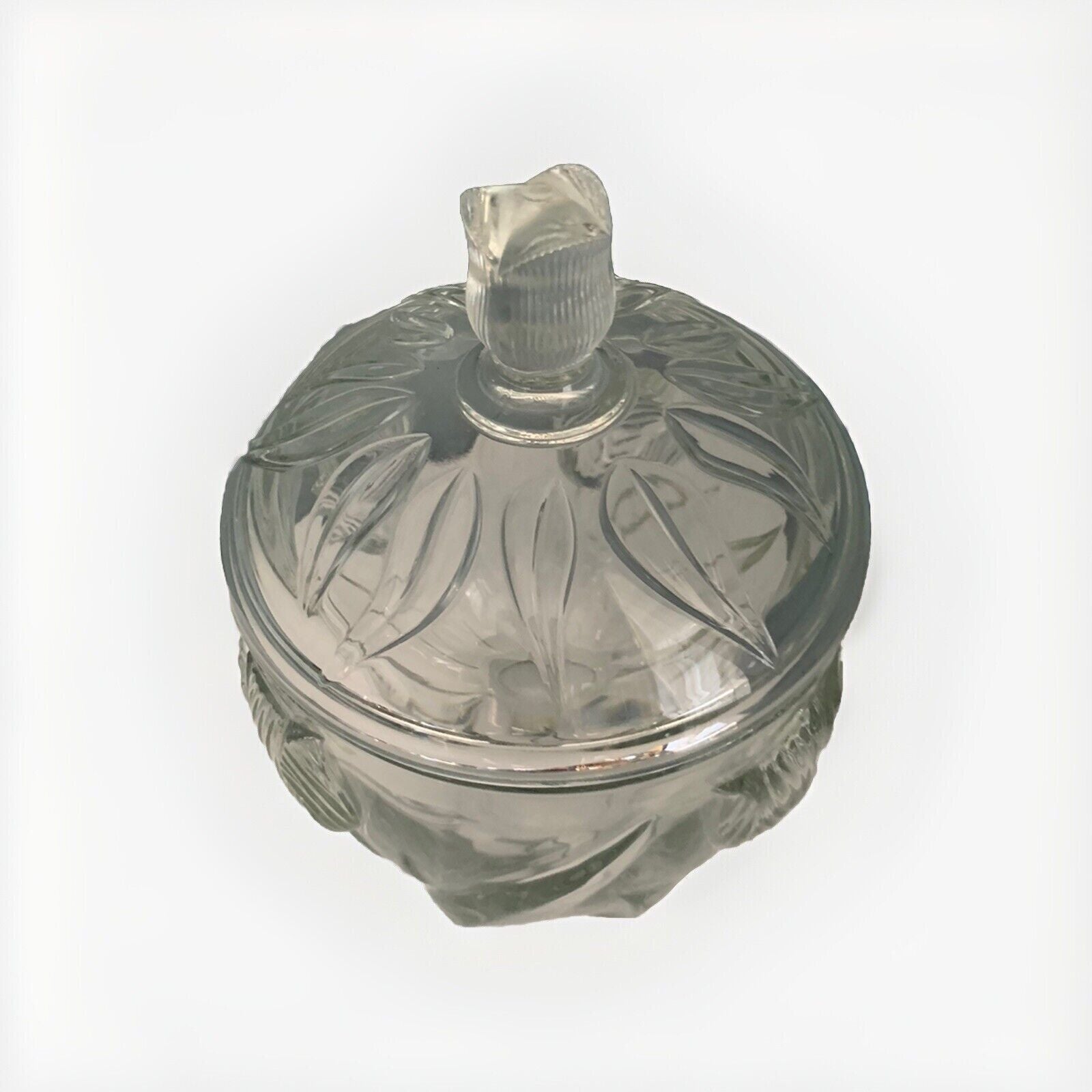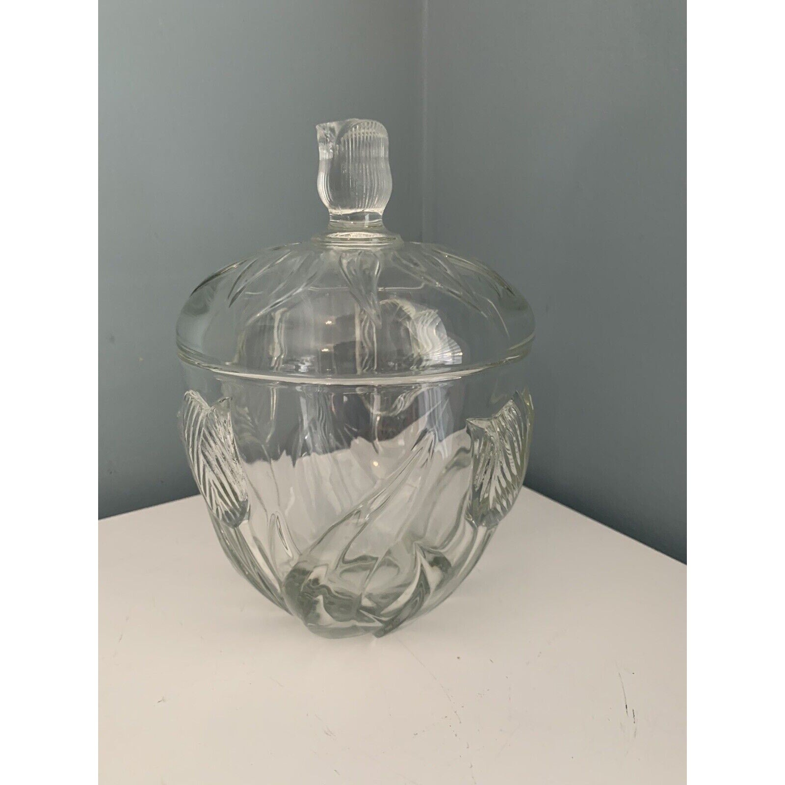 The candy dish is vintage and original, with a production style that is cut glass. It has a lid included and is perfect for storing candies, biscuits, or any other small items. The item diameter is 5.5 inches, and the item depth is 4 6/8 inches. The dish is unmarked, and the model is a lid. The theme is tulips, and the color is clear. This candy dish is a great addition to any collection and is sure to impress.