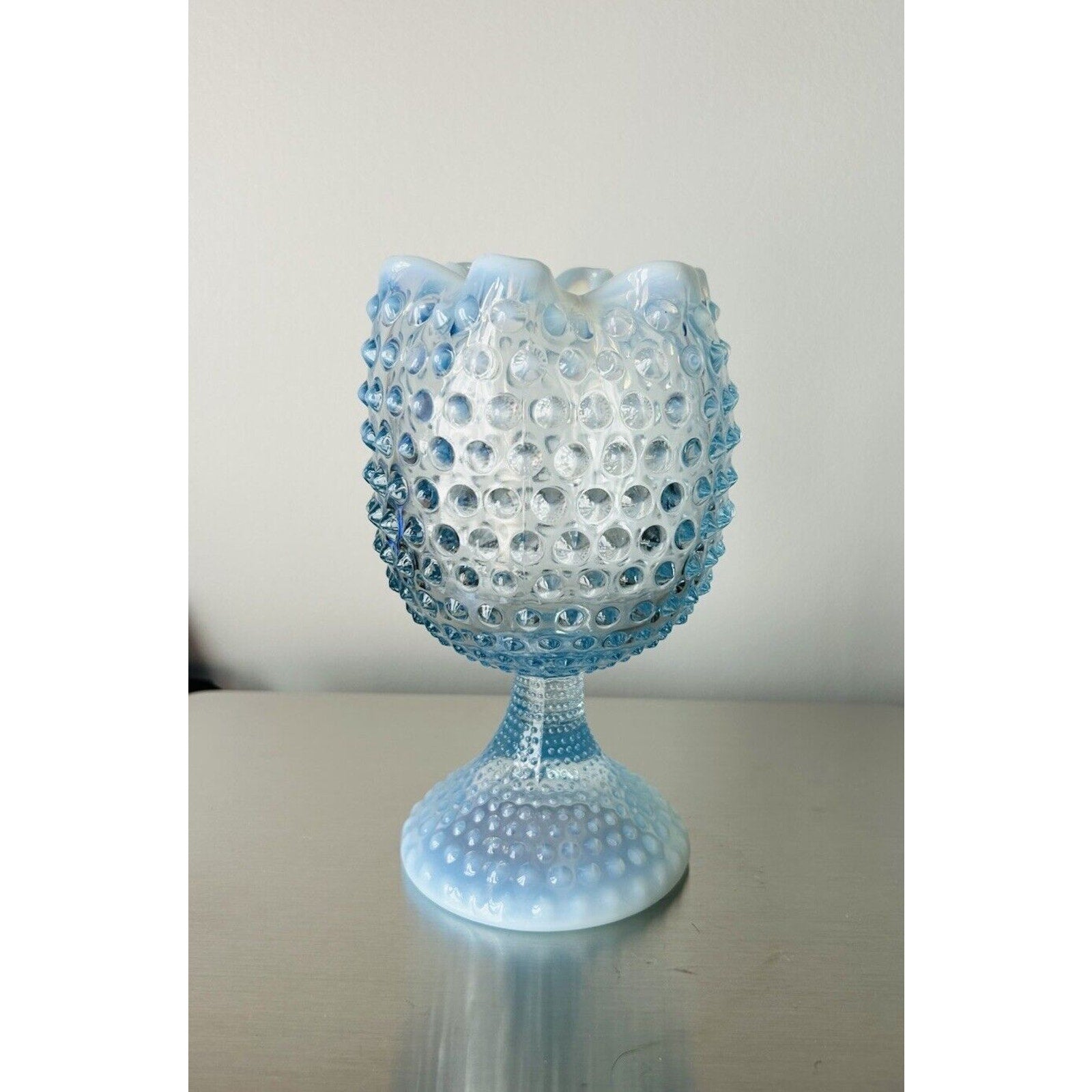 EUC Duncan Miller Blue Opalescent Glass Footed Hobnail Vase Ruffle Crimped