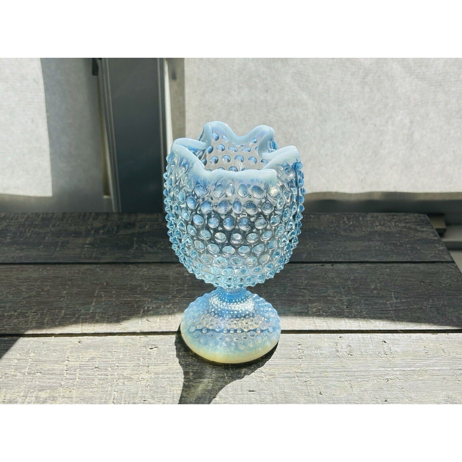 Excellent Used Condition (EUC). This is a vintage Duncan Miller Blue Opalescent Glass Vase with a ruffled and crimped design. It stands at 6.5 inches tall and is made of glass. The vase features a hobnail pattern and a footed base. It is from the Mid 20th Century and was produced in the United States. This decorative piece weighs 1 pound and 7 ounces, with a width of 3.5 inches.
