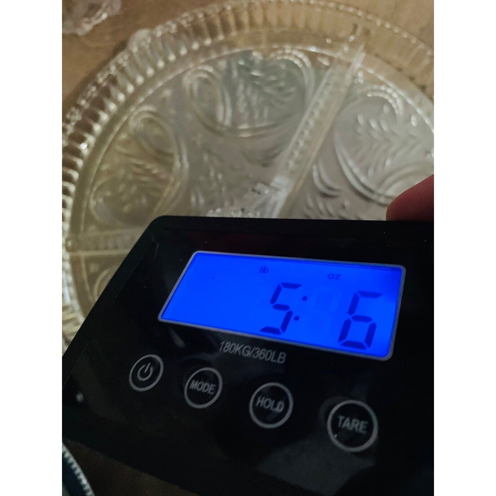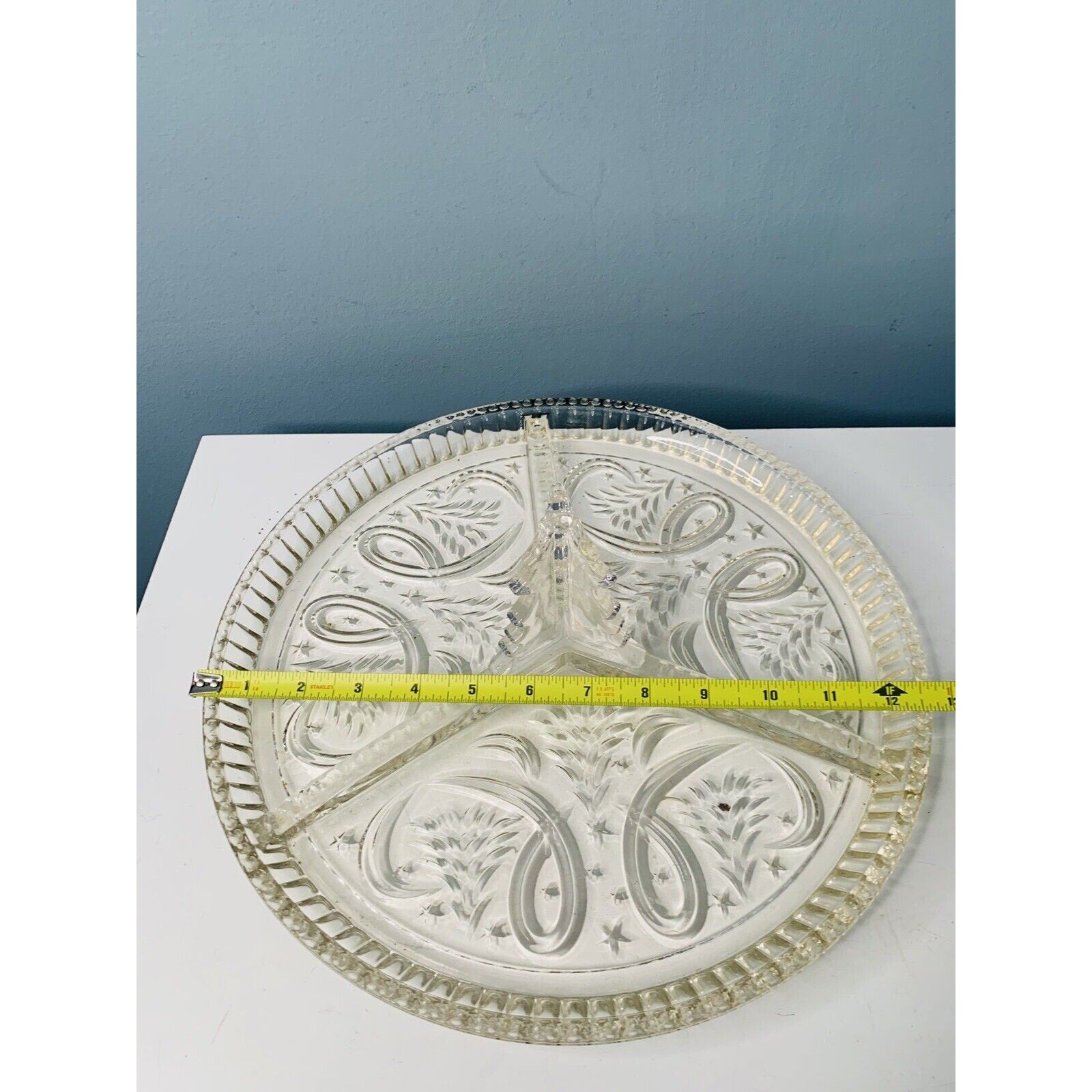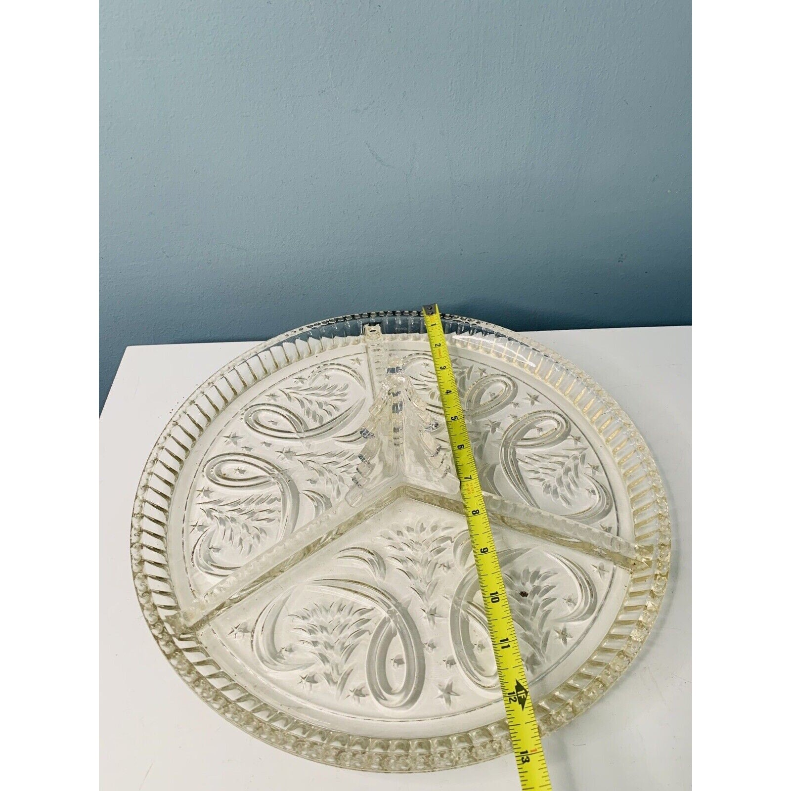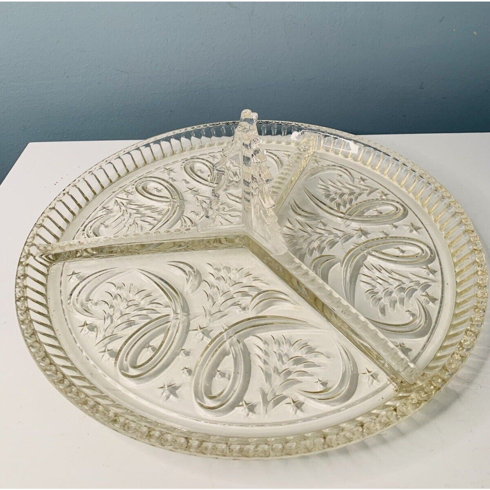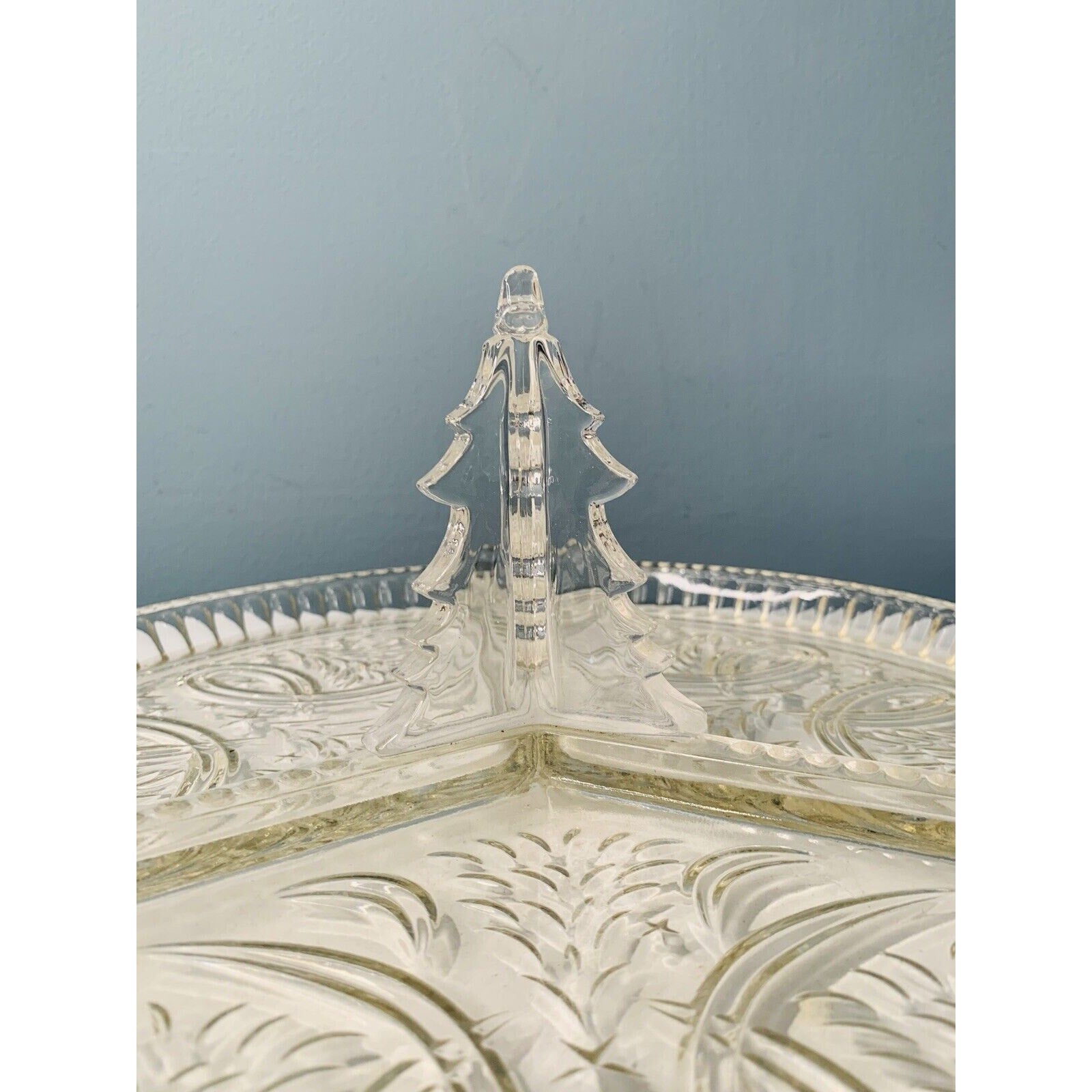 This is a vintage Fifth Avenue Crystal 13" Ribbon and Tree 3-Section Plate made of clear crystal glass. It features a Christmas-themed design, with a height of 6" and a weight of 5 pounds 6 ounces. The set includes a tray, and the plate is suitable for serving various items.
