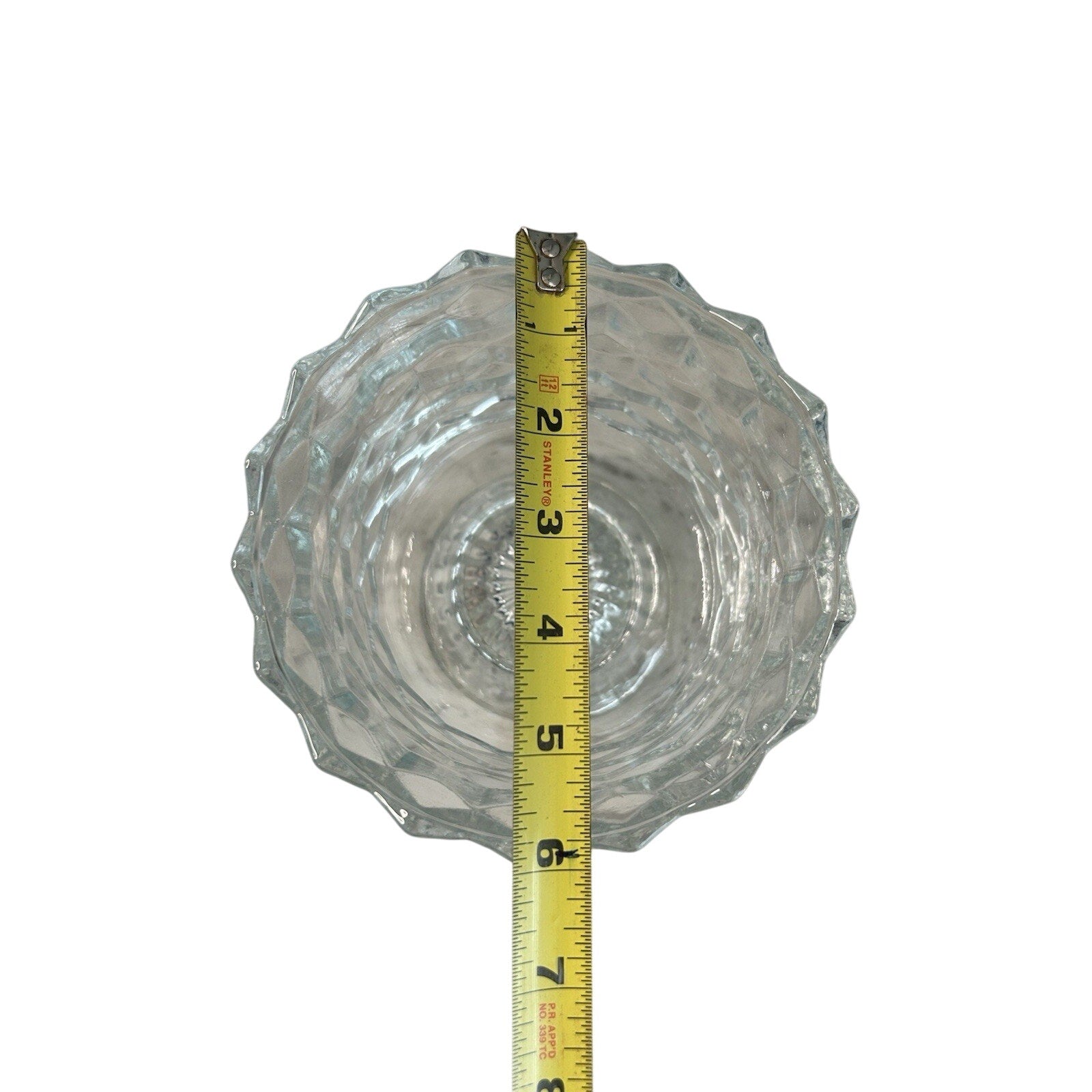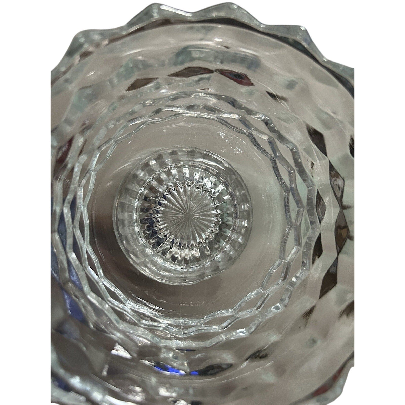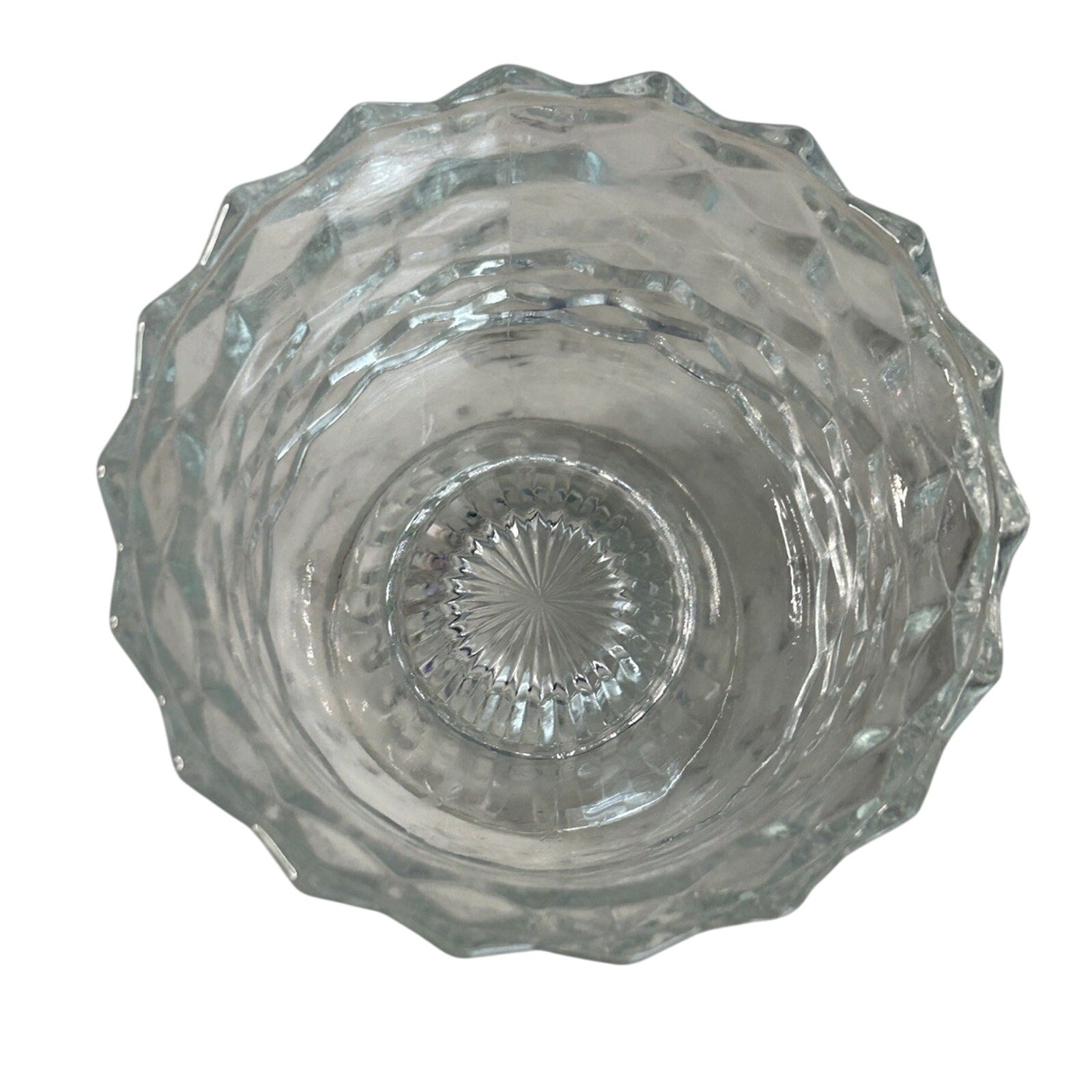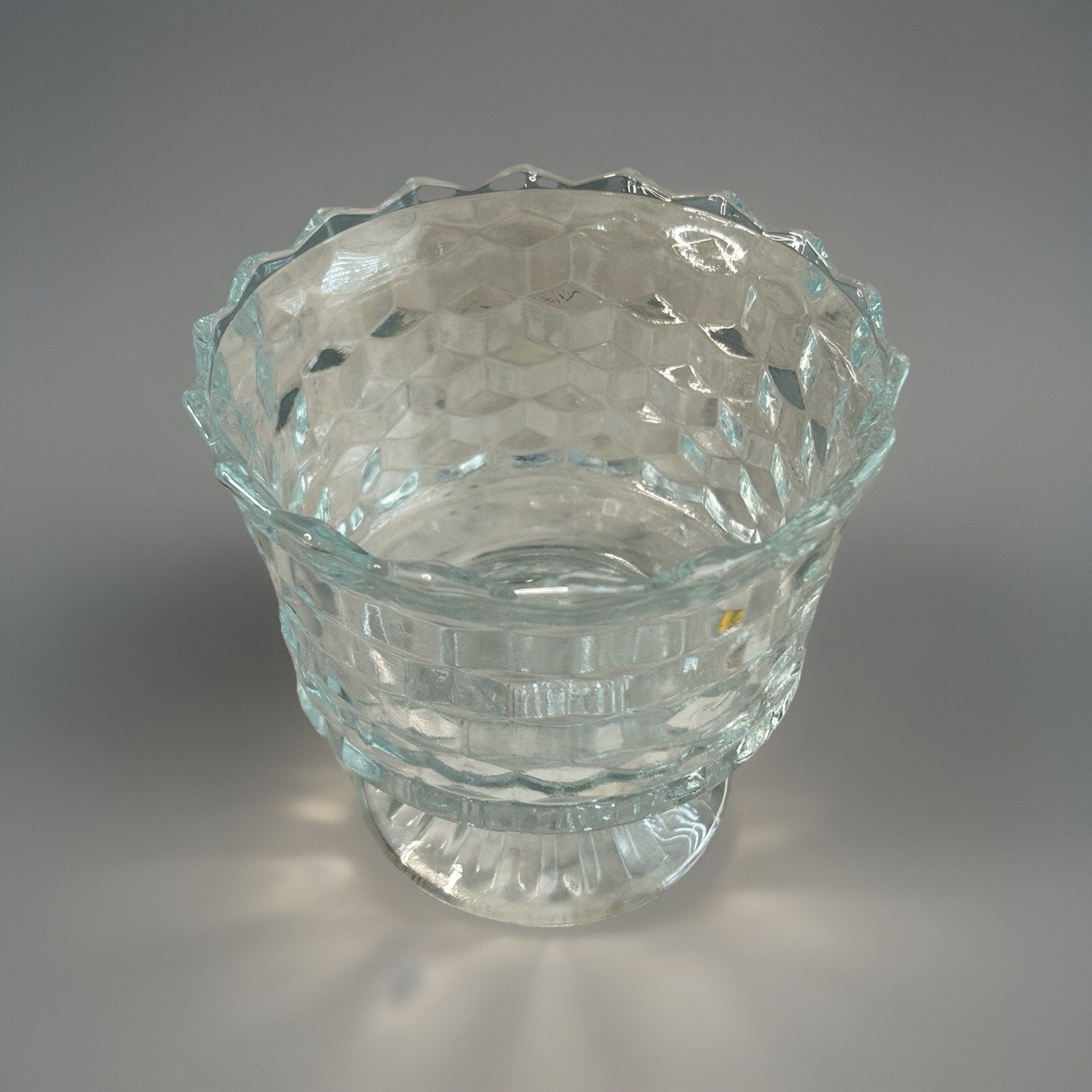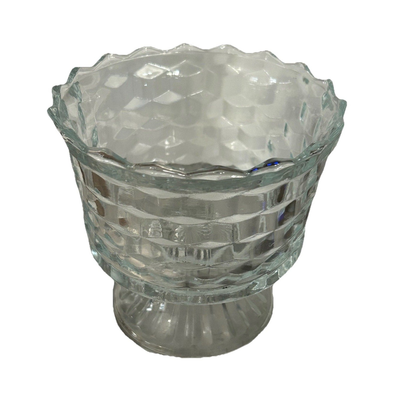 Vintage Fostoria American Footed Trifle Bowl, a timeless piece reflecting the elegance of the 1950s. The clear glass bowl showcases a distinctive cubed pattern, complemented by its round shape, making it a striking addition to any tabletop or showcase. Measuring 6 inches in diameter and standing 5.5 inches tall, this bowl is perfect for hosting guests or adding a touch of sophistication to your home.