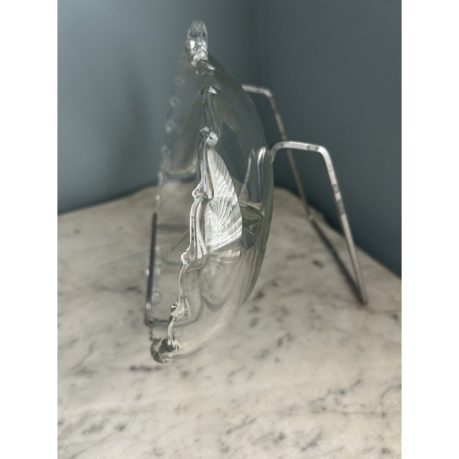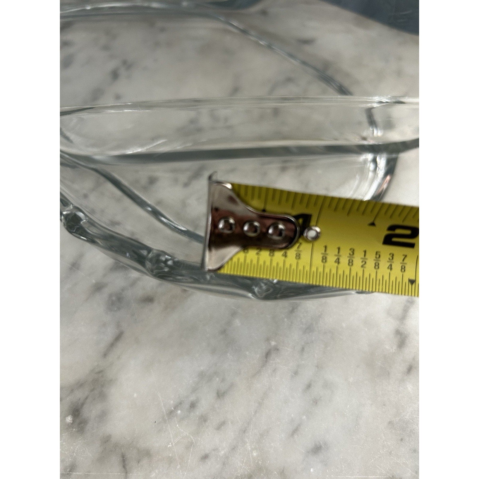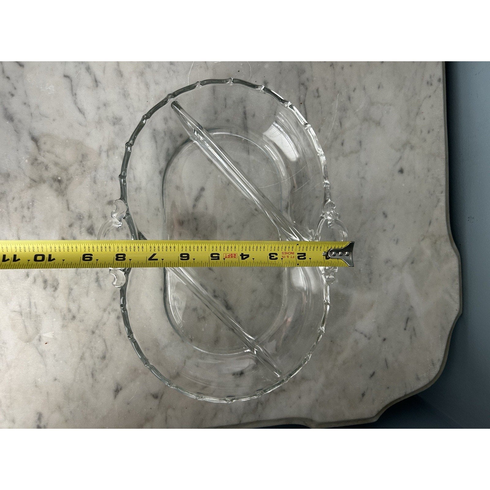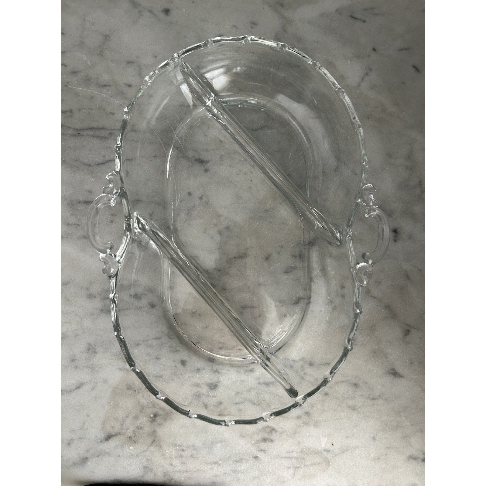 This vintage Fostoria serving tray is a great addition to your collection. With its clear glass material and divided compartments, it's perfect for serving a variety of snacks and appetizers. The tray features handles on both sides for easy carrying and has a rectangular shape with a length of 11 inches and a width of 8 inches.