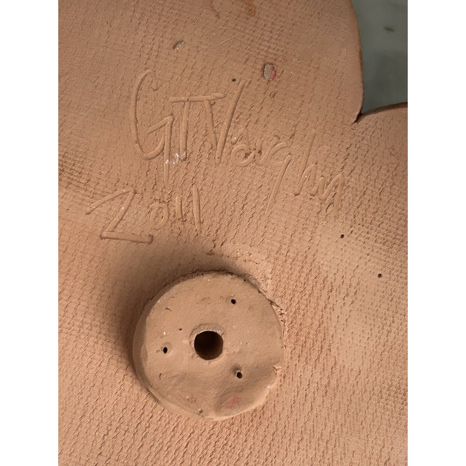 This is a hand-made pottery hanging wall decor featuring a pink frog with red eyes and a leaf tree design. The item measures 10" in length, 8" in width, and 3" in height, with a glossy finish and a flower pattern. It was hand made in 2011 and is suitable for wall decoration, use as a lid n centerpiece or general home decor.