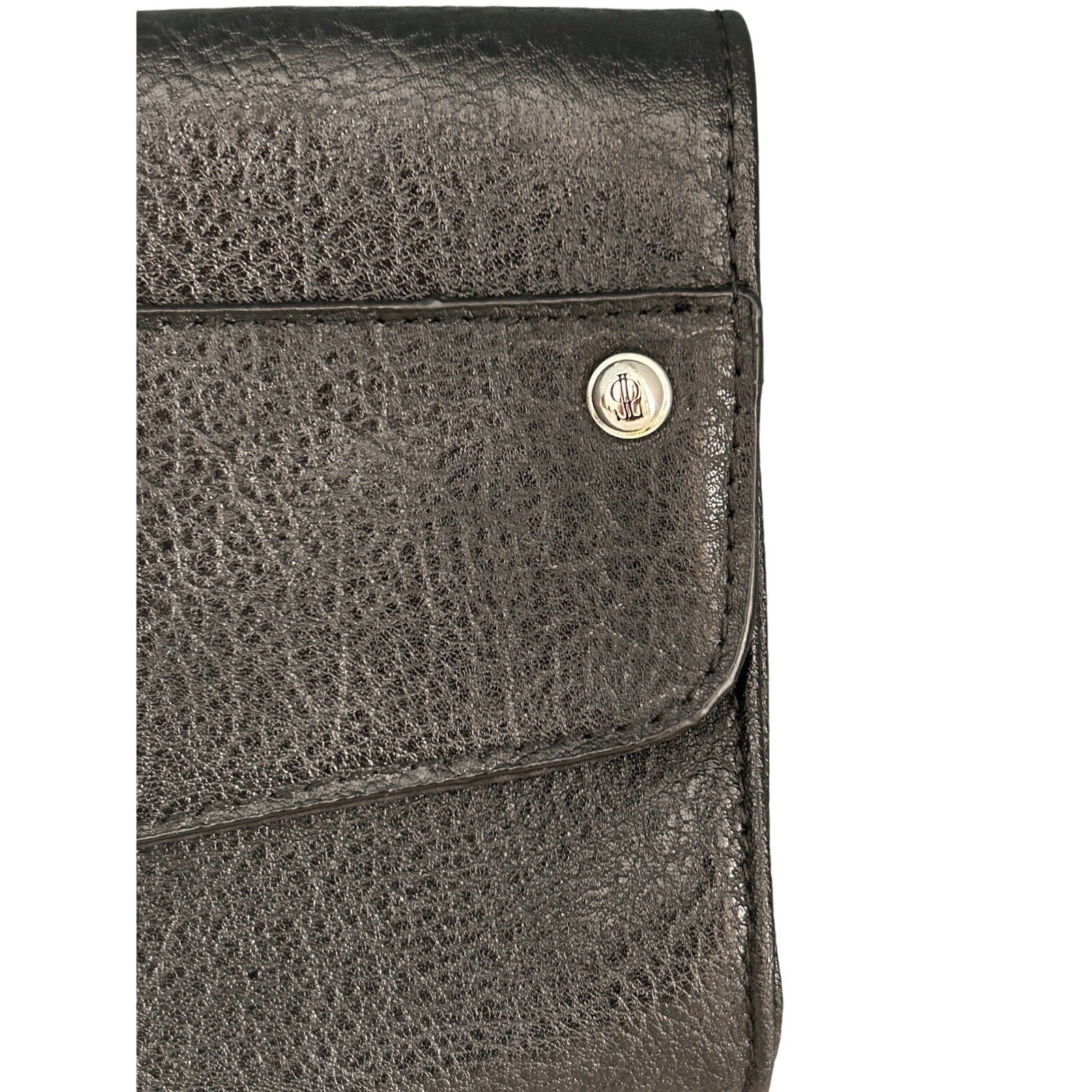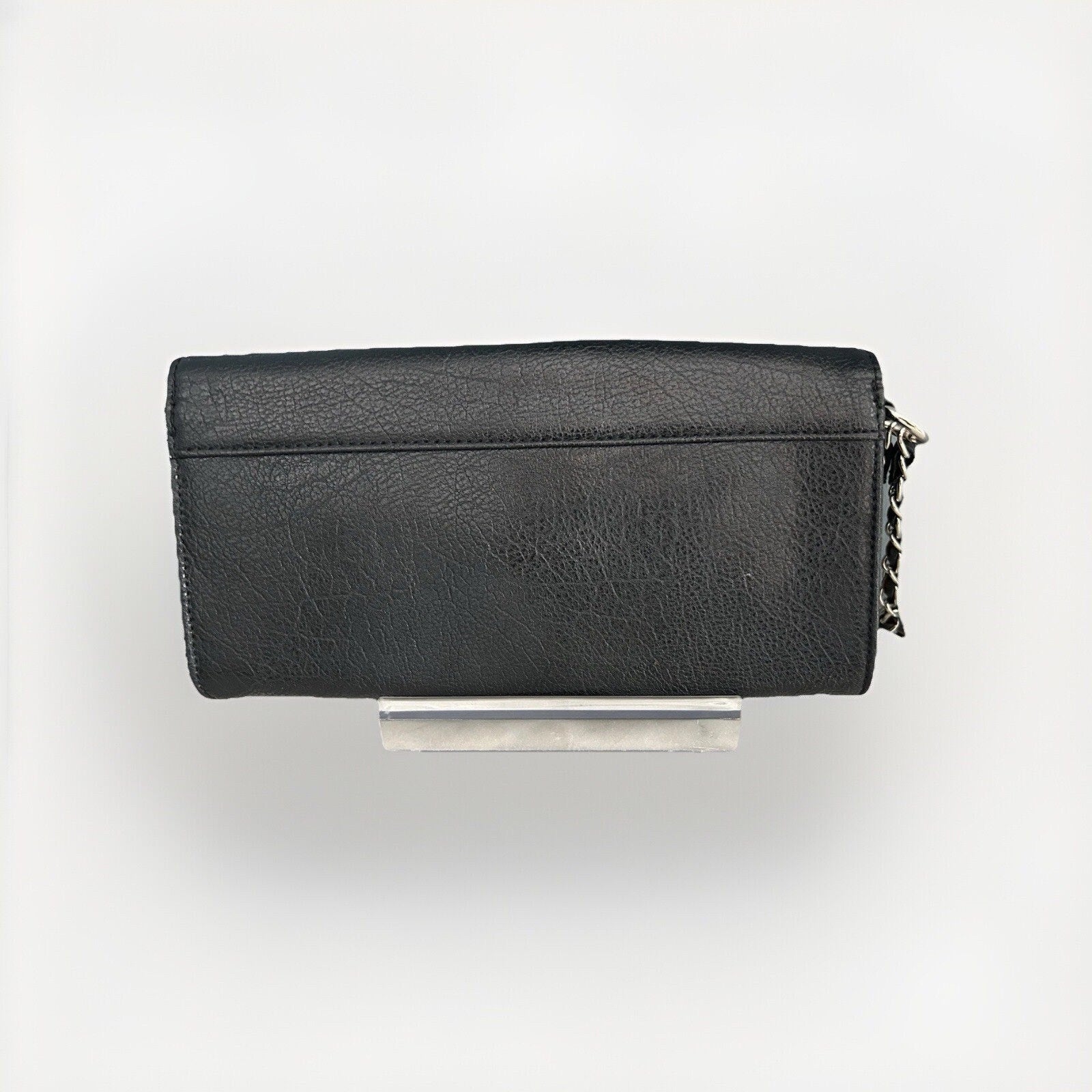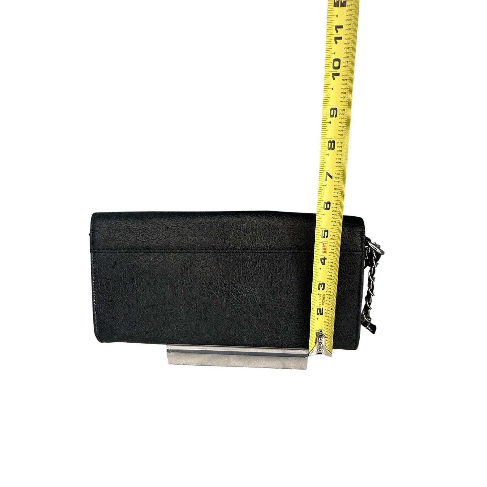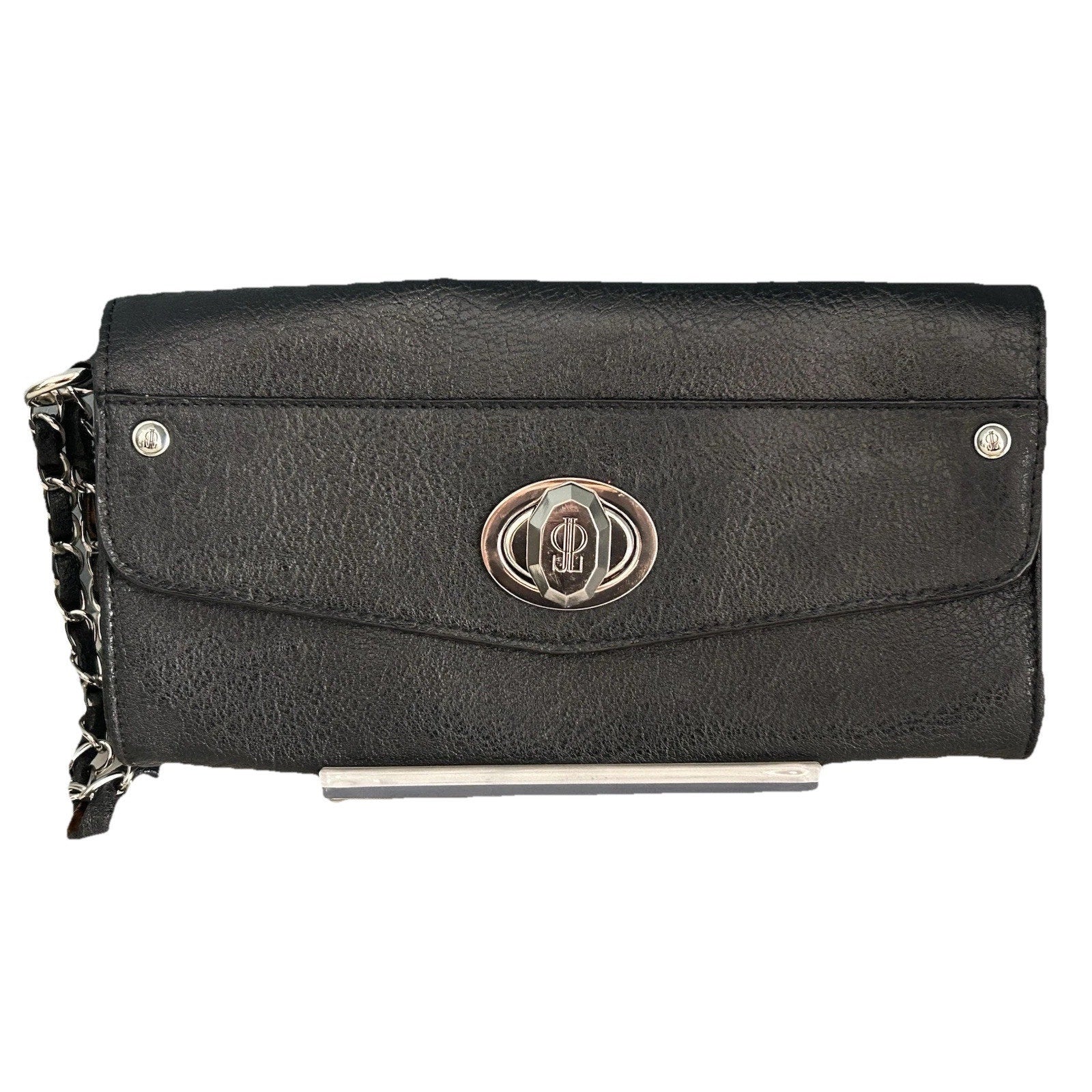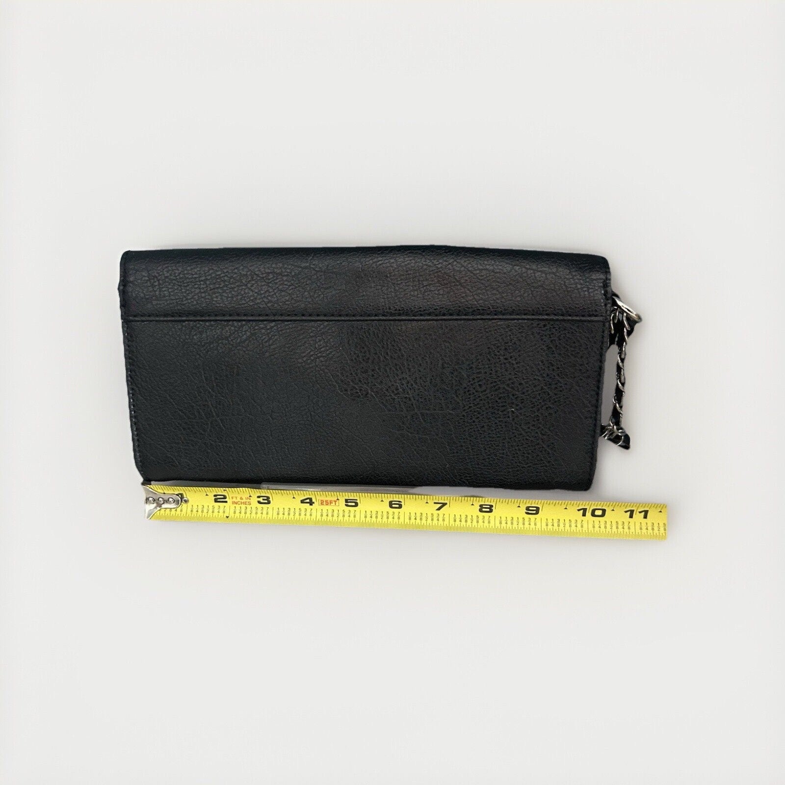 This is a Jennifer Lopez black wristlet clutch purse designed for parties, weddings, and cocktail events. It features a solid pattern with a rectangular shape, a zip closure, and a chain strap with black handles. The exterior is made of faux leather with silver hardware, and the interior lining is also black. The wristlet has a width of 10.5 inches, a height of 5.5 inches, and a depth of 1.5 inches.