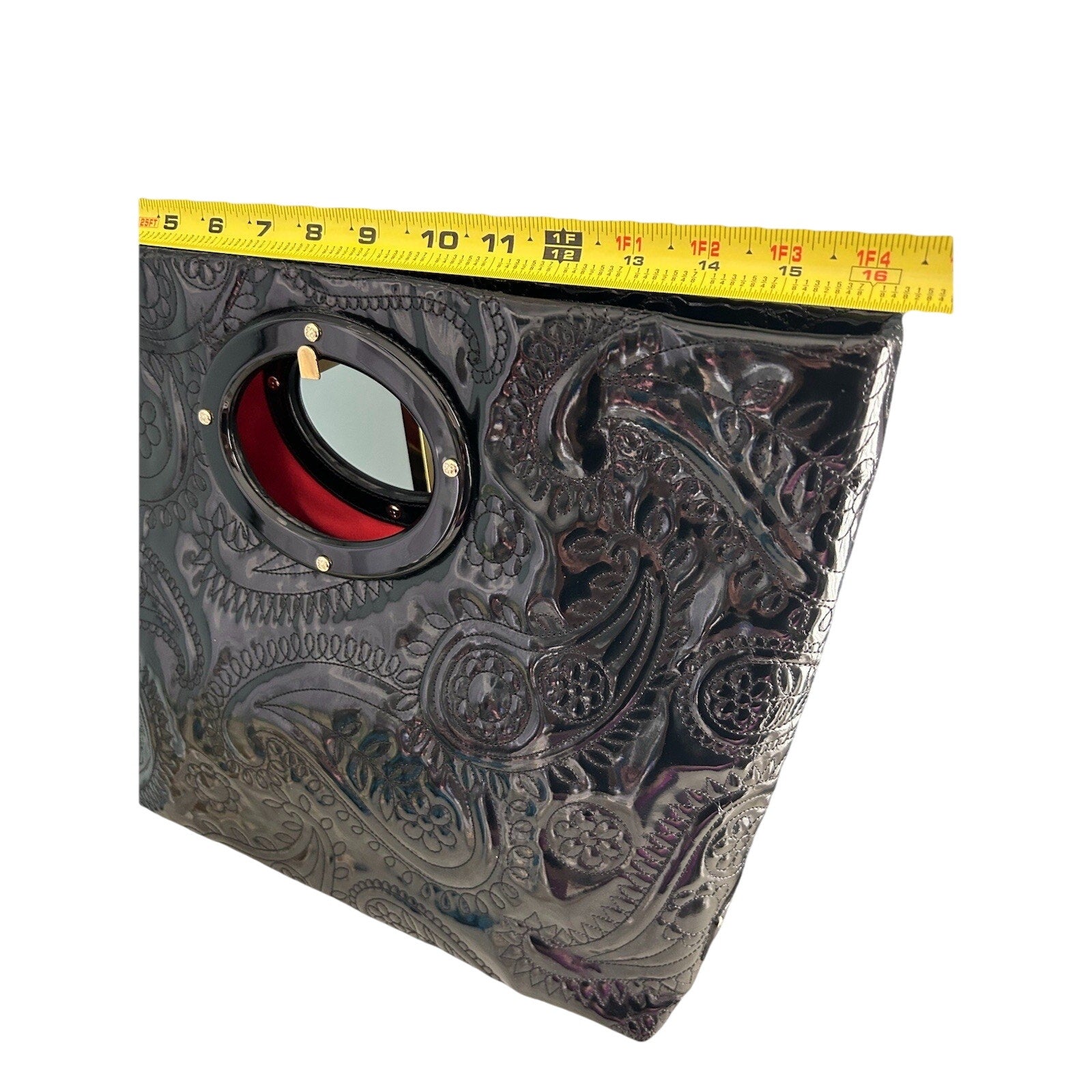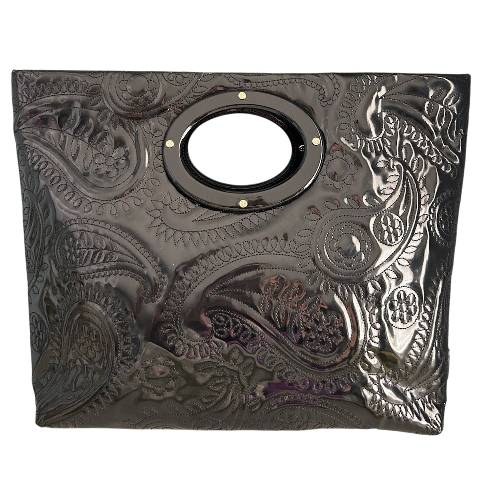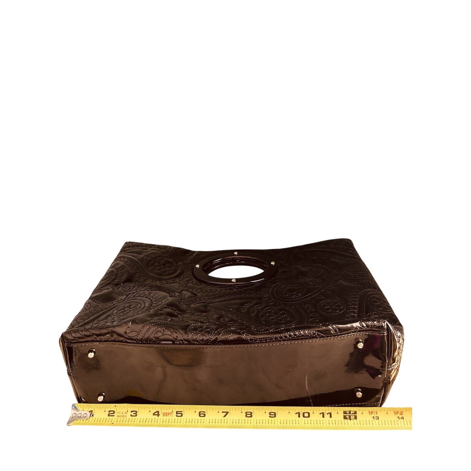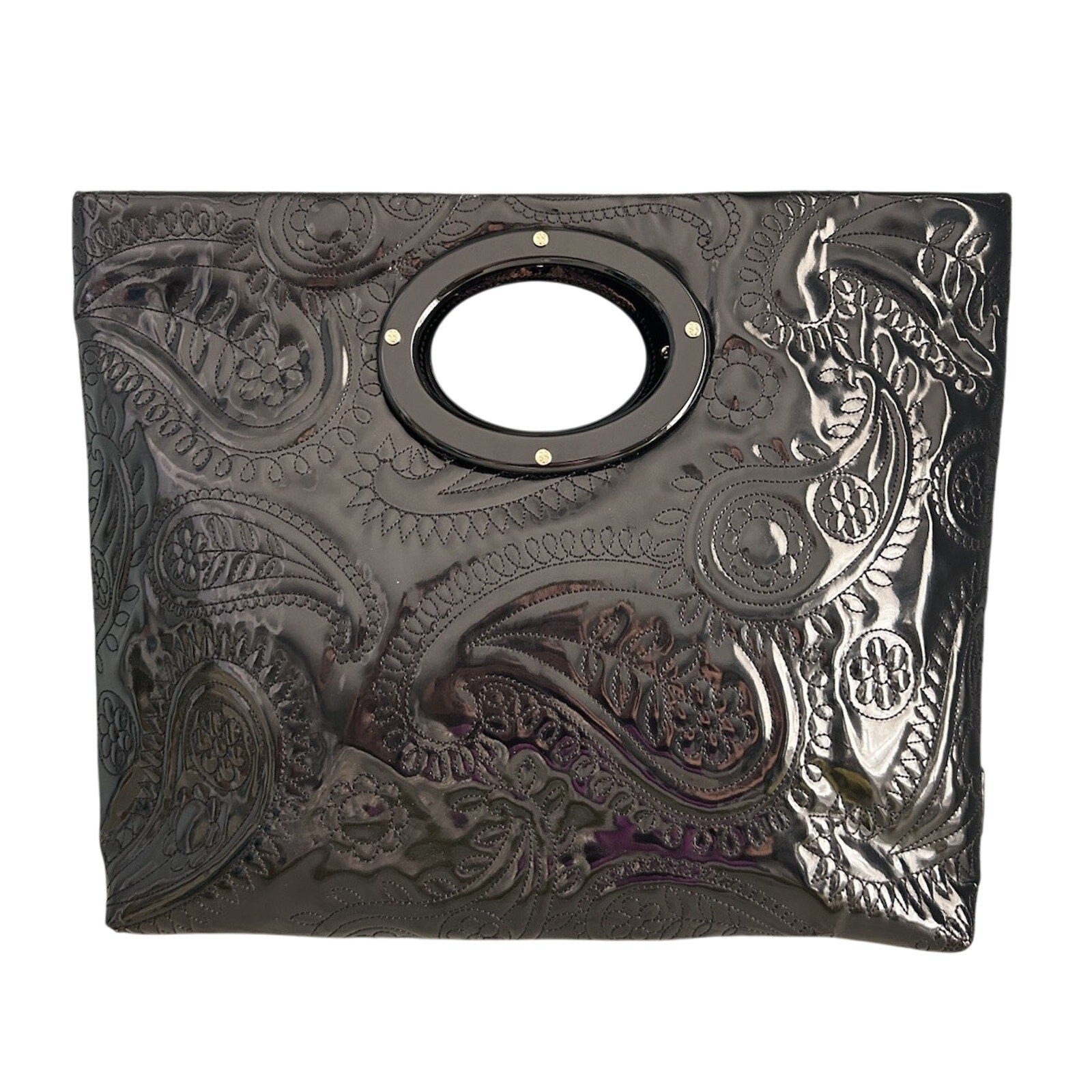 This Kate Spade Black Patent Leather Calabasas Kei Tote Large Clutch Purse is a stylish and functional accessory for any fashion-forward woman. With a beautiful paisley pattern and embroidered accents, this bag is perfect for adding a touch of elegance to any outfit. The gold-plated hardware and patent leather handle/strap material add to the bag's luxurious feel.