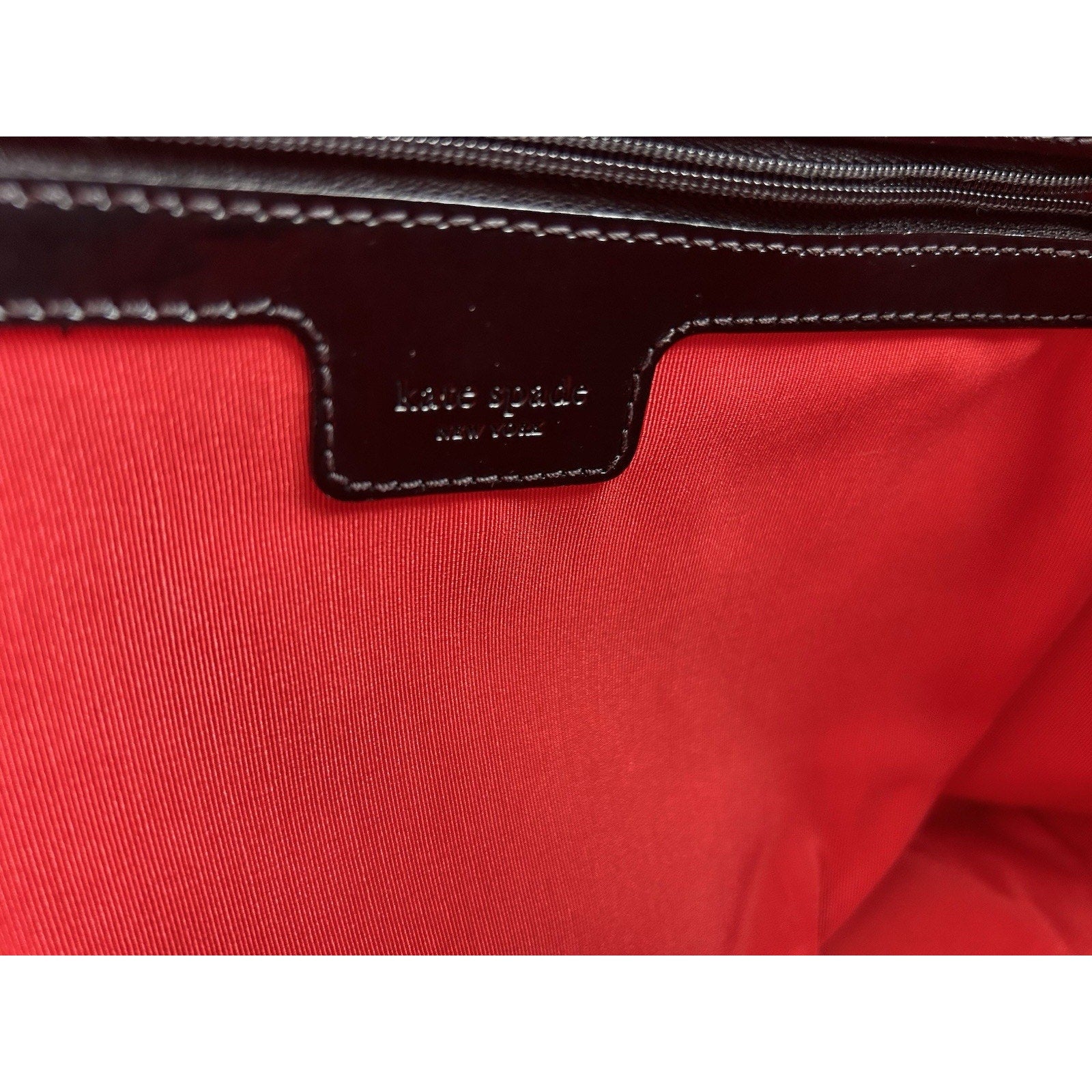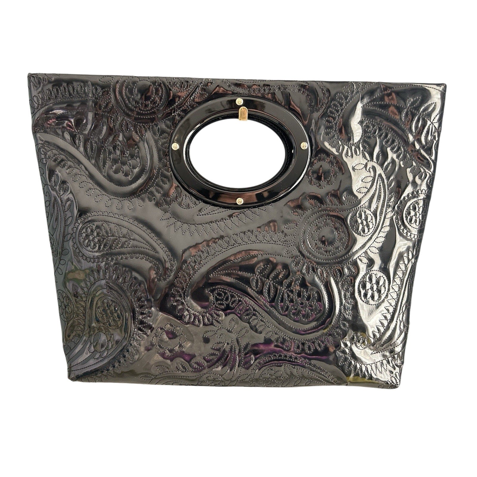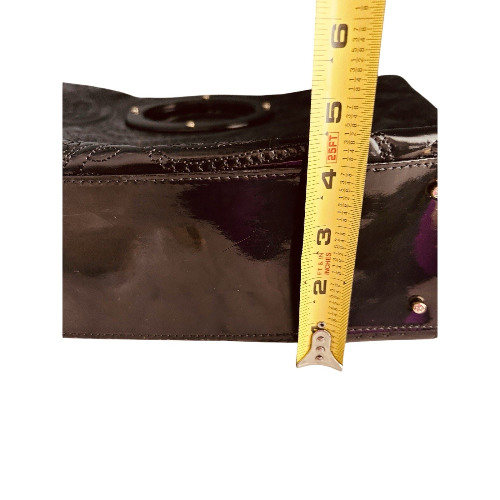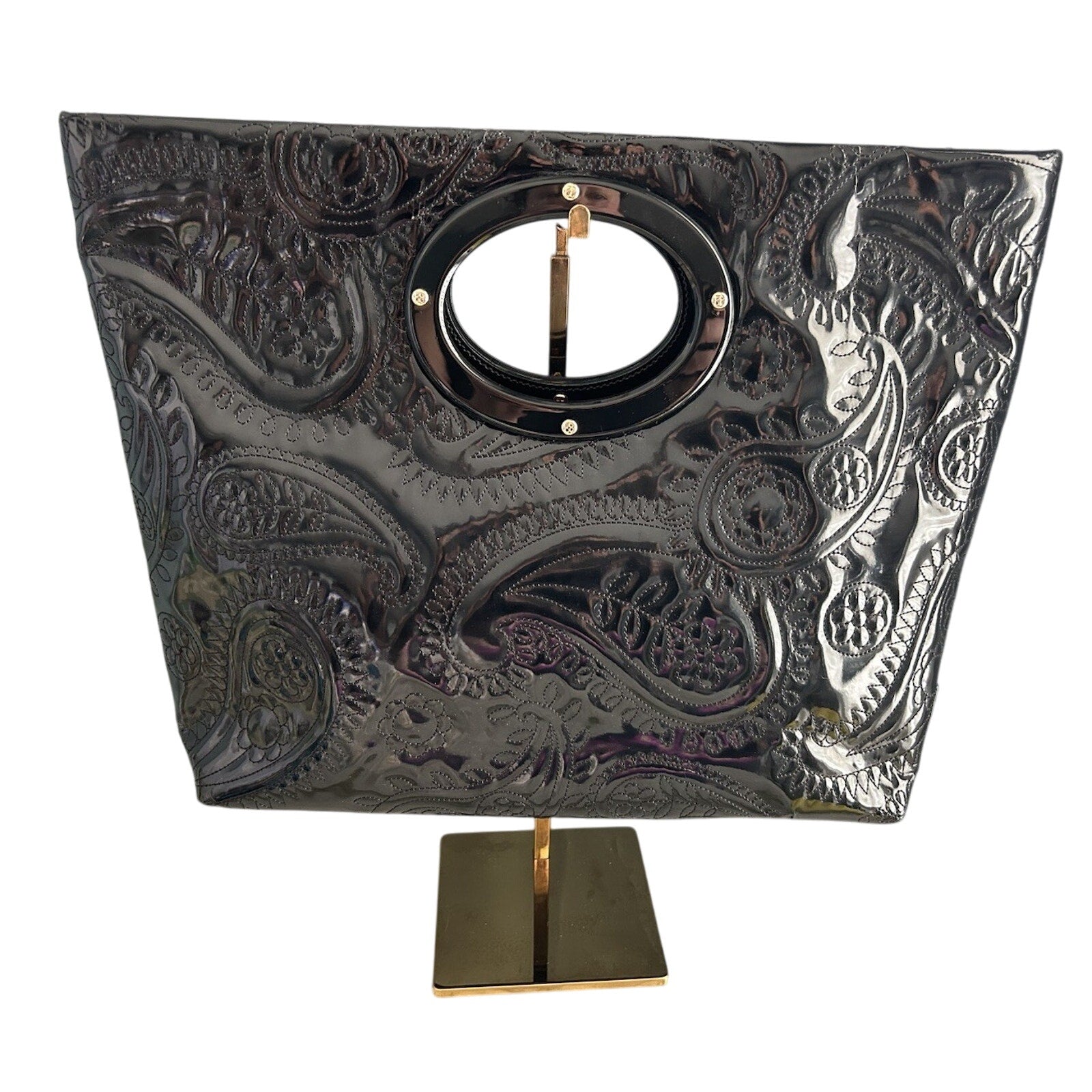 This Kate Spade Black Patent Leather Calabasas Kei Tote Large Clutch Purse is a stylish and functional accessory for any fashion-forward woman. With a beautiful paisley pattern and embroidered accents, this bag is perfect for adding a touch of elegance to any outfit. The gold-plated hardware and patent leather handle/strap material add to the bag's luxurious feel.