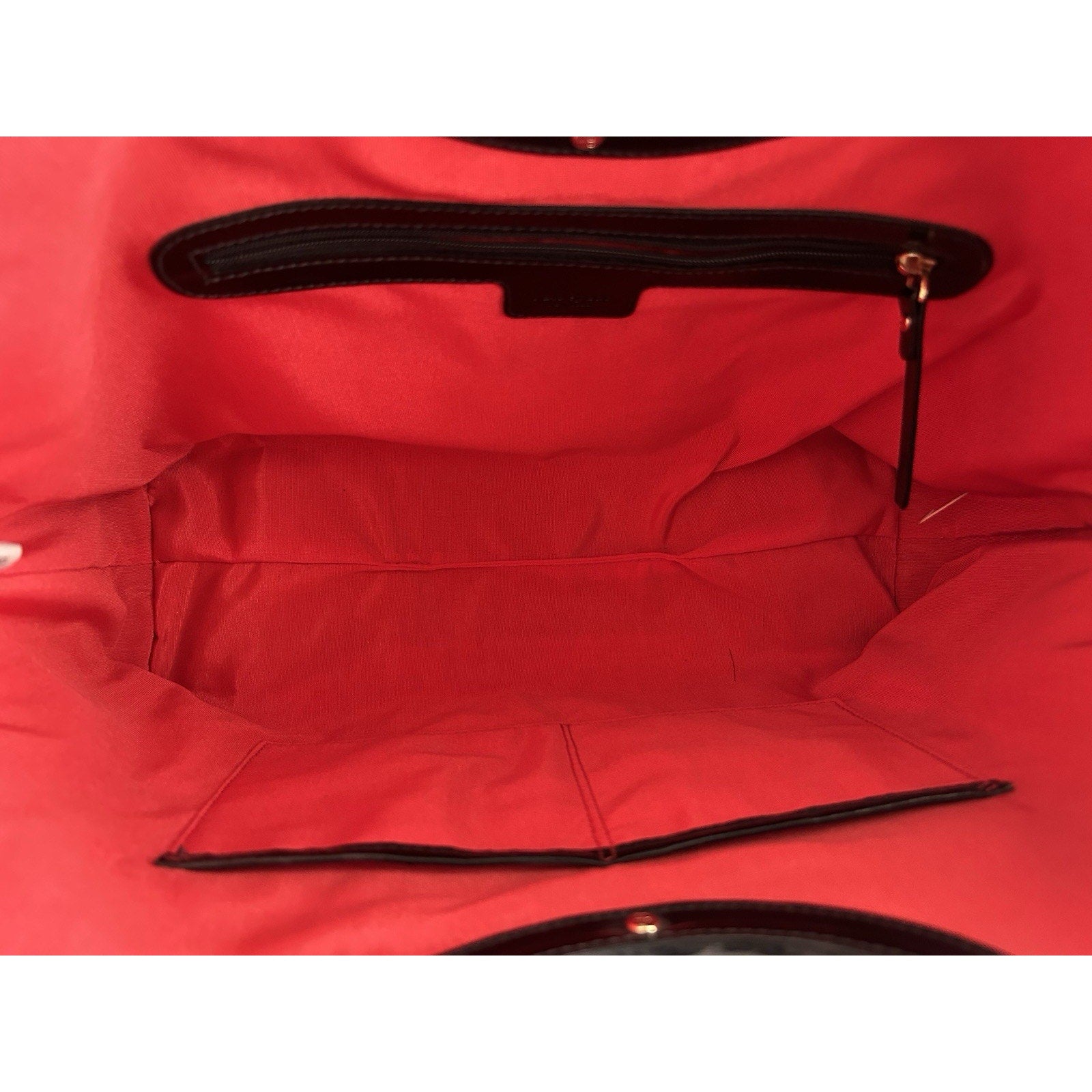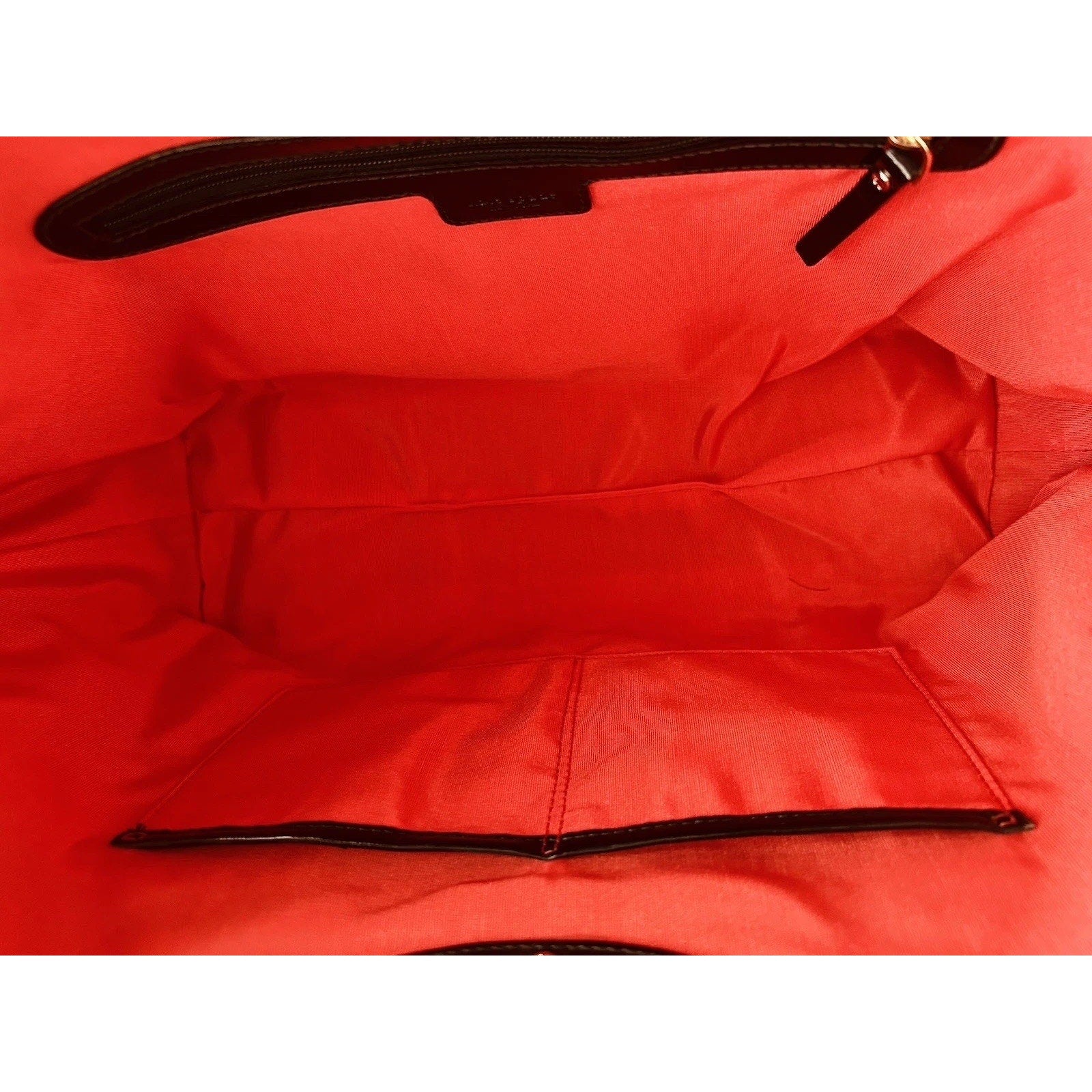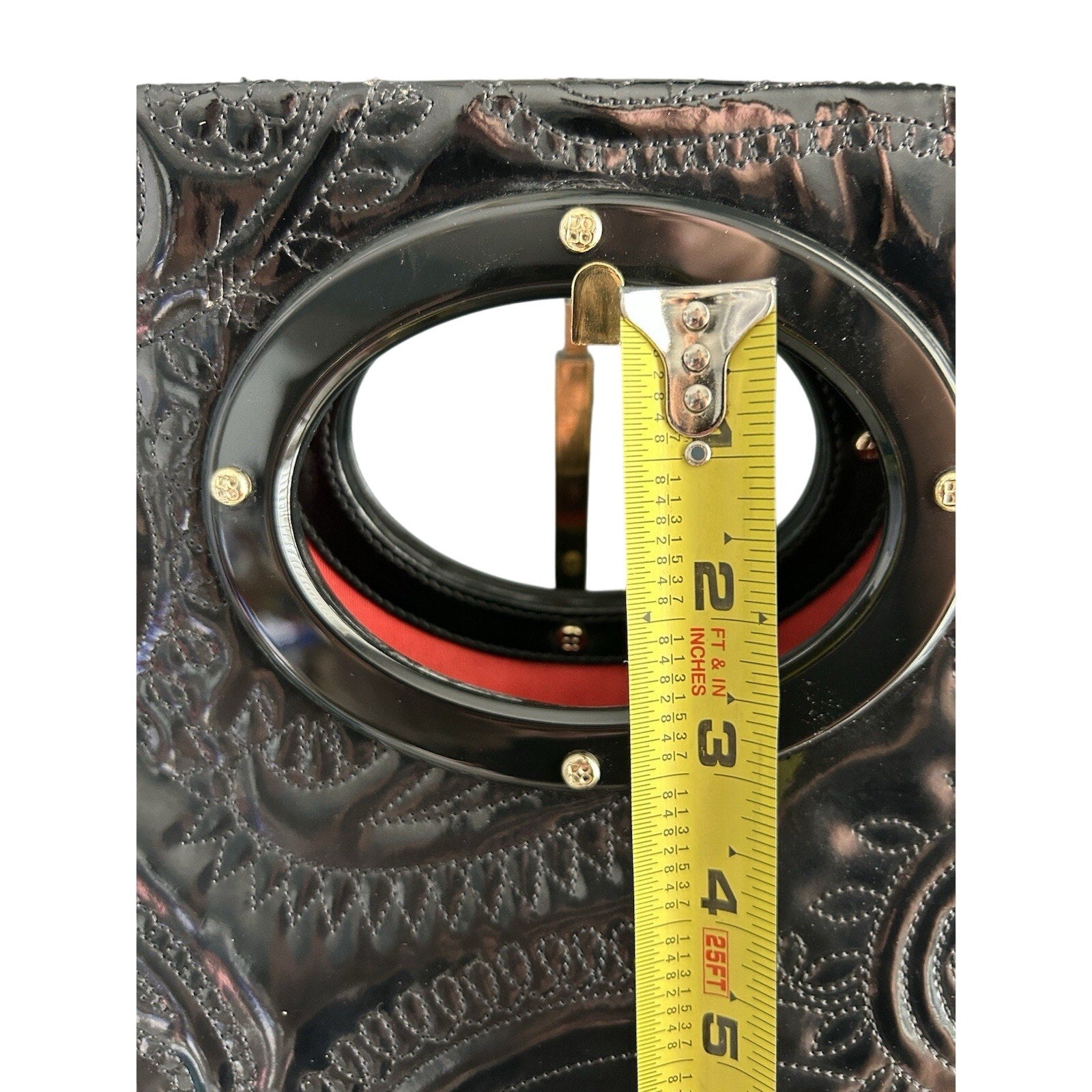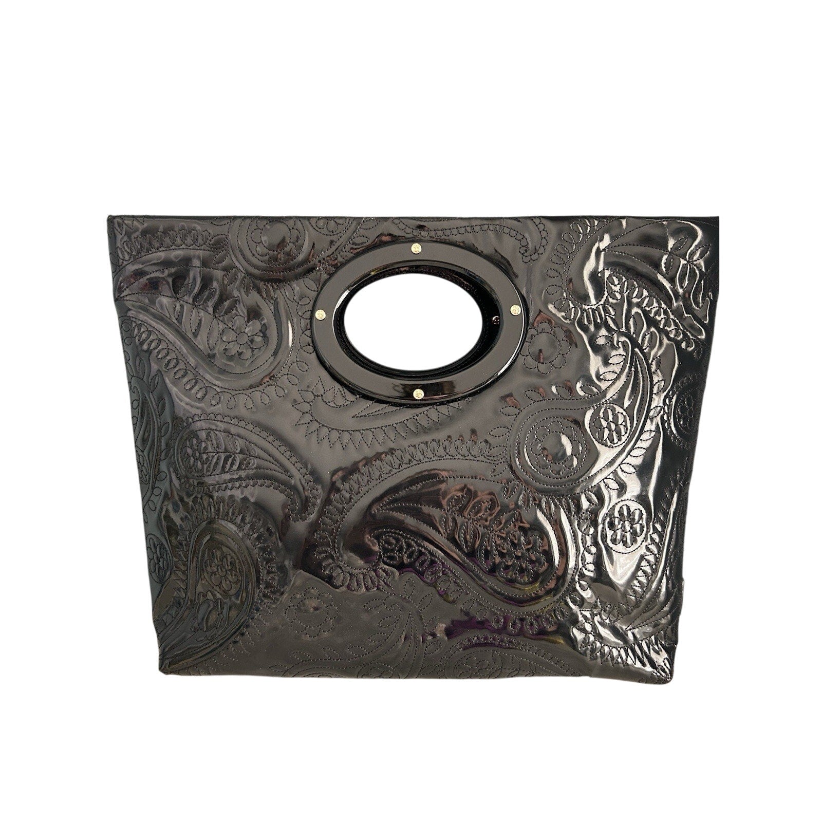 This Kate Spade Black Patent Leather Calabasas Kei Tote Large Clutch Purse is a stylish and functional accessory for any fashion-forward woman. With a beautiful paisley pattern and embroidered accents, this bag is perfect for adding a touch of elegance to any outfit. The gold-plated hardware and patent leather handle/strap material add to the bag's luxurious feel.