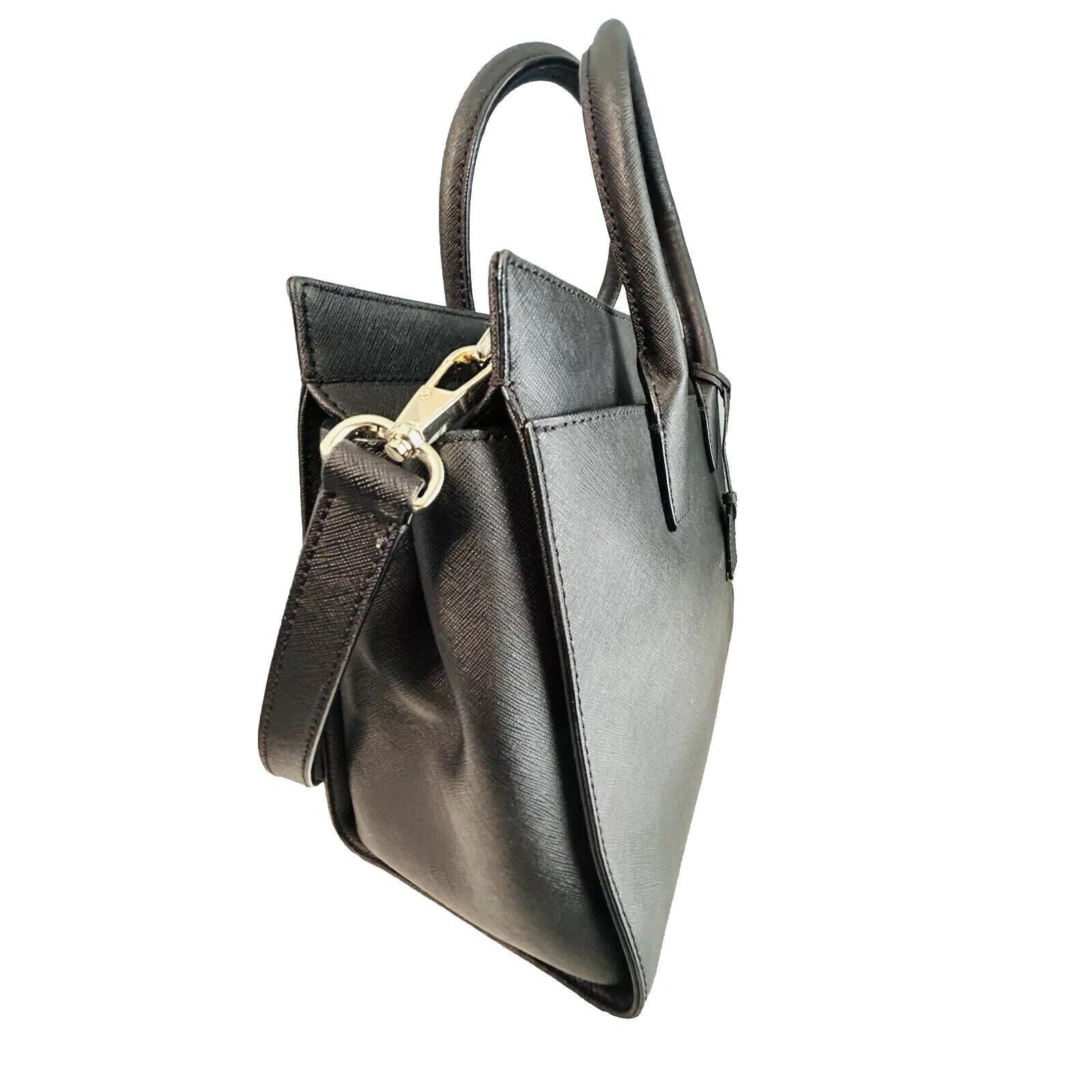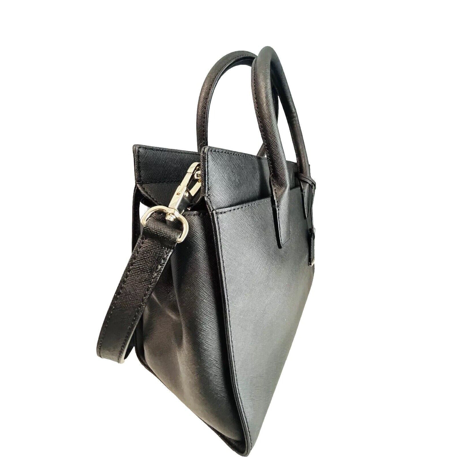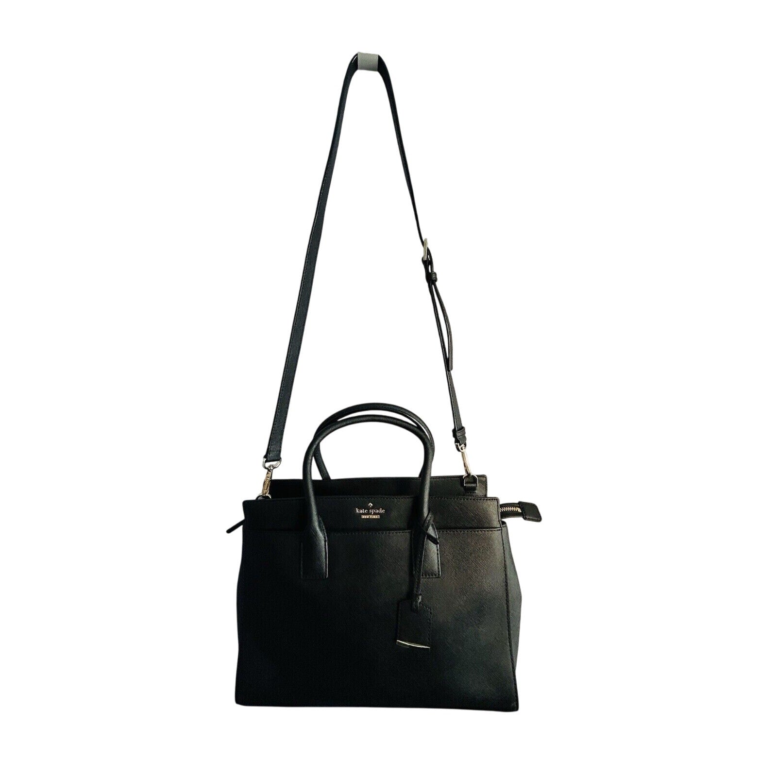 This Kate Spade Cameron Street Candace purse is a black leather satchel/top handle bag with a crossbody strap. It features a zip and magnetic closure, double handles, gold hardware accents, and a lined interior with various pockets. The bag is medium-sized, with dimensions of 13" width, 8.5" height, and 6" depth. It is suitable for travel, casual outings, workwear, or business use.