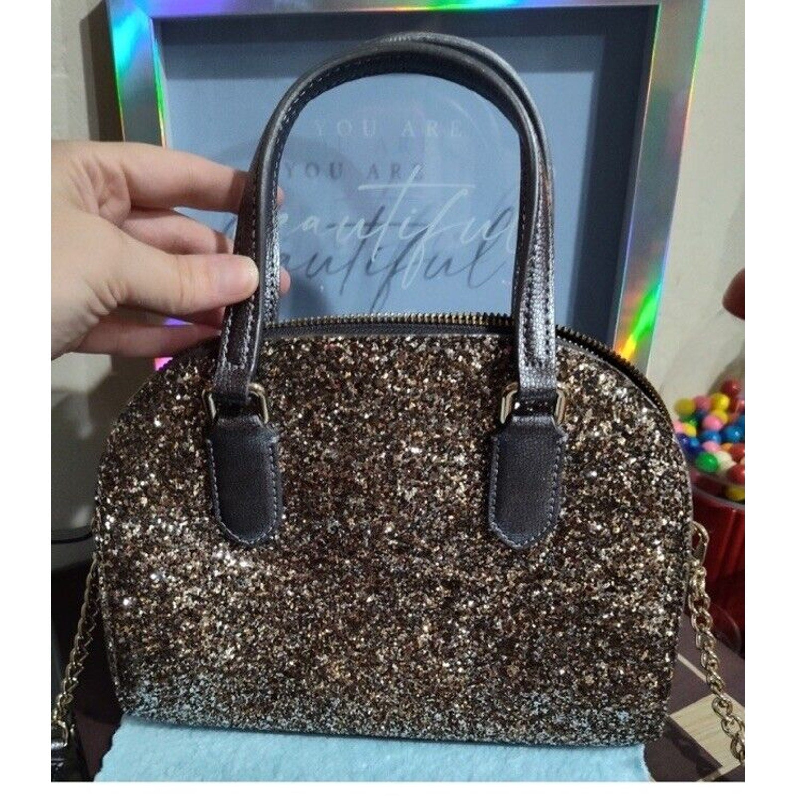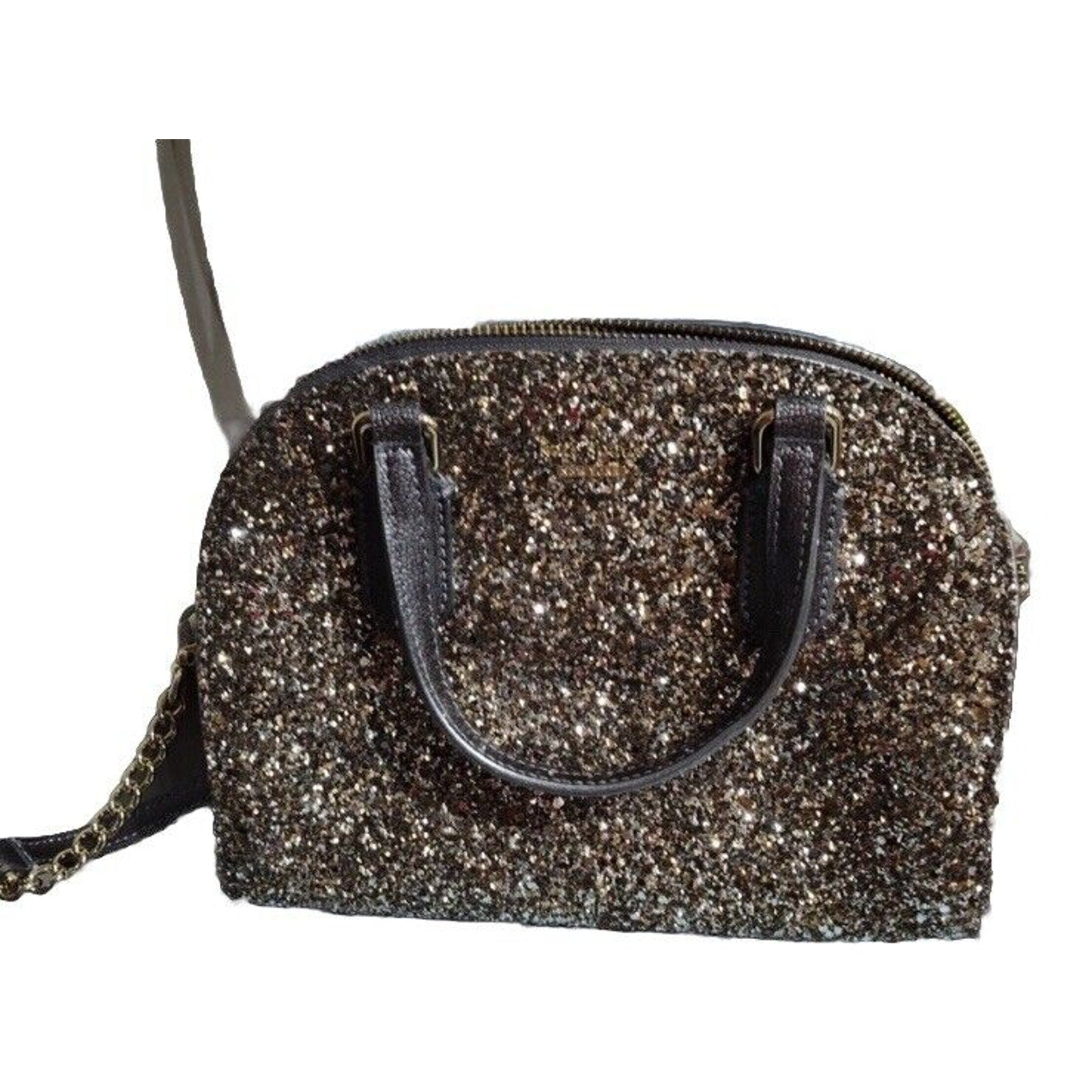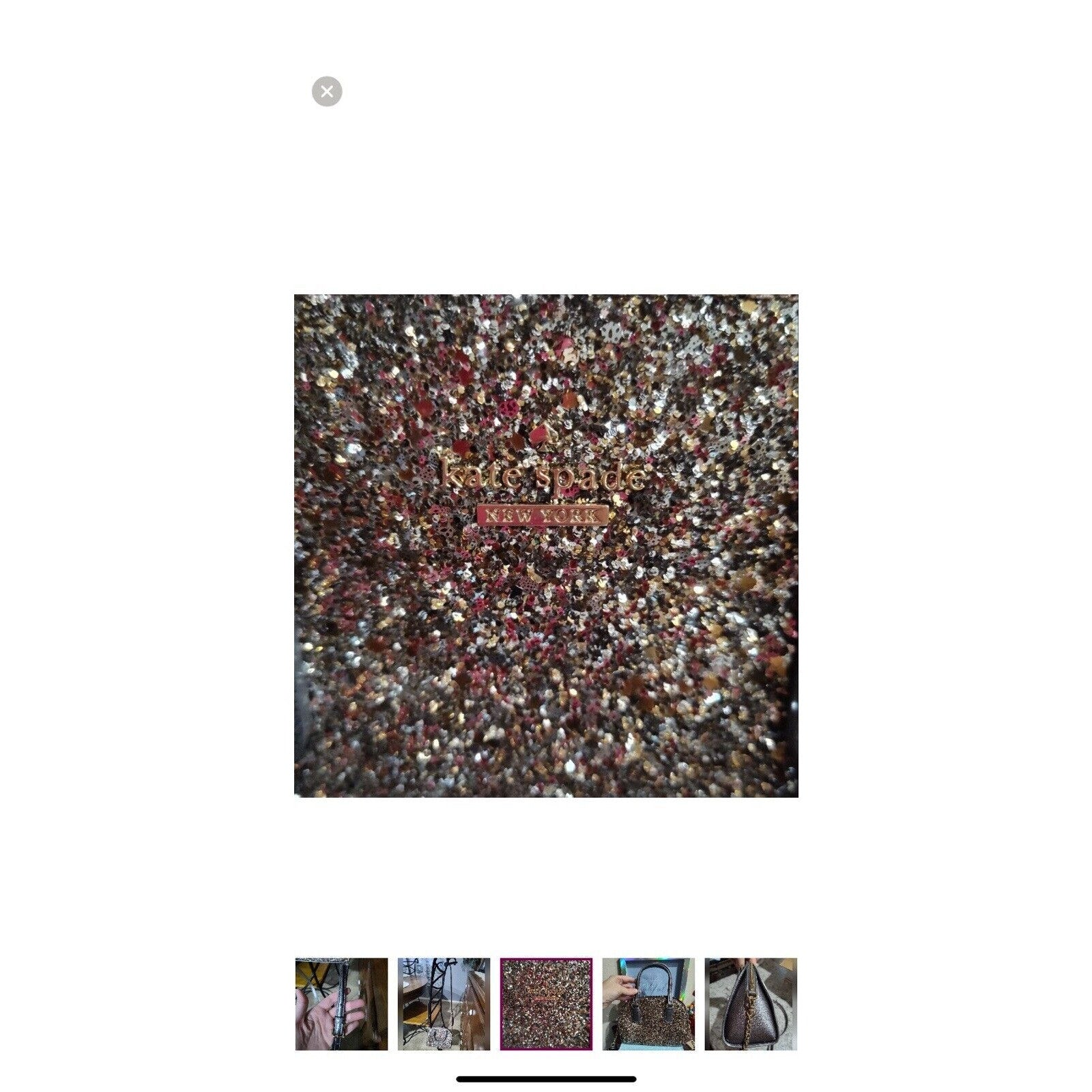 Excellent condition. This Kate Spade mini crossbody wristlet is the perfect accessory for any outfit. The glittery gold exterior material adds a touch of sparkle, while the colorblock pattern gives it a unique look. The bag has a zip closure and is convertible, making it versatile for everyday use or special occasions.