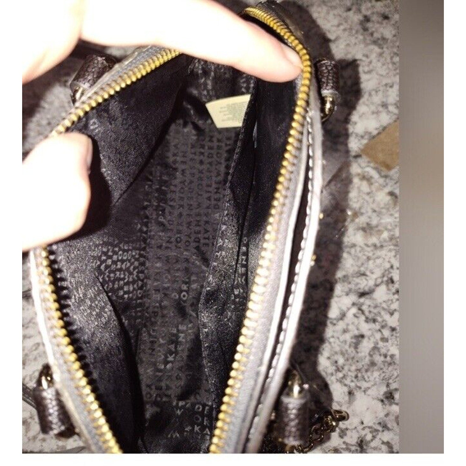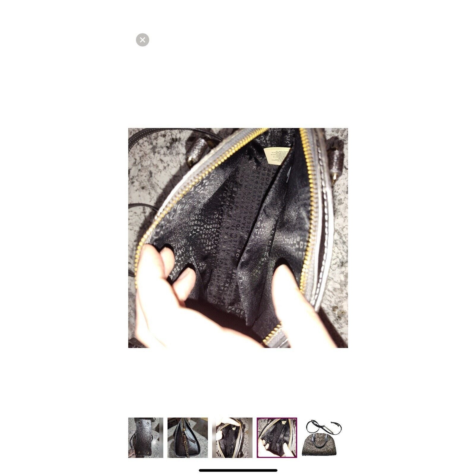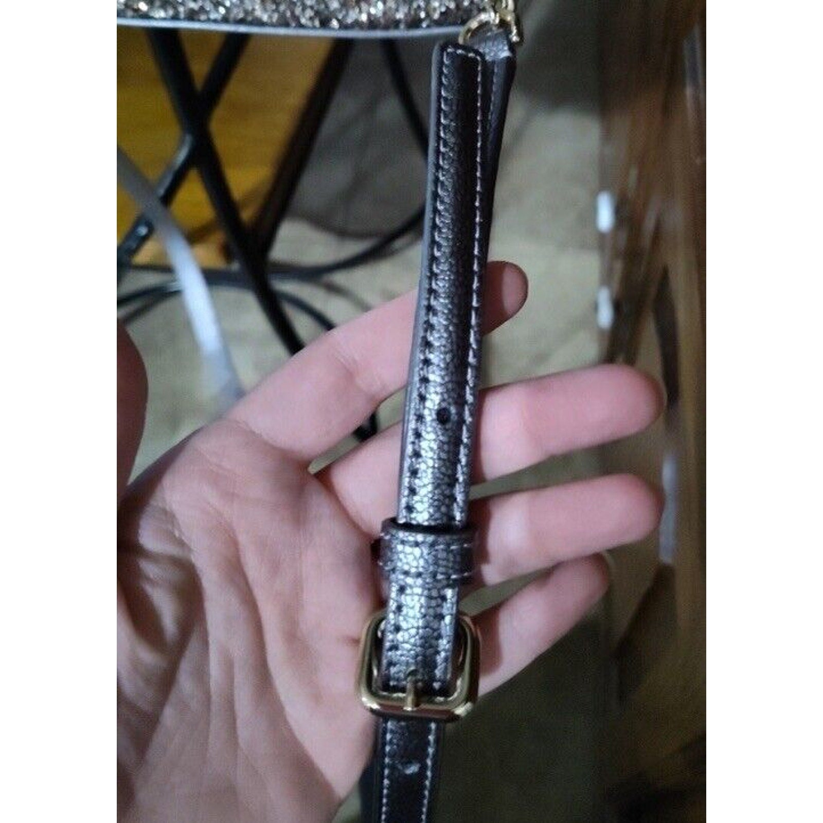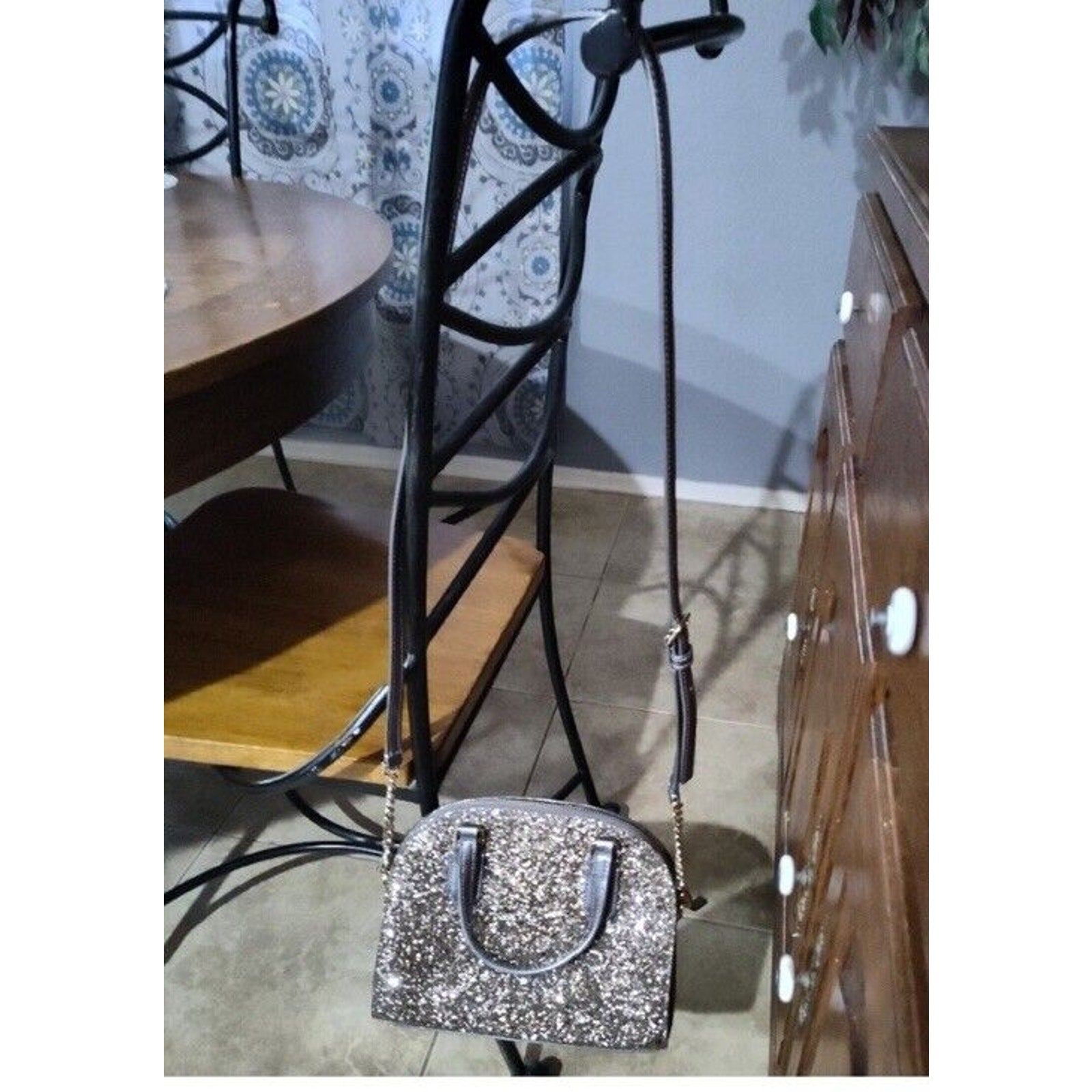 Excellent condition. This Kate Spade mini crossbody wristlet is the perfect accessory for any outfit. The glittery gold exterior material adds a touch of sparkle, while the colorblock pattern gives it a unique look. The bag has a zip closure and is convertible, making it versatile for everyday use or special occasions.