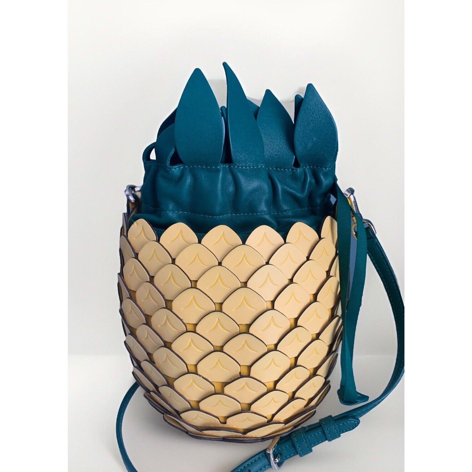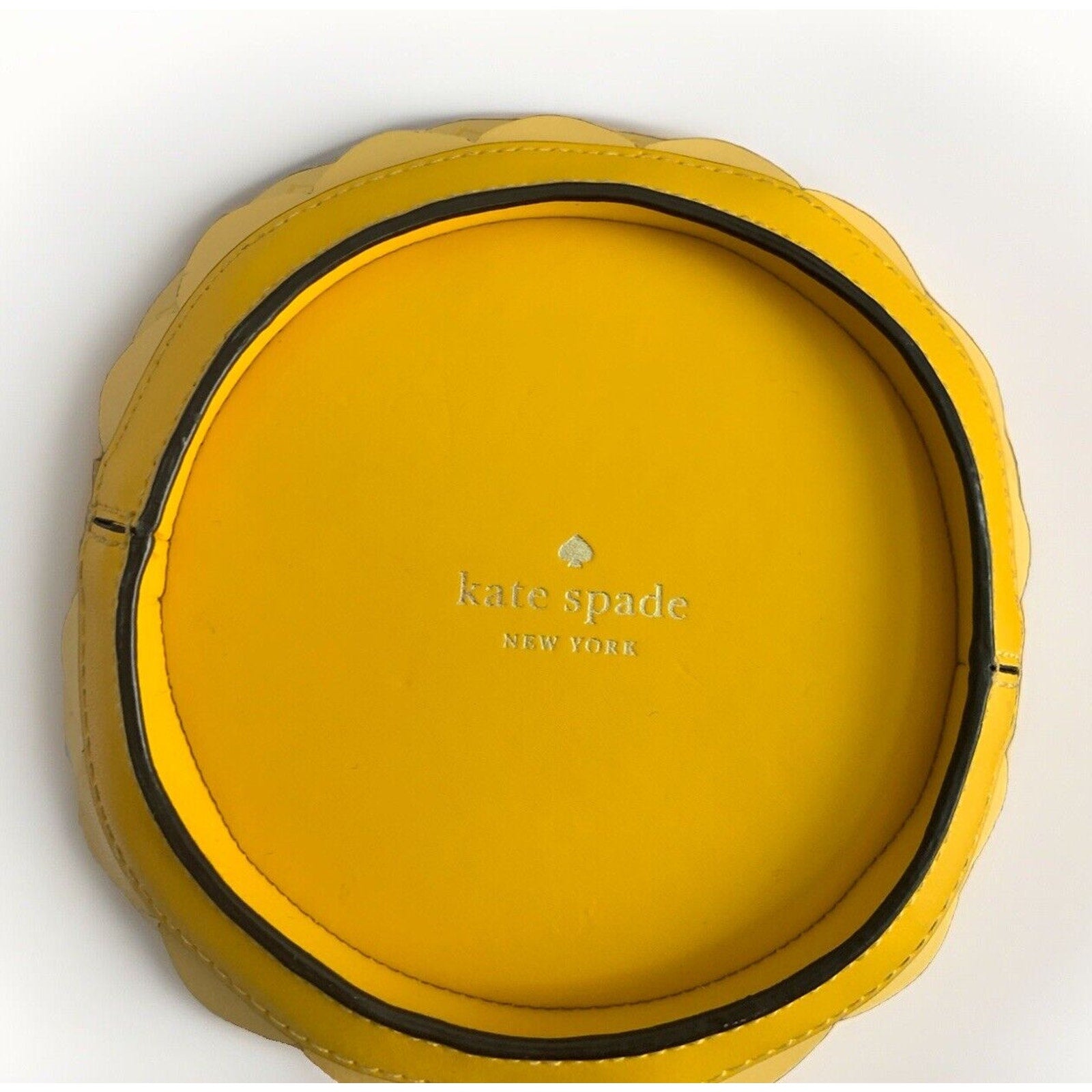 Great condition. Slight wear on the internal beige lining. This Kate Spade New York Pineapple Crossbody purse is a stylish accessory for any occasion. The bag is made of high-quality leather in a beautiful yellow exterior color with a green handle/strap material. It features a drawstring closure and a detachable strap with a drop of 22 inches. The bag is small in size, measuring 8 inches in width and height, and has a white canvas lining material.