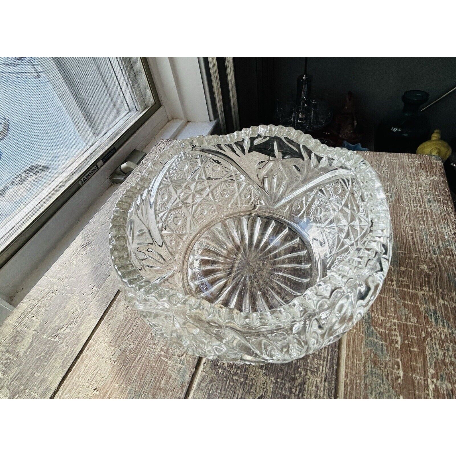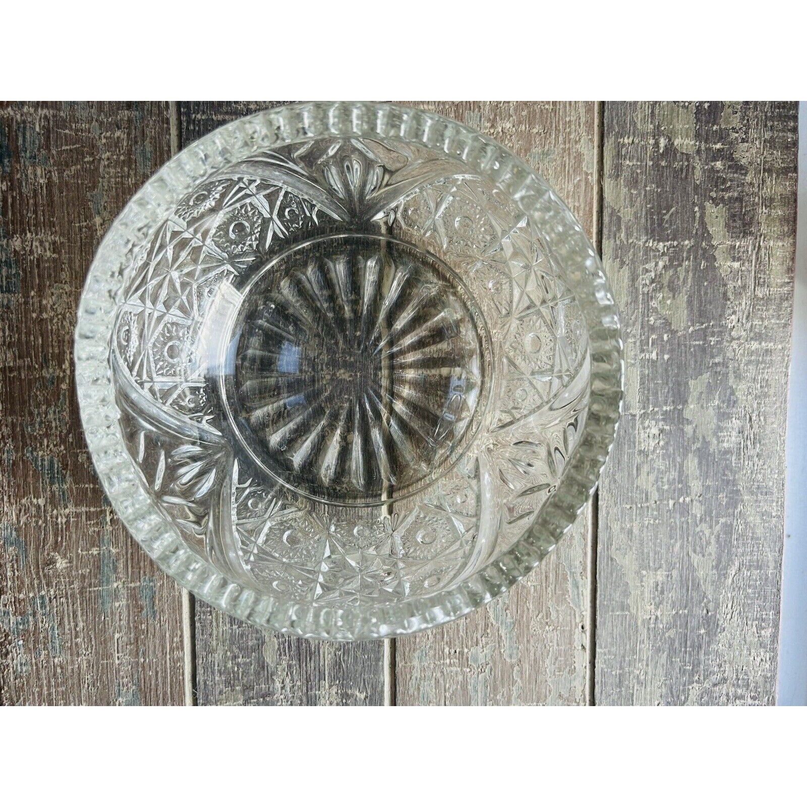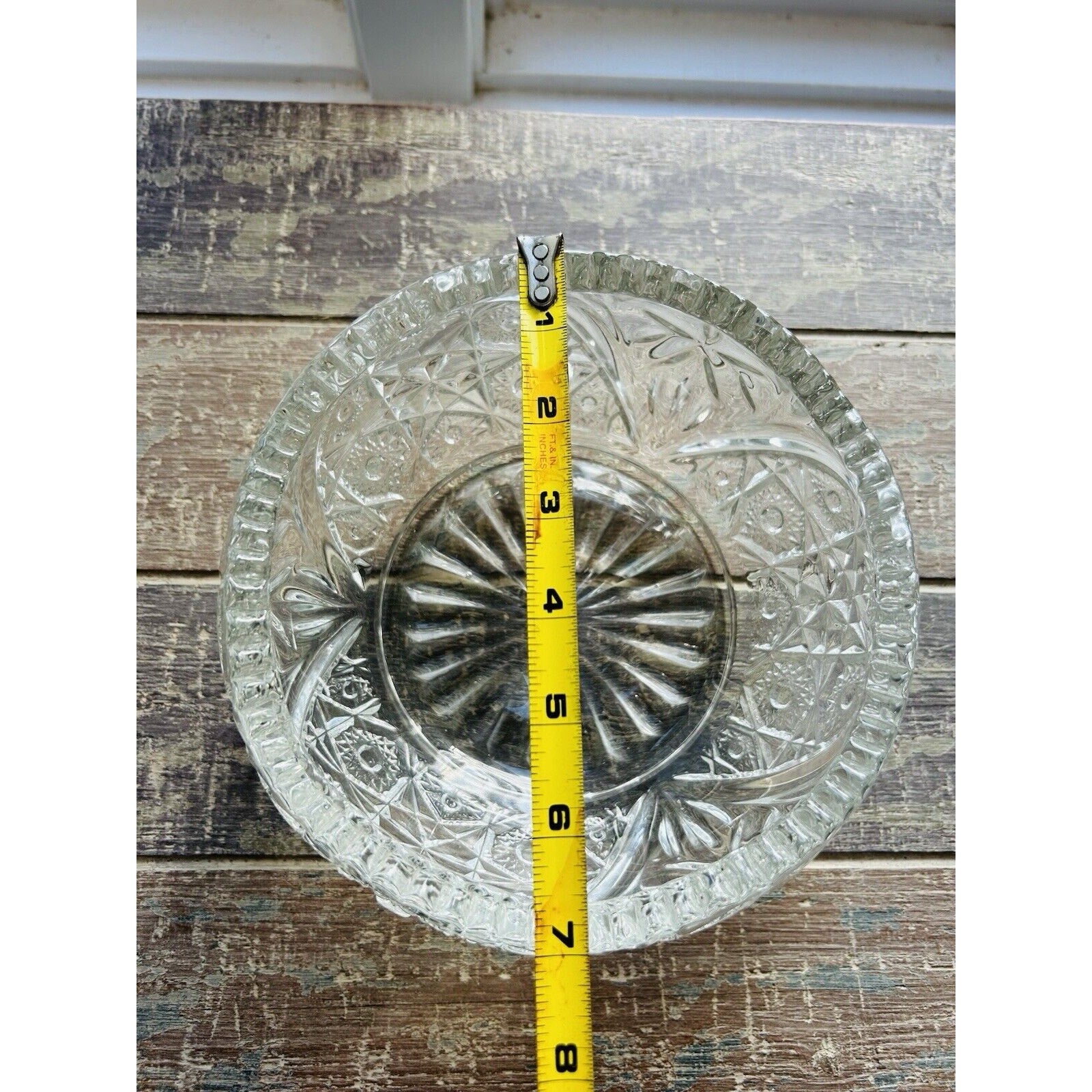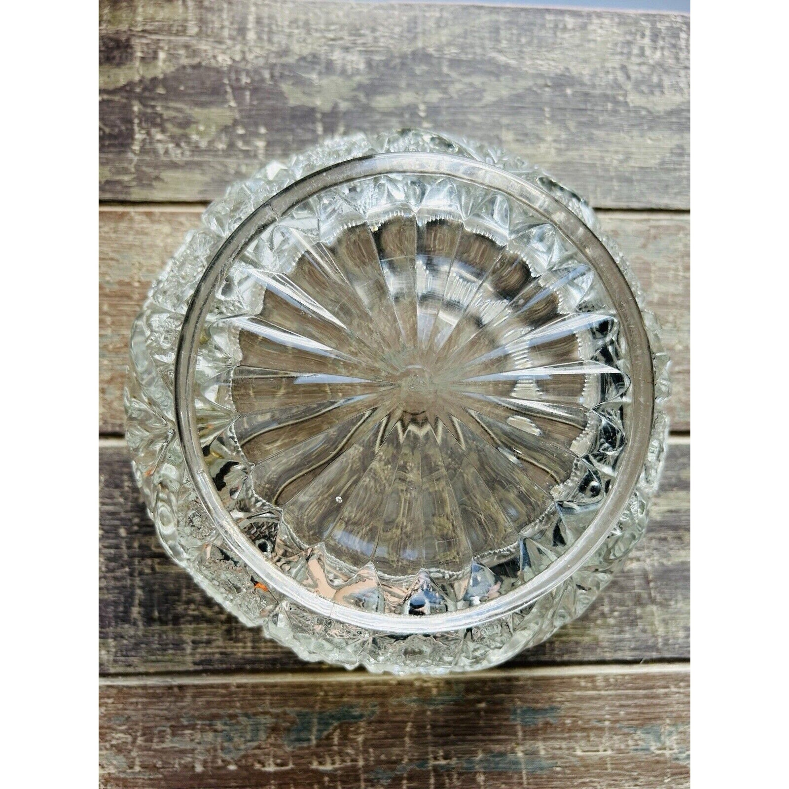 Excellent condition. No chips or cracks. This vintage L.E. Smith bowl is round with a diameter of 7 inches and a height of 4 inches. Made of clear pressed glass in Pennsylvania, it features a hobstar and daisy design with a cupped foot and sawtooth edges. The bowl weighs 3 pounds 10 ounces and is part of the l.e. Smith Crystal product line.