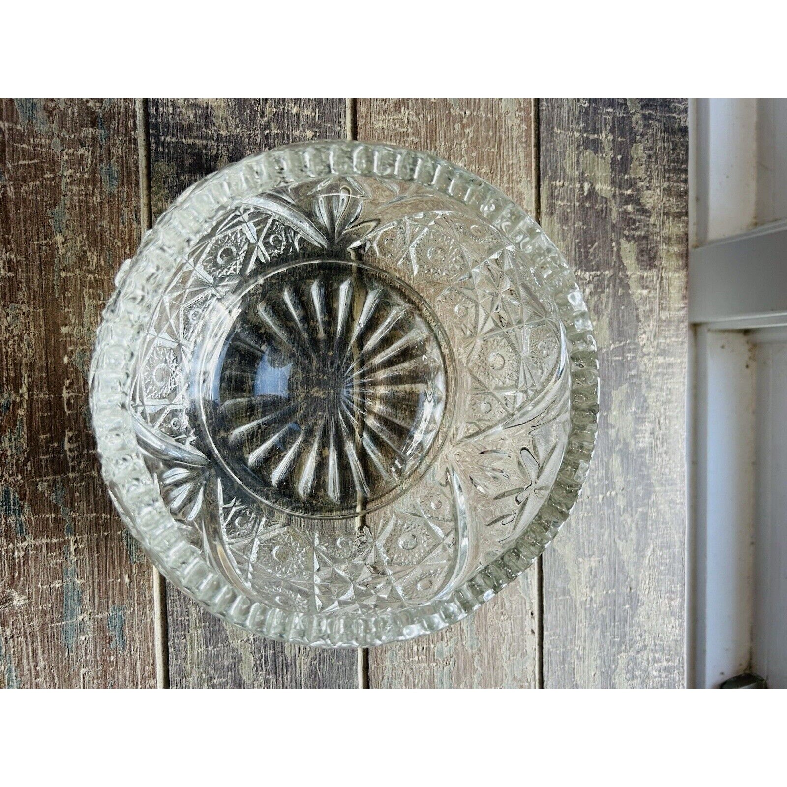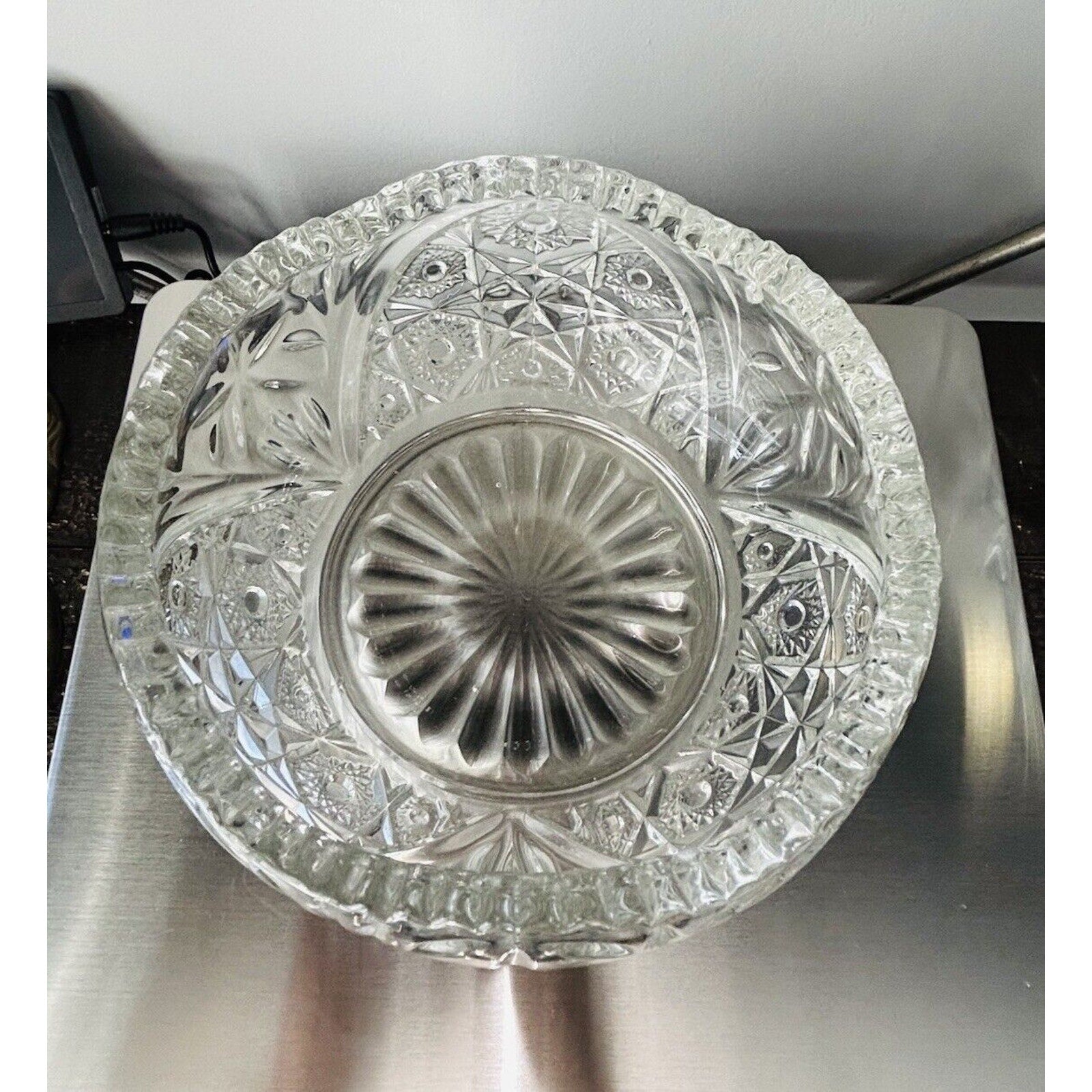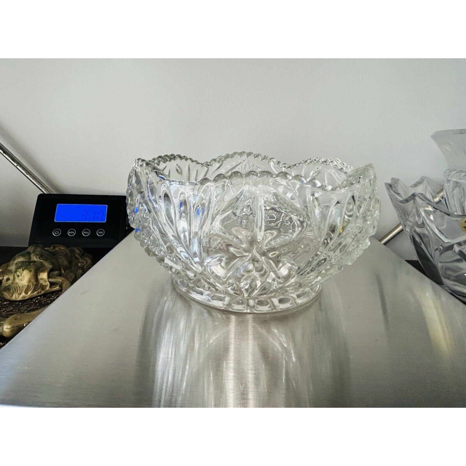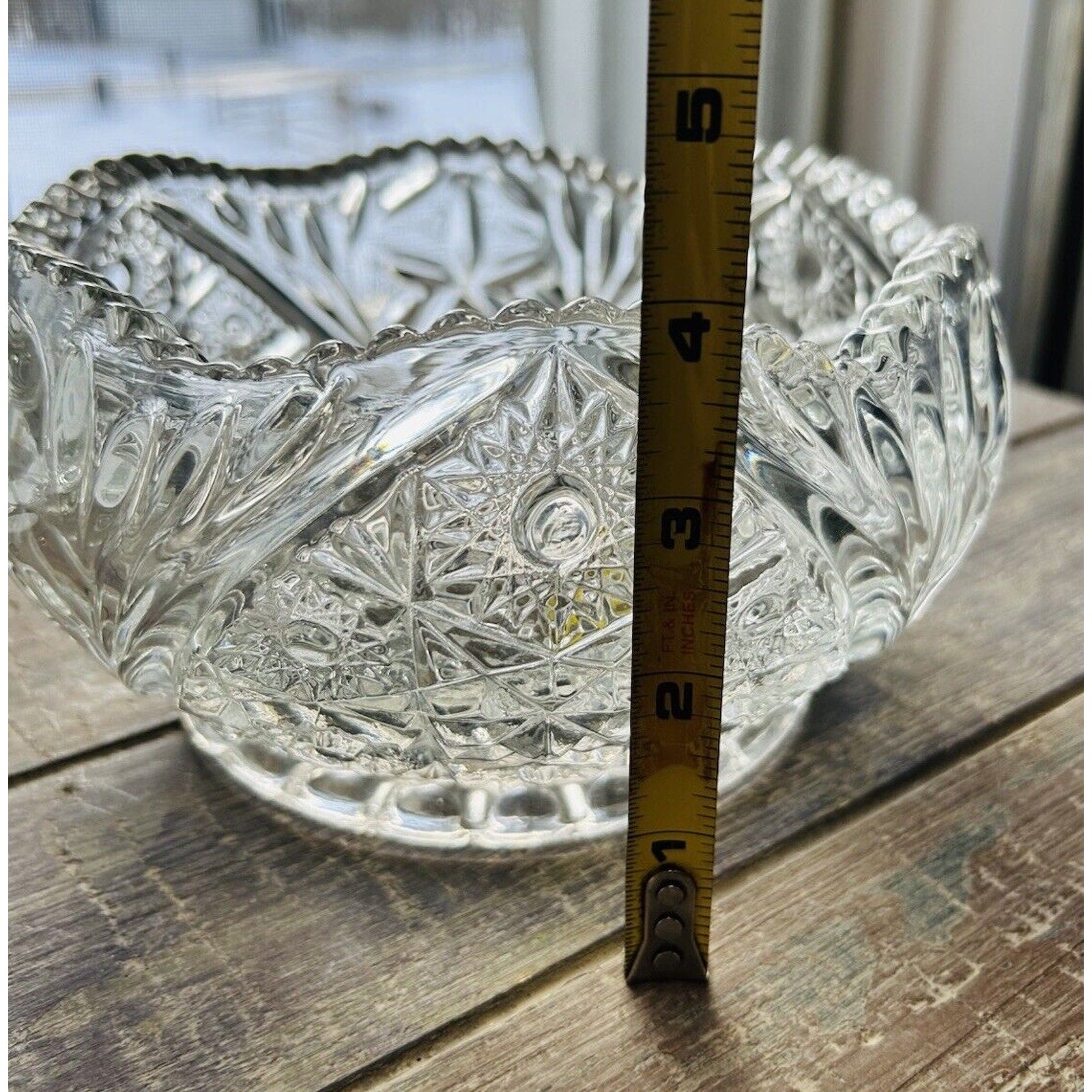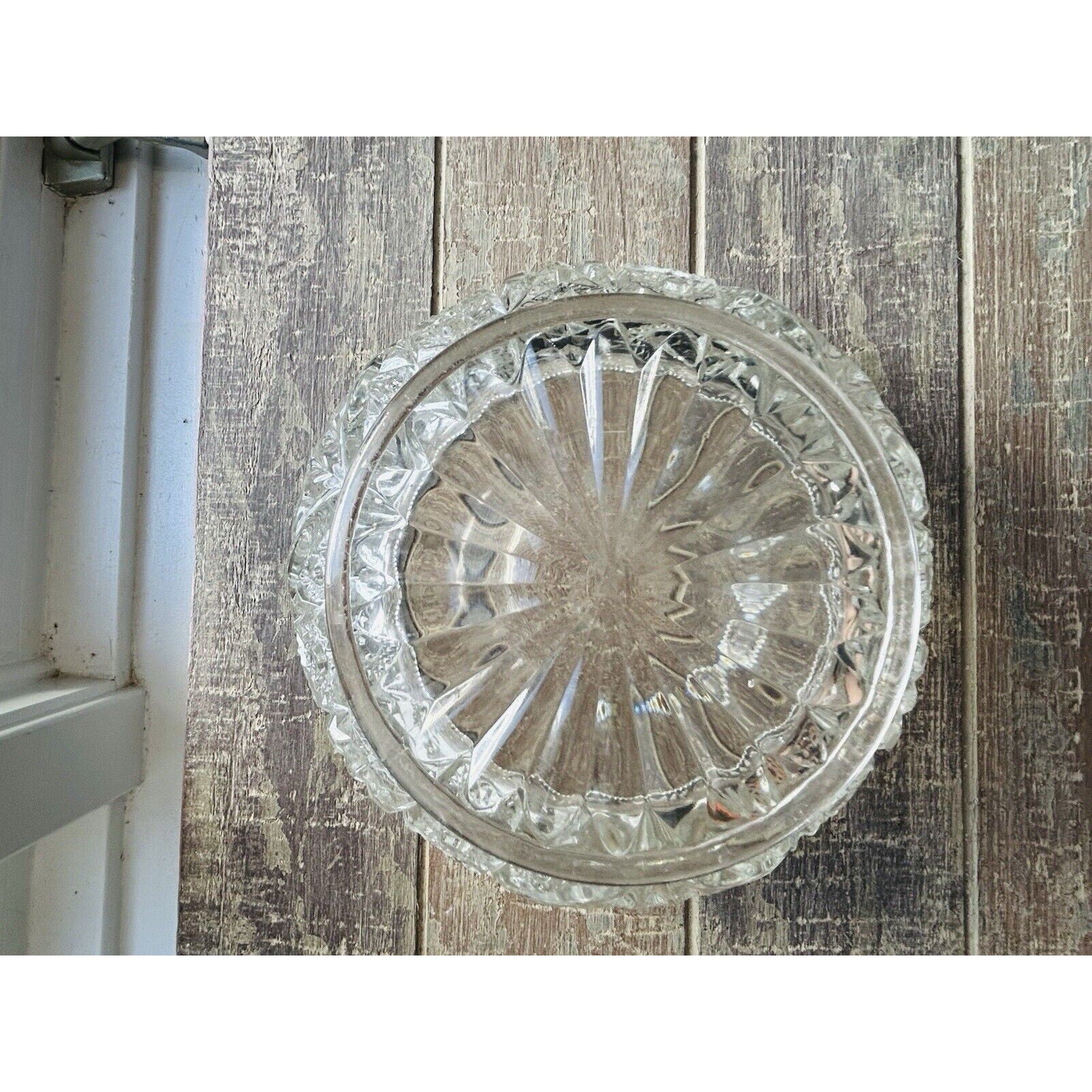Excellent condition. No chips or cracks. This vintage L.E. Smith bowl is round with a diameter of 7 inches and a height of 4 inches. Made of clear pressed glass in Pennsylvania, it features a hobstar and daisy design with a cupped foot and sawtooth edges. The bowl weighs 3 pounds 10 ounces and is part of the l.e. Smith Crystal product line.
