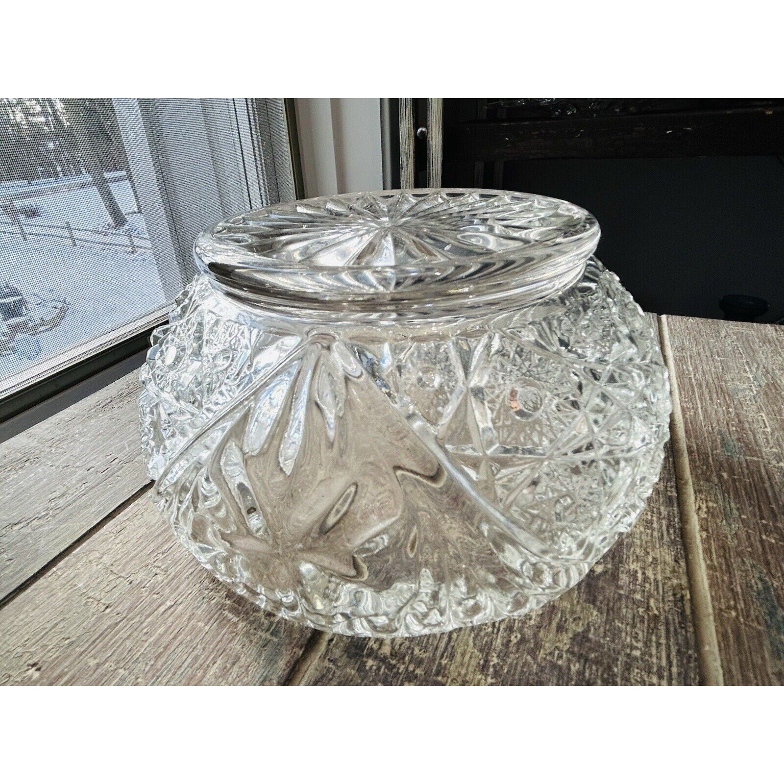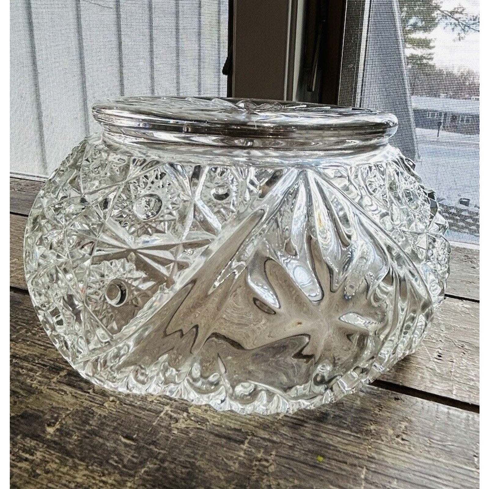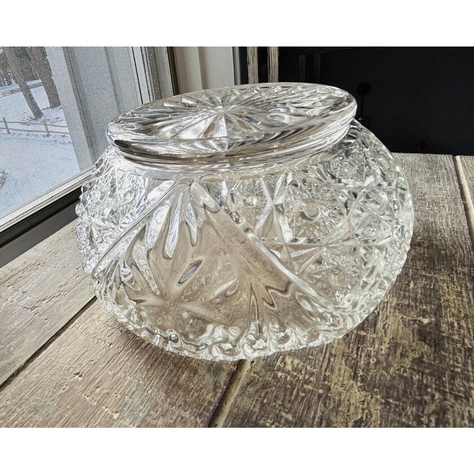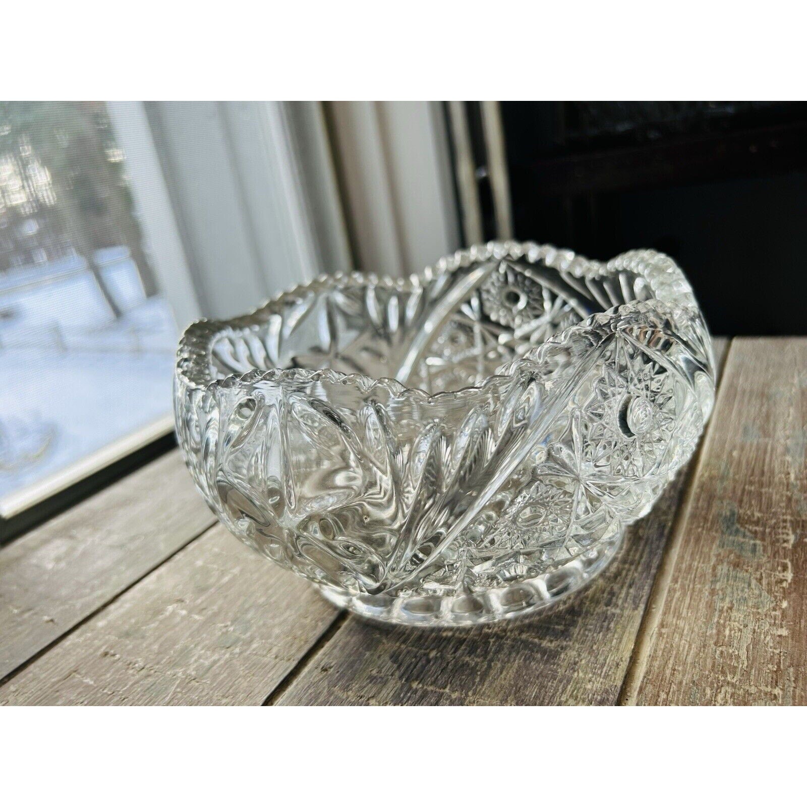 Excellent condition. No chips or cracks. This vintage L.E. Smith bowl is round with a diameter of 7 inches and a height of 4 inches. Made of clear pressed glass in Pennsylvania, it features a hobstar and daisy design with a cupped foot and sawtooth edges. The bowl weighs 3 pounds 10 ounces and is part of the l.e. Smith Crystal product line.