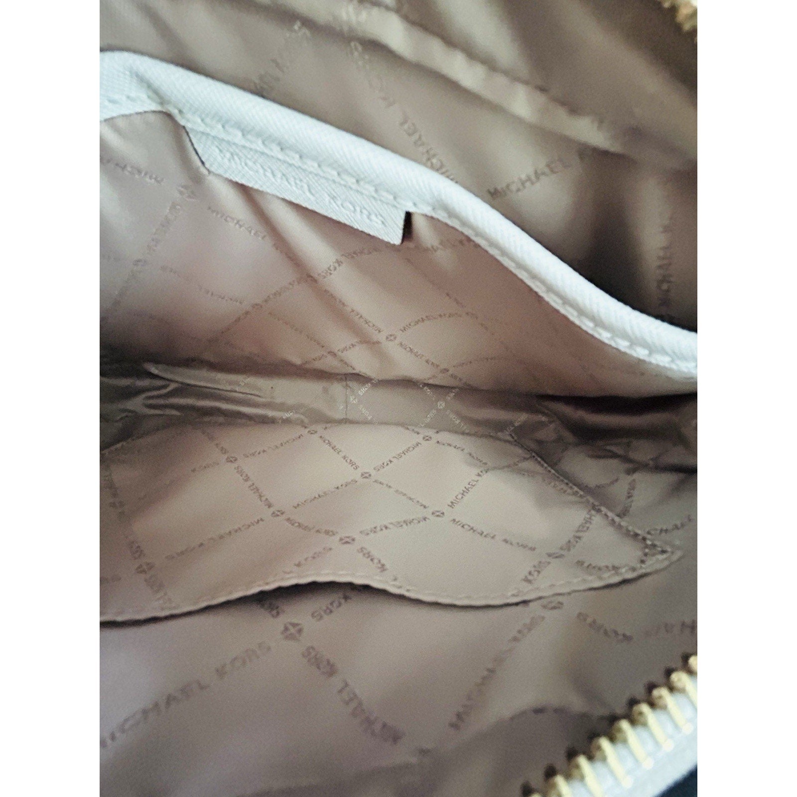 New without tags. This is a new Michael Kors Ginny crossbody bag in white leather. It is medium-sized with a rectangle shape and a zipper closure. The bag has a white handle/strap and gold-colored hardware with studs as accents. The interior has two pockets lined with beige fabric. The bag is from the Michael Kors Selma product line and is designed for women who want an elegant look for party or cocktail occasions. It has a hip strap drop and an adjustable strap for comfortable wear. The bag is accompanied by an original dust bag.