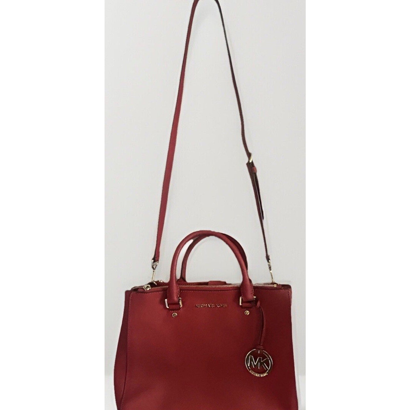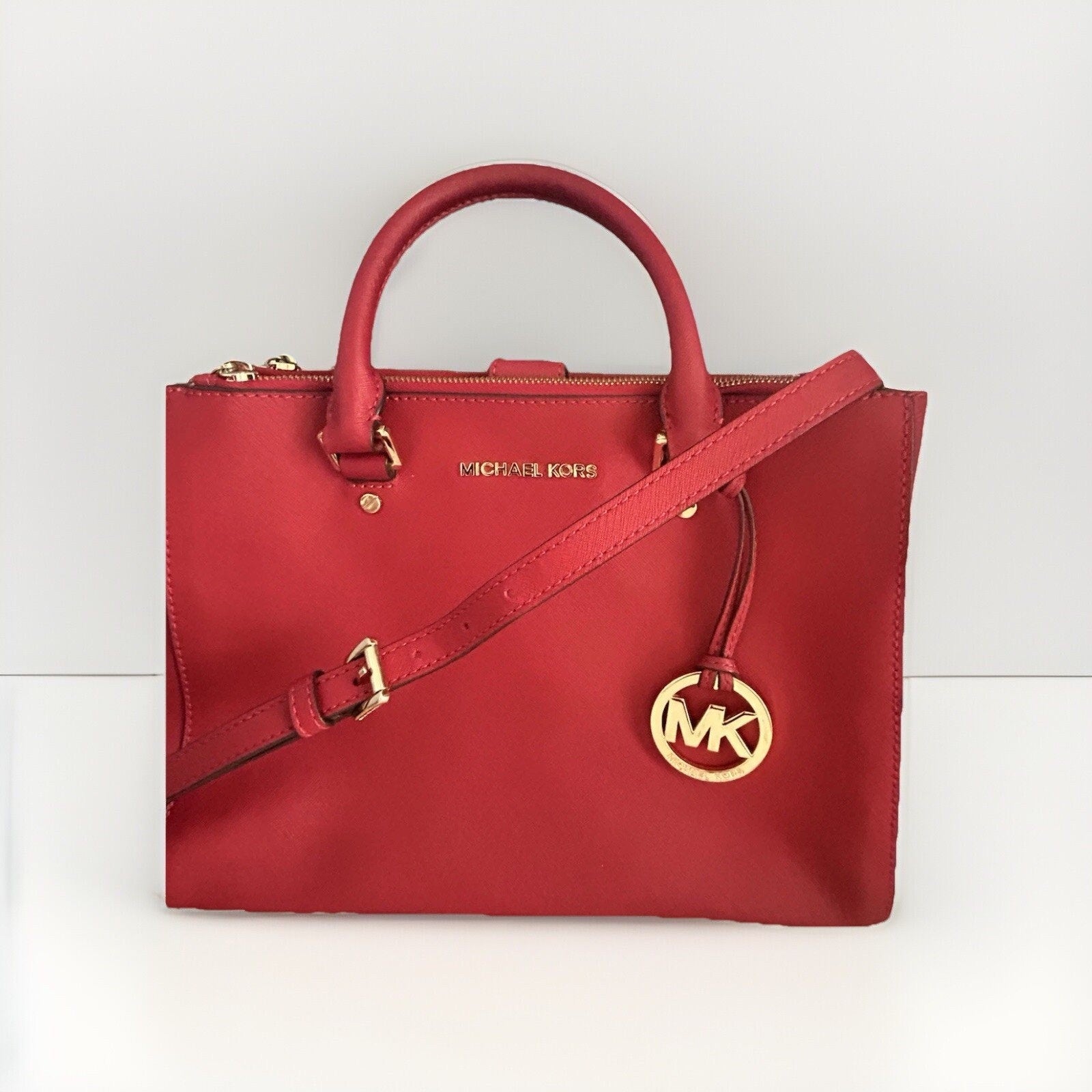 This Michael Kors Sutton satchel is a stylish and authentic addition to any wardrobe. Crafted from saffiano leather with a red exterior color, this medium-sized bag features a square shape and a zip/magnetic closure. The double handles, with a handle drop of 4.5", and the adjustable strap make it easy to carry. MSRP $328.