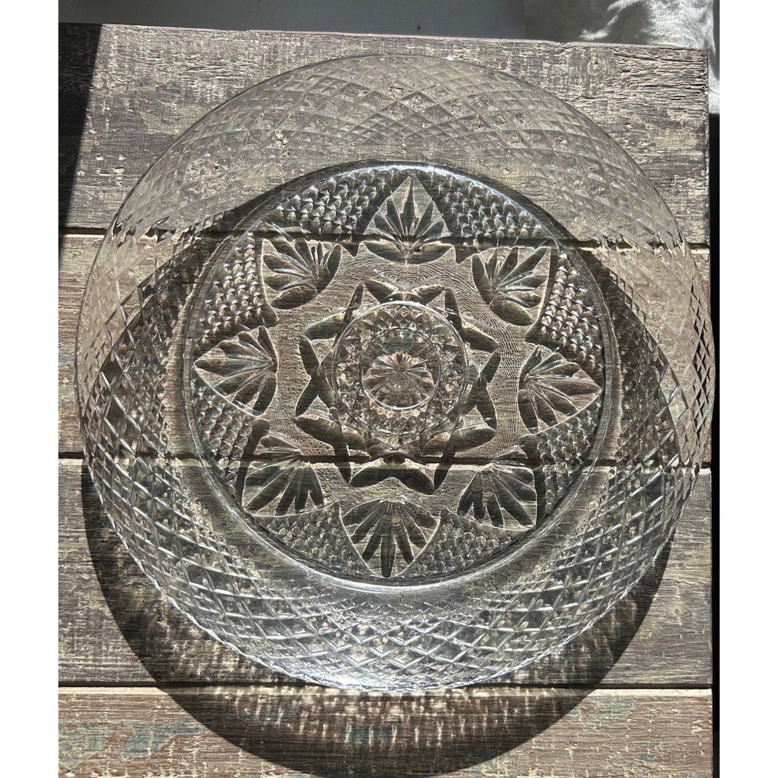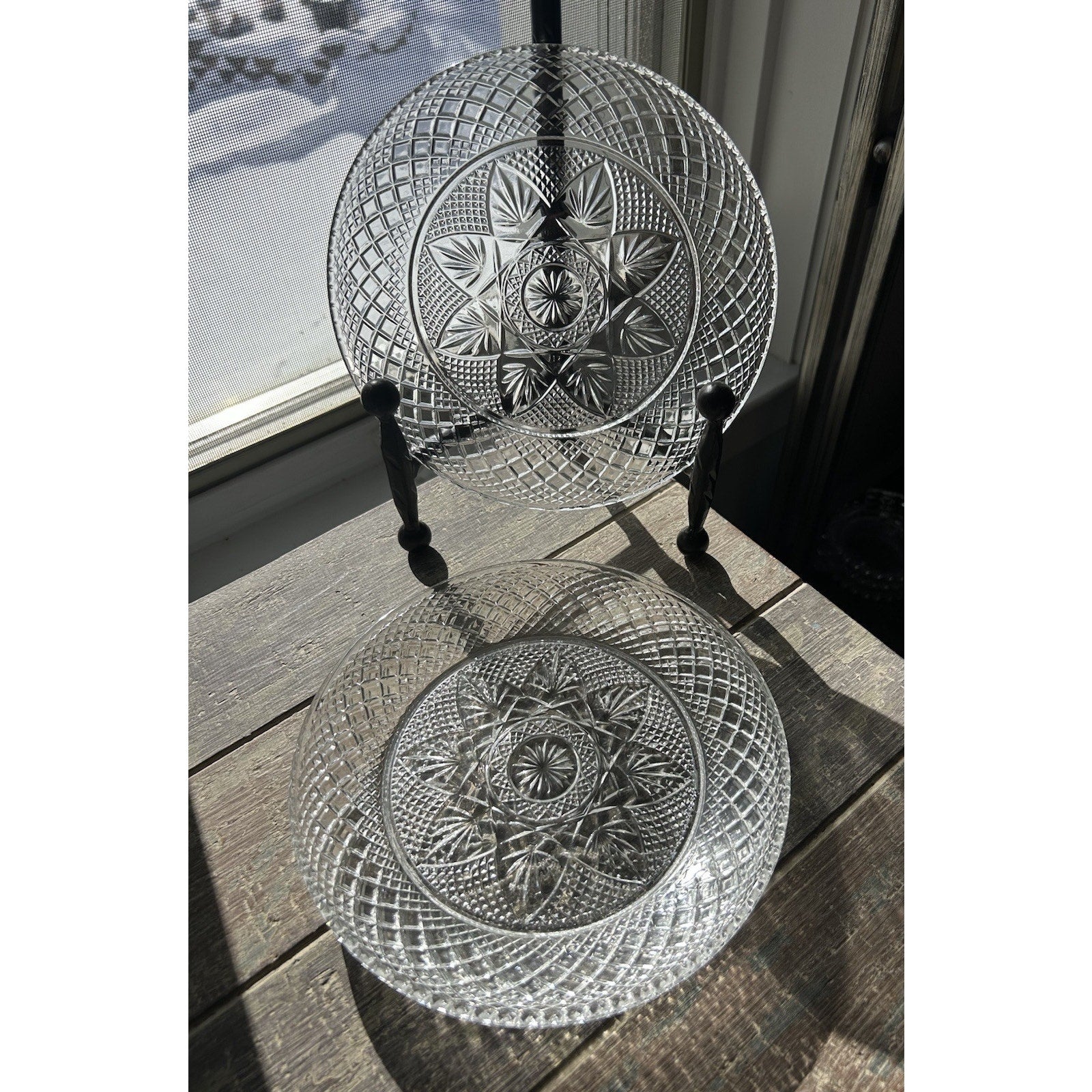 This set includes four vintage Cristal d'Arques-Durand luncheon plates in the Antique Clear pattern. Each 8" plate is made of glossy glass/crystal and features a decorative flower design. Hand wash only. Produced in the United States in the late 20th century, these plates are a contemporary addition for all occasions.