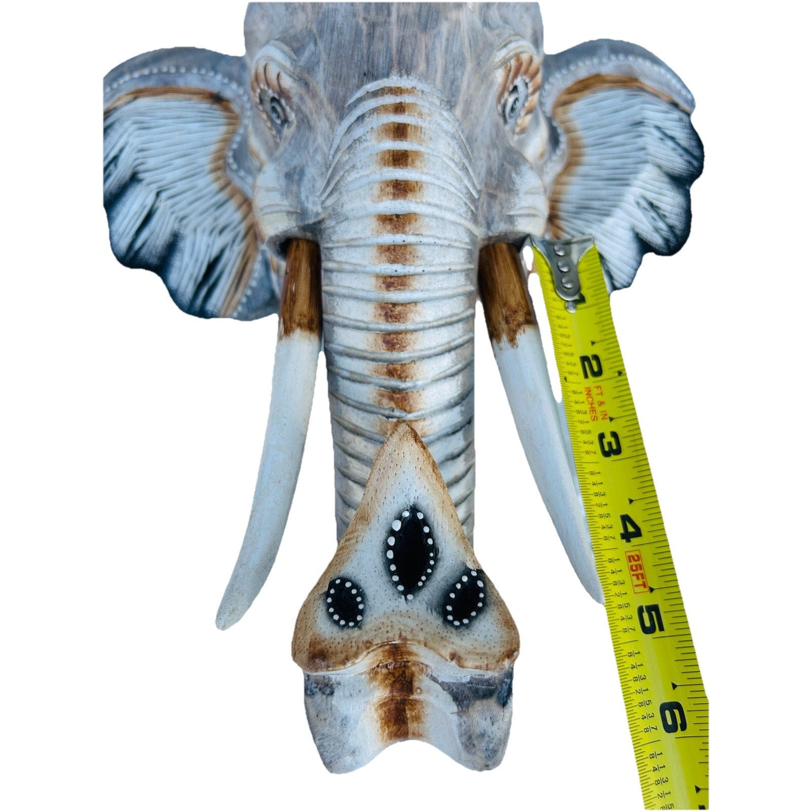 Add a touch of nature to your home decor with this beautiful hand-carved wooden elephant sculpture. The contemporary style sculpture features intricate carvings and is wall-mounted, making it a perfect addition to any room. The large-sized sculpture measures 13.5" in length, 12" in width, and 5" in height, weighing 1 pound 7 ounces.