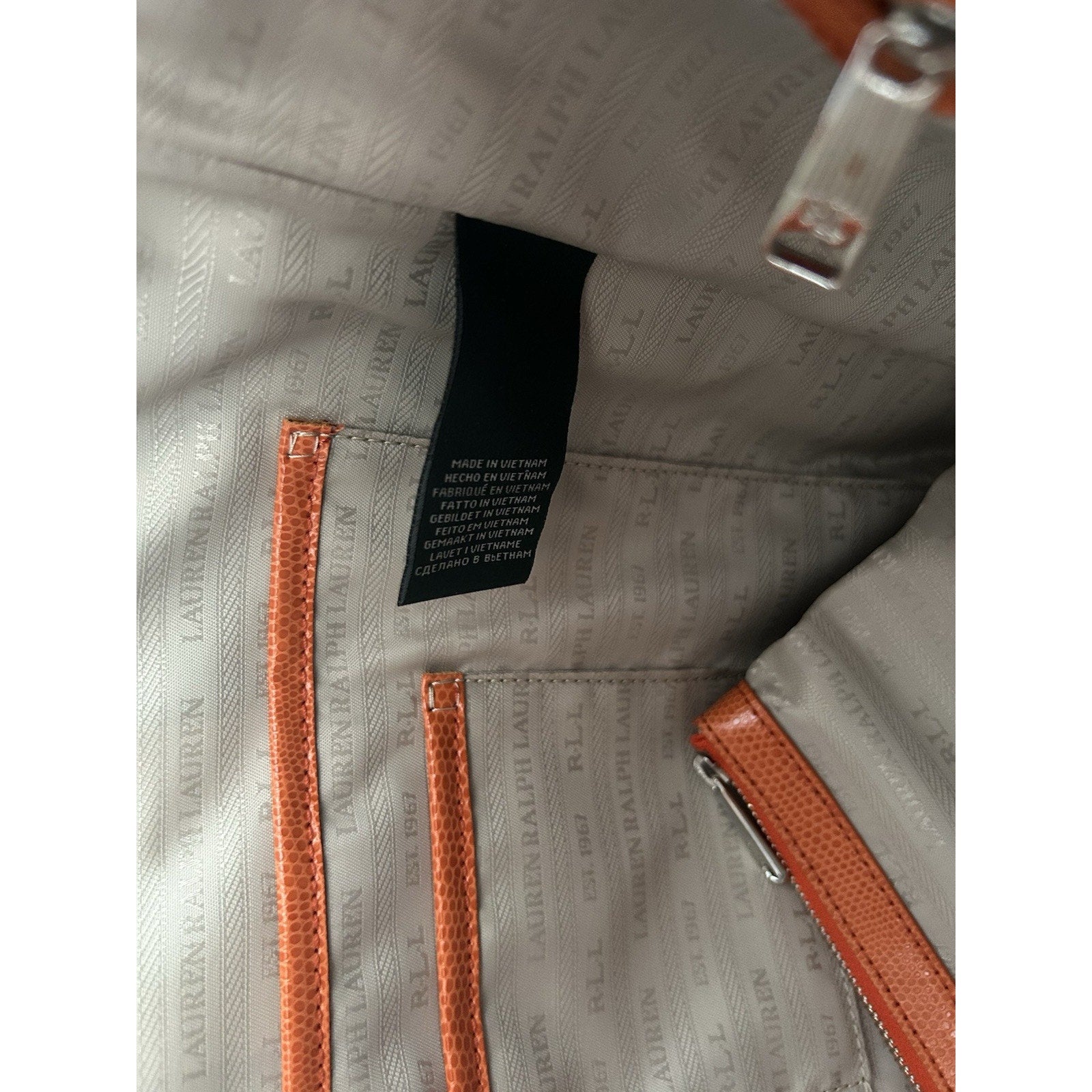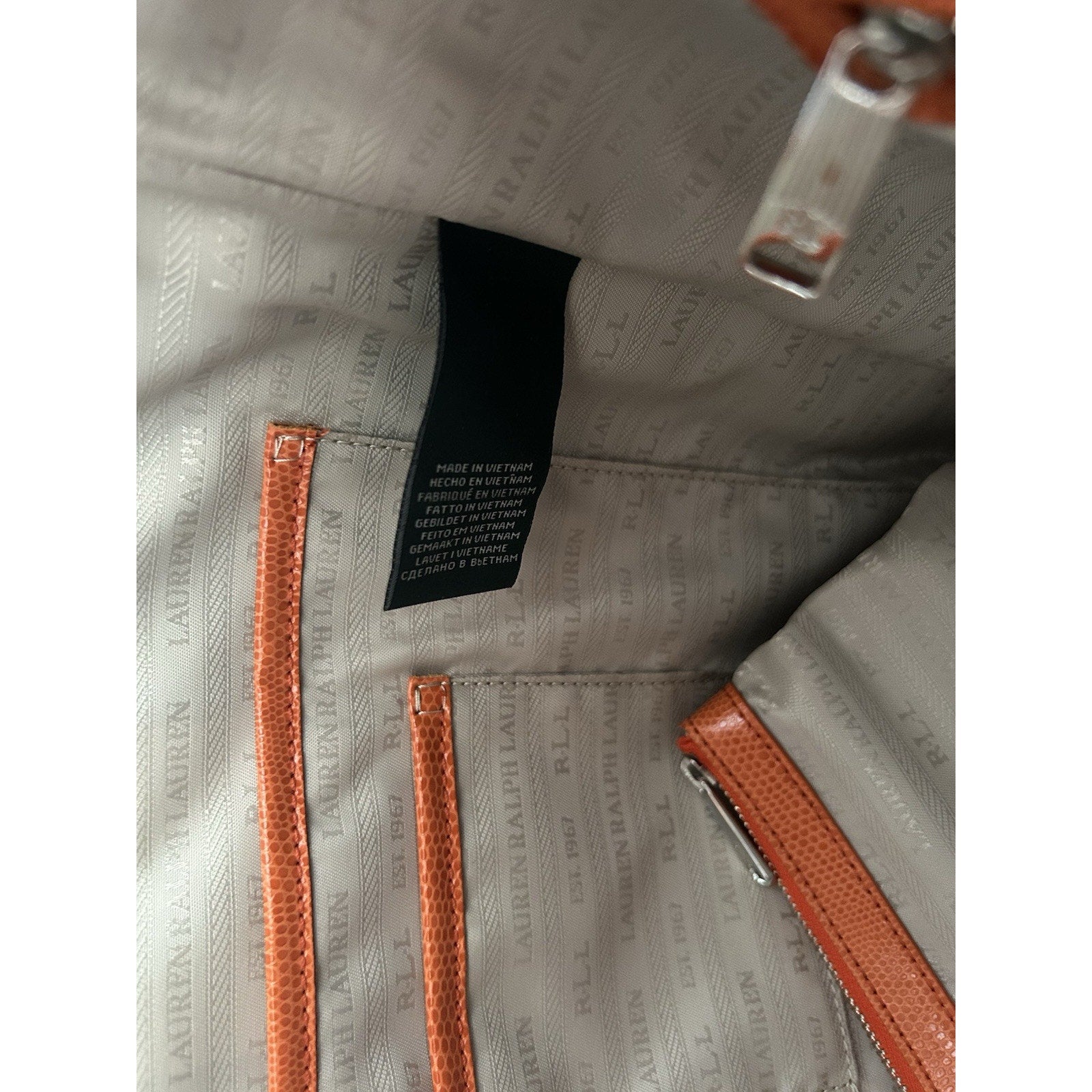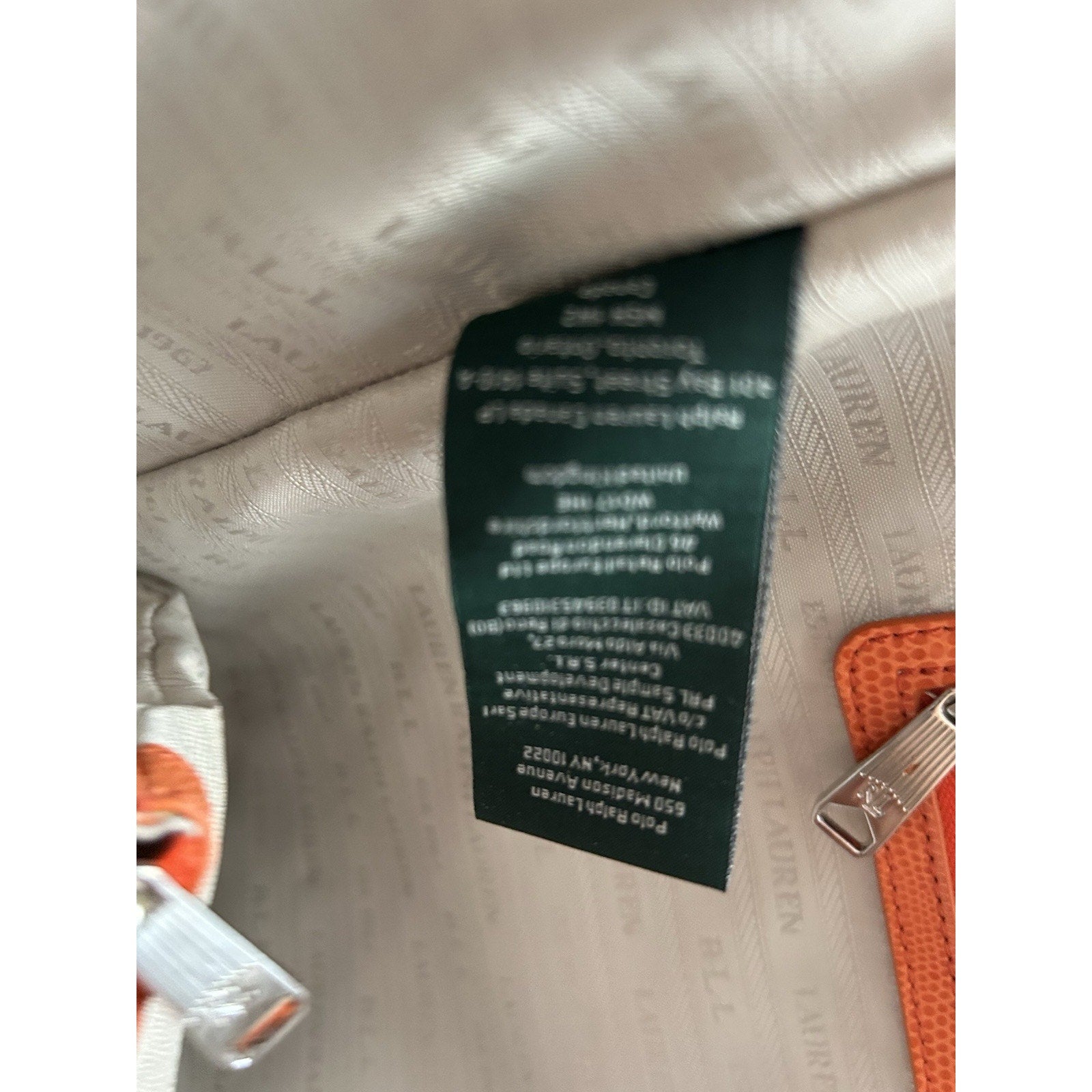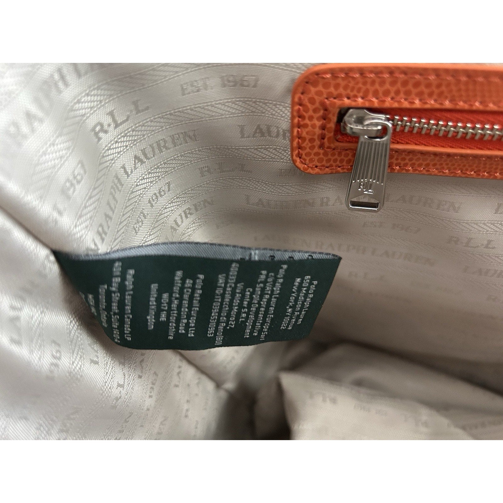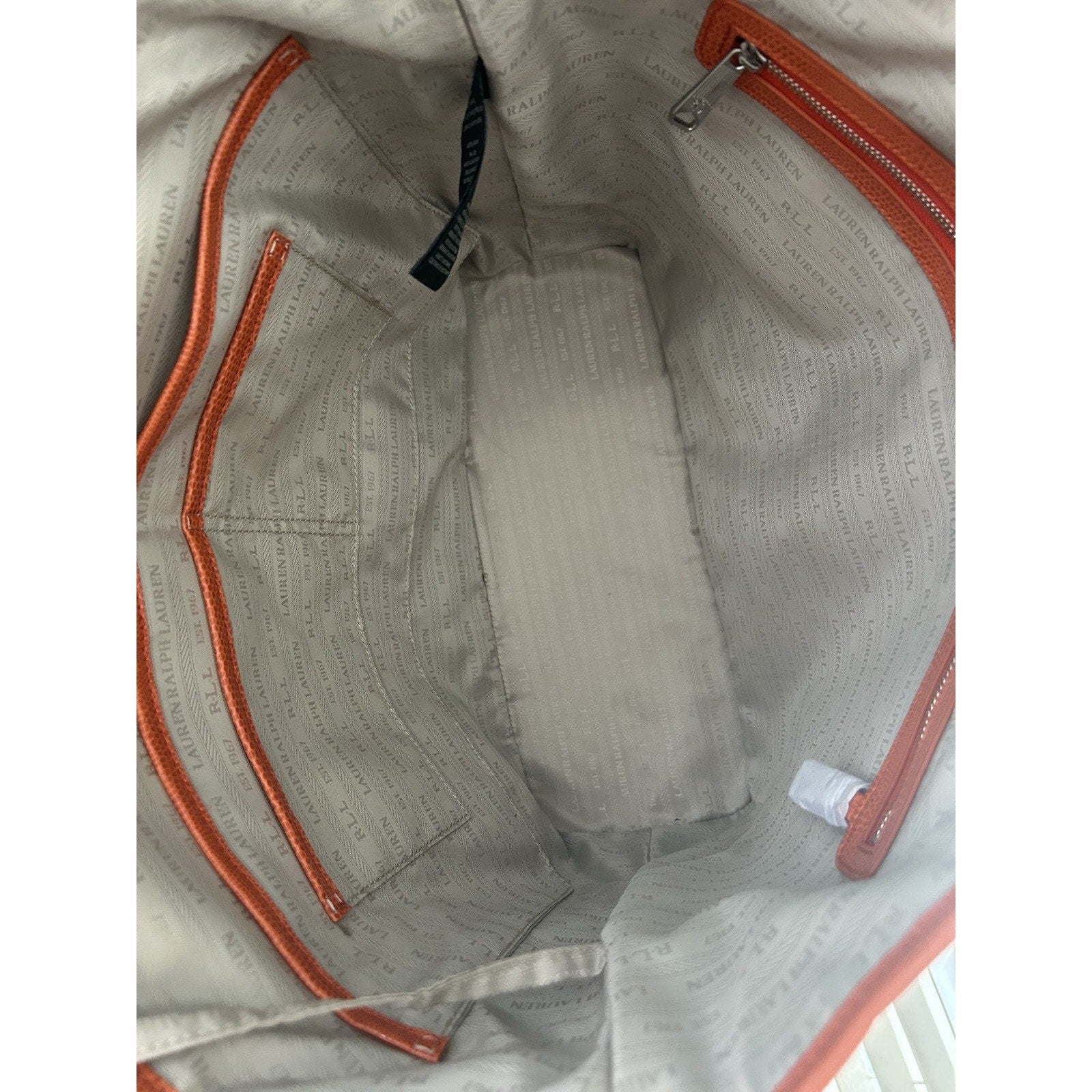 This is a Lauren Ralph Lauren Newton Classic Tote Cosmetic Bag in bright orange. It features leather exterior, canvas lining in beige, and orange handles. The bag has a width of 17”, height of 10.5”, and depth of 5.5”. It has a strap drop of 9.5” and is designed for women with a classic theme.