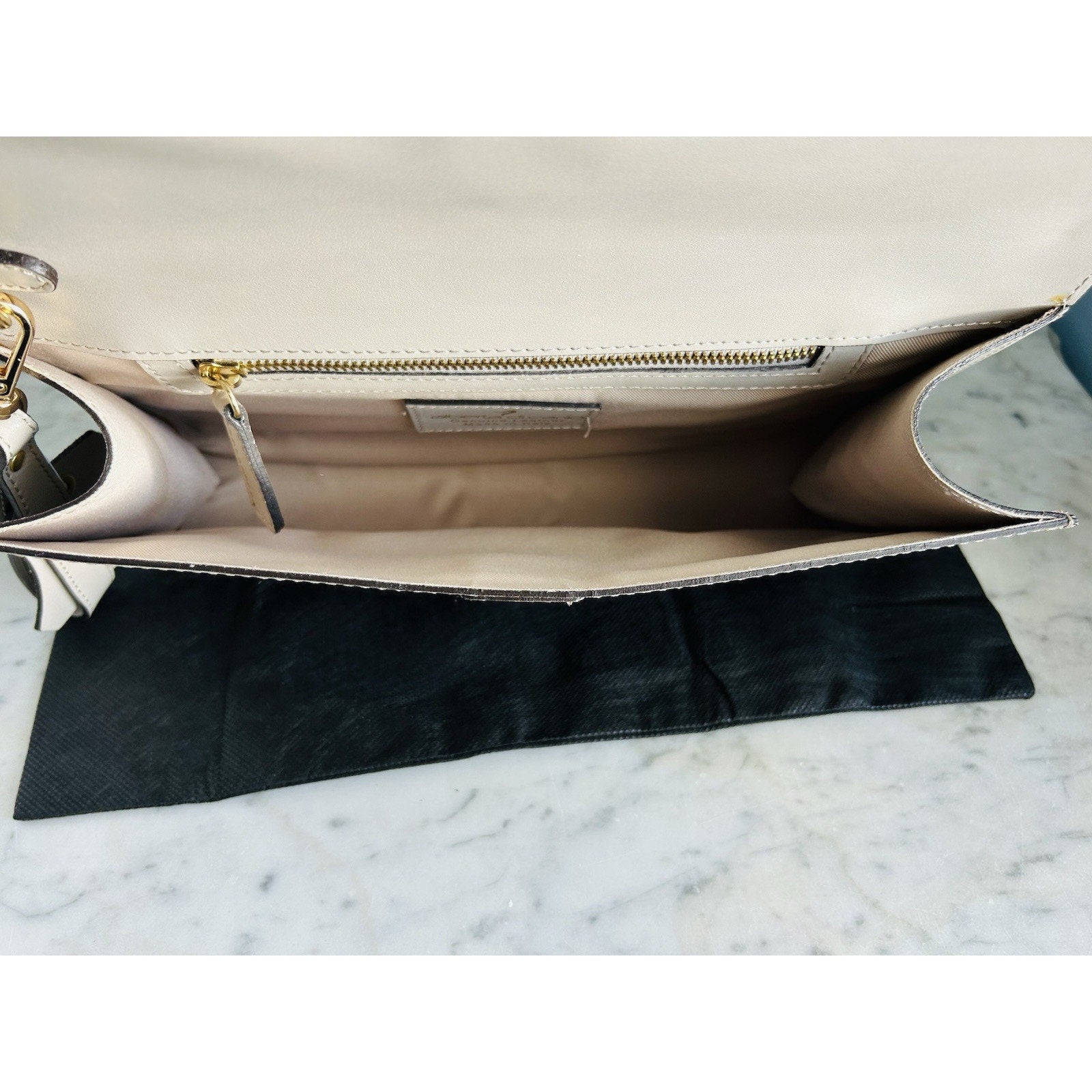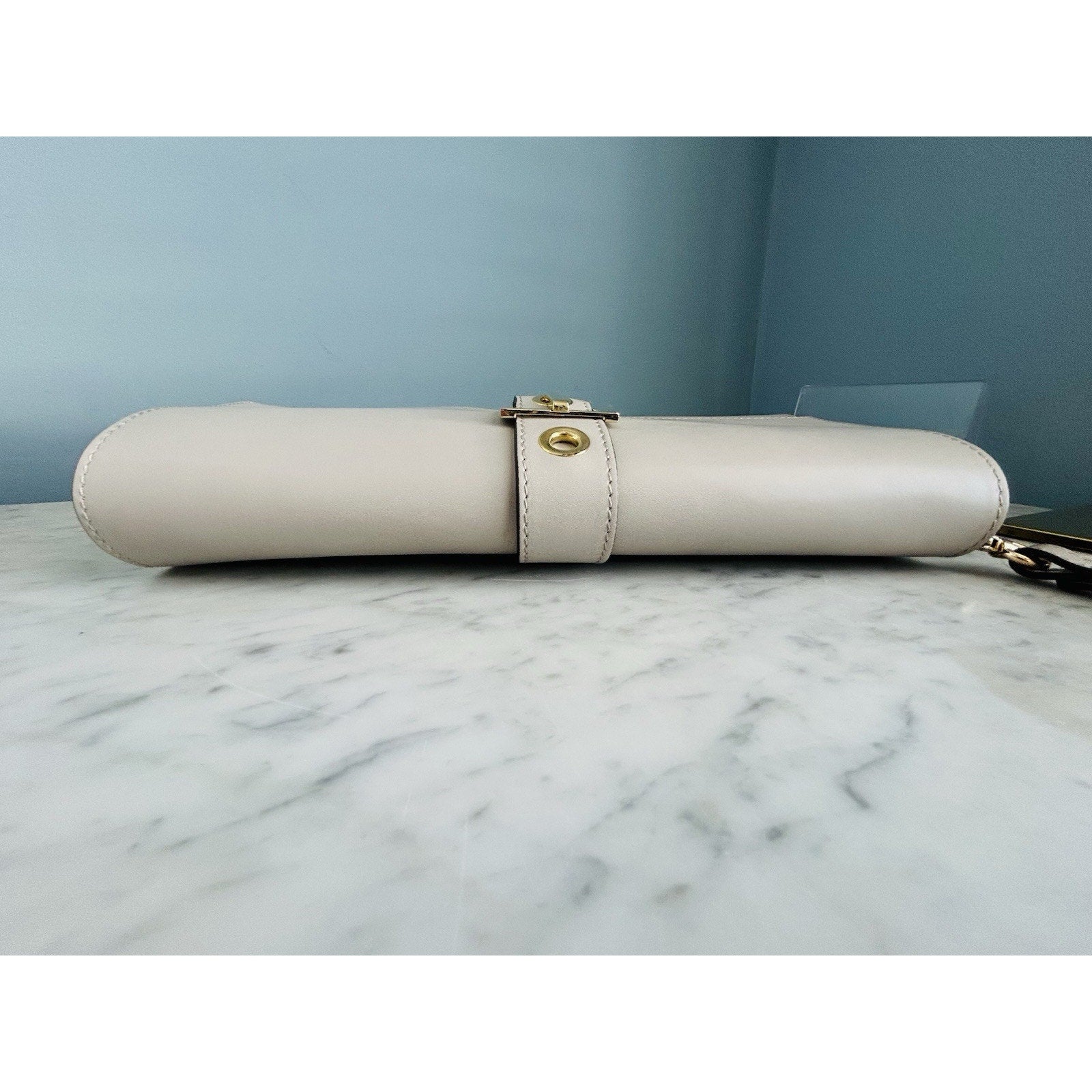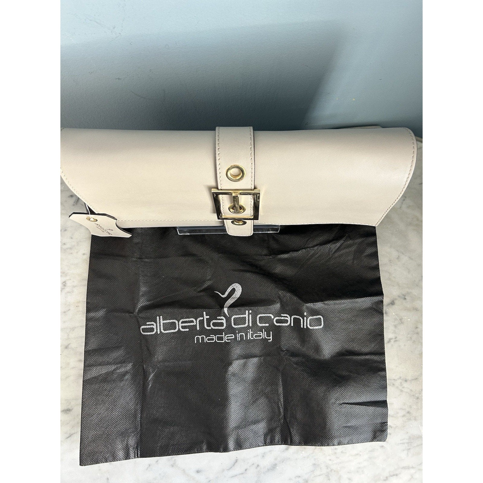 This is a medium-sized Alberta Di Canio clutch handbag made of beige leather. There is a wrist strap, I’d consider this a large wristlet.