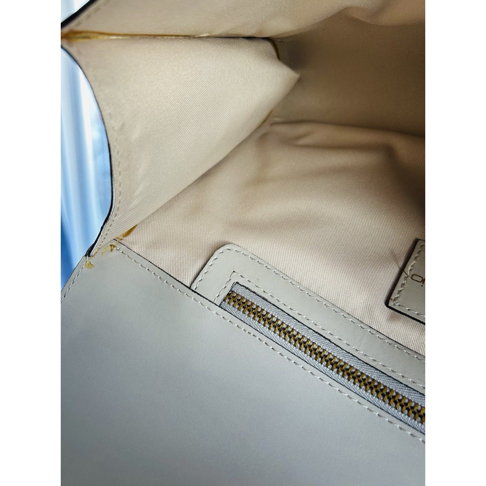 It features a rectangular shape with a magnetic closure, a beige wrist strap, and gold hardware. The interior is lined with beige leather and fabric, with a width of 13 inches, height of 7 3/4 inches, and depth of 2.5 inches. The bag includes a wristlet accessory and is designed with an Italian theme, crafted in Italy.