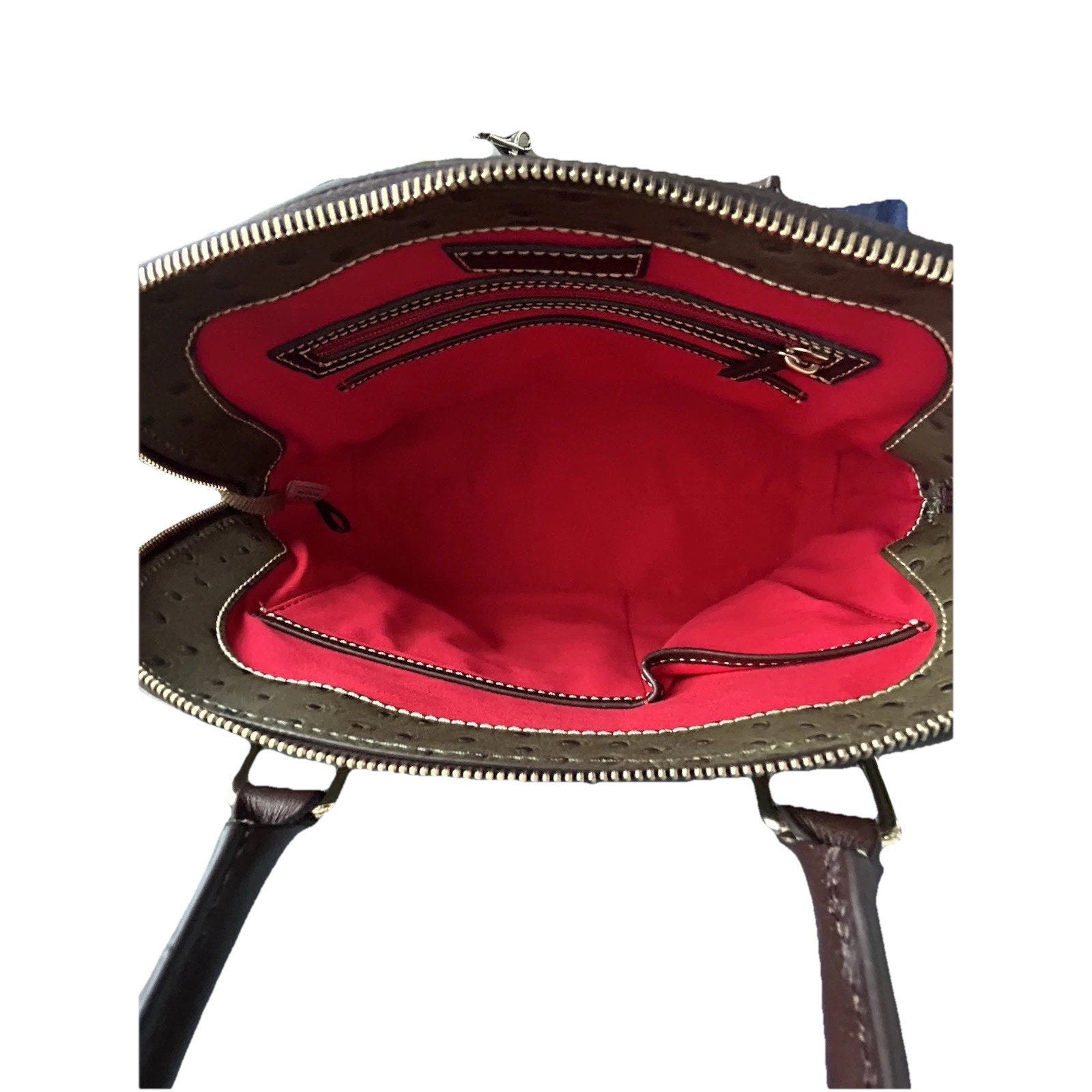 This is a NWT Dooney & Bourke genuine ostrich leather Carter satchel in olive brown color. It features a dome shape with a zip closure, double handles in brown leather, and silver hardware. The satchel has a medium size with a 10" height, 13" width, and 5" depth. It includes pockets, zip-around feature, red canvas lining, and a 4" handle drop. The exterior is made of leather with an ostrich pattern design.