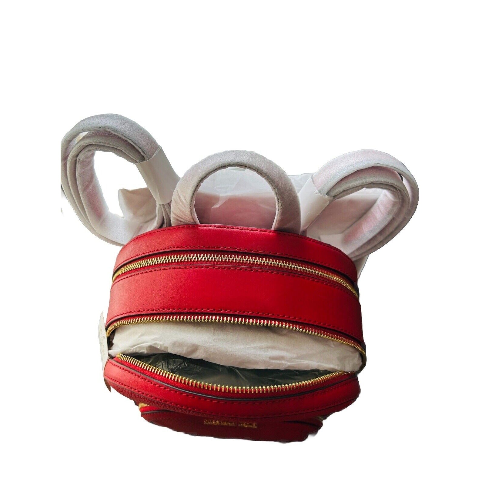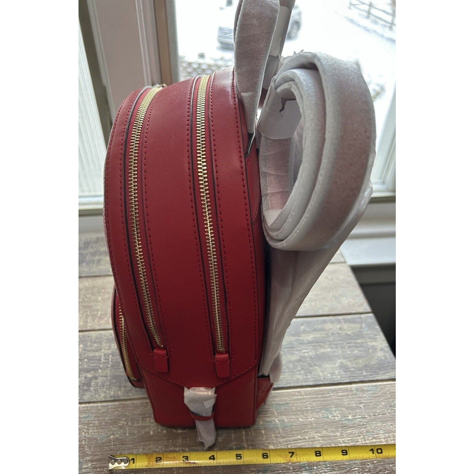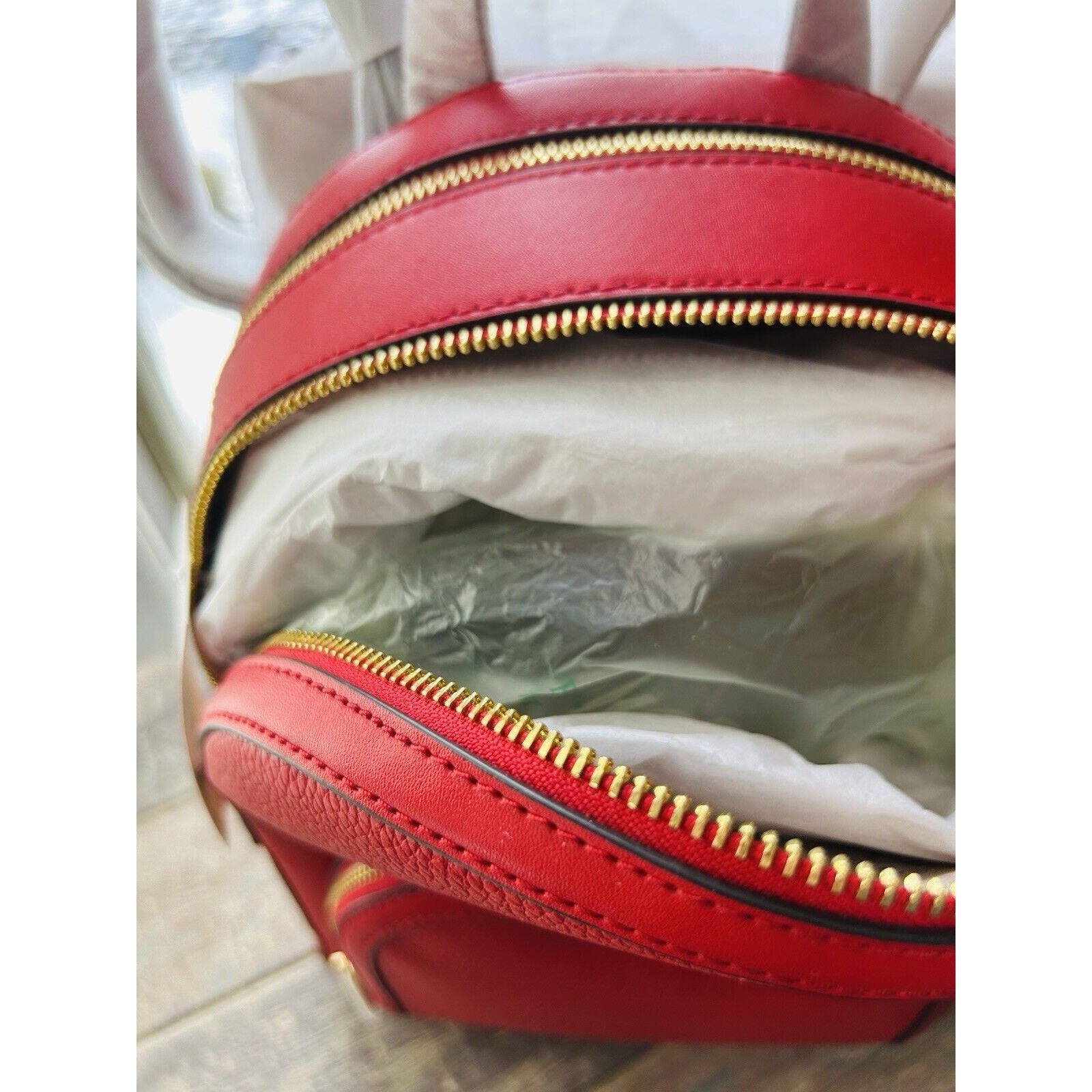 New with tags - excellent condition with all original stuffing and paper. Great b Valentine’s Day gift! This is a Michael Kors Jaycee Medium Zip Pocket Backpack in a bright red leather exterior. The backpack features double handles, a zip closure, and gold-plated hardware. It has a pebbled design with a satin fabric lining. The bag has a medium size with dimensions of 9.5" width, 12" height, and 5" depth. It is part of the Michael Kors Adina model and includes pockets for storage.
