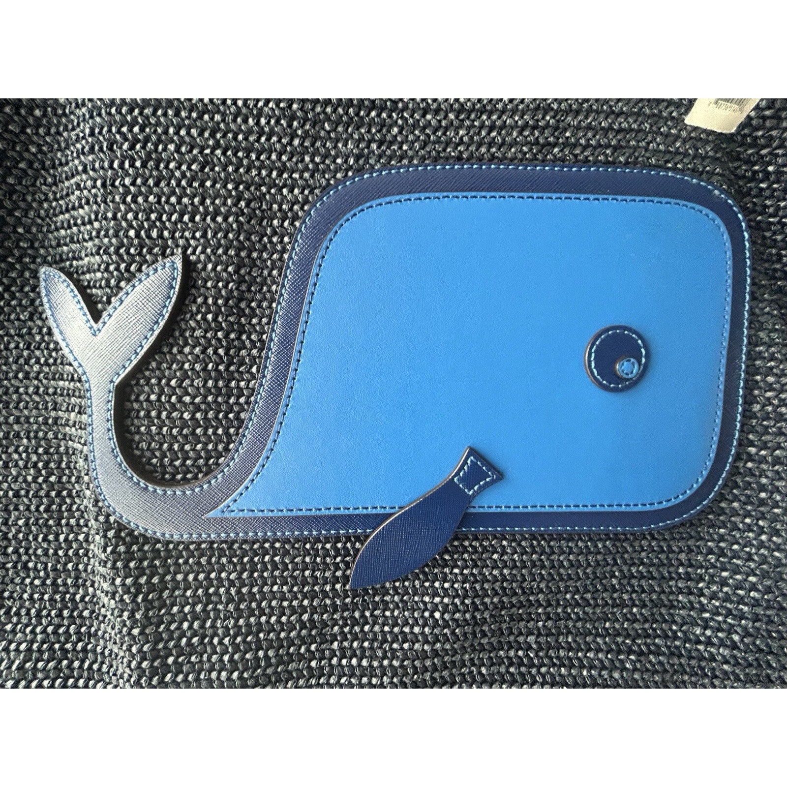 This is a large Tory Burch Knotted Whale Tote handbag in navy blue, ideal for beach or pool vacations. It features ivory double handles with a 12" drop, a canvas and leather exterior, gold hardware, and a blue canvas lining. The tote has a nautical theme with a knotted whale design, inner pockets, and is lightweight and foldable.