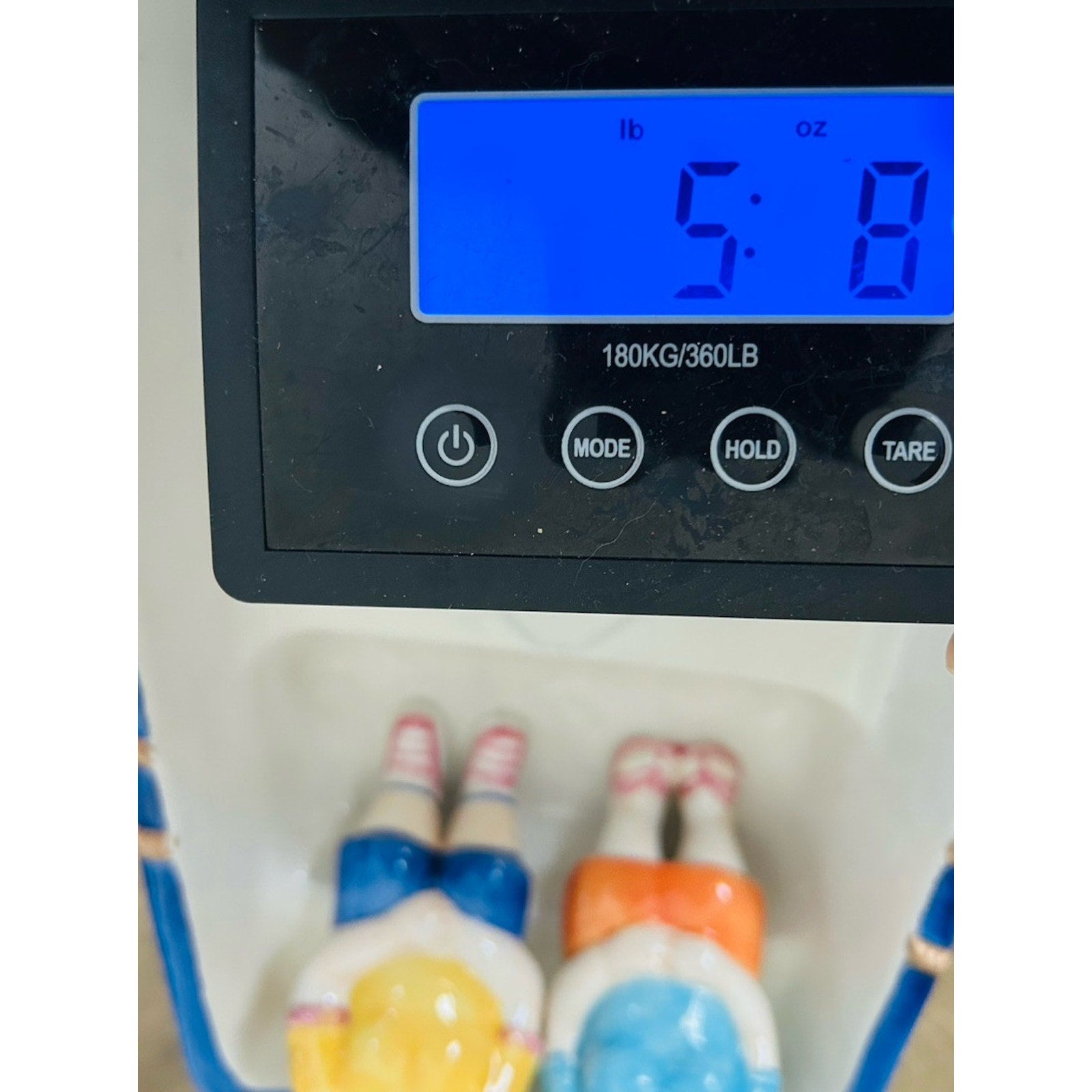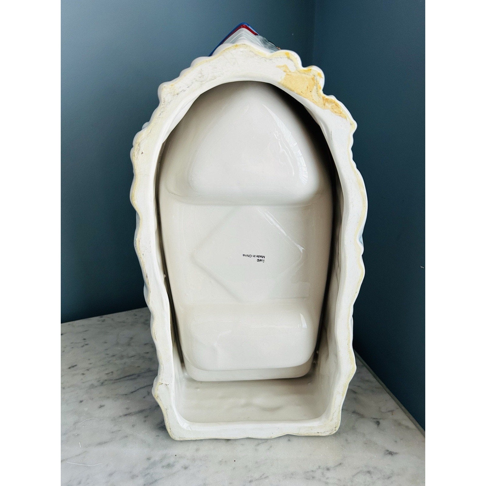 This is a vintage ceramic boat-shaped platter by FWC, featuring a nautical theme with a multi-color design. It measures 16" in length and 6.5" in height, perfect for serving chips, dip, or salsa at a birthday party or beach gathering. The platter has a printed backstamp and weighs 5 pounds 8 ounces, showcasing a unique pottery production technique.