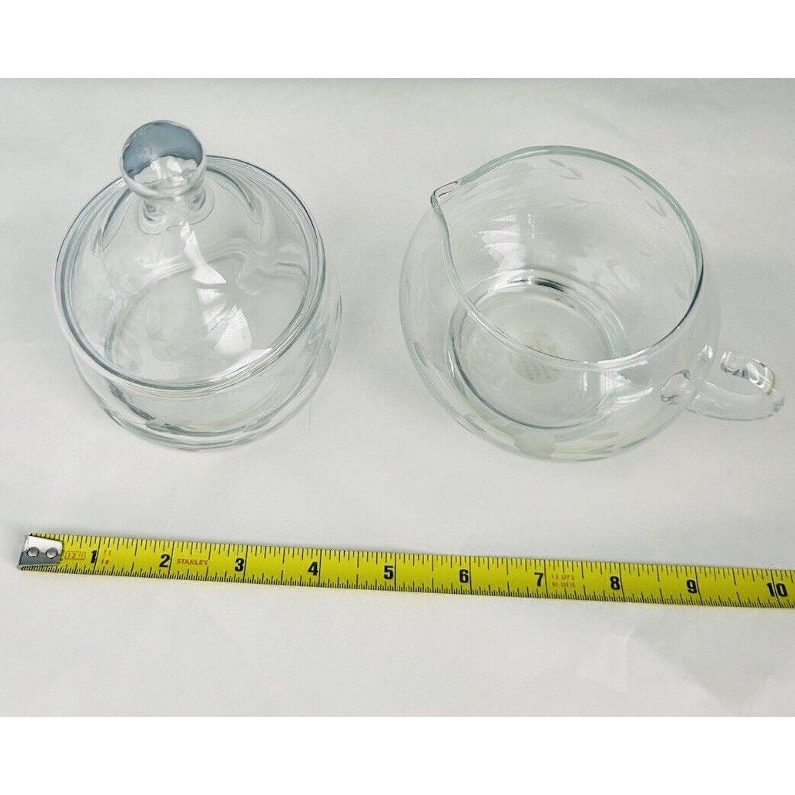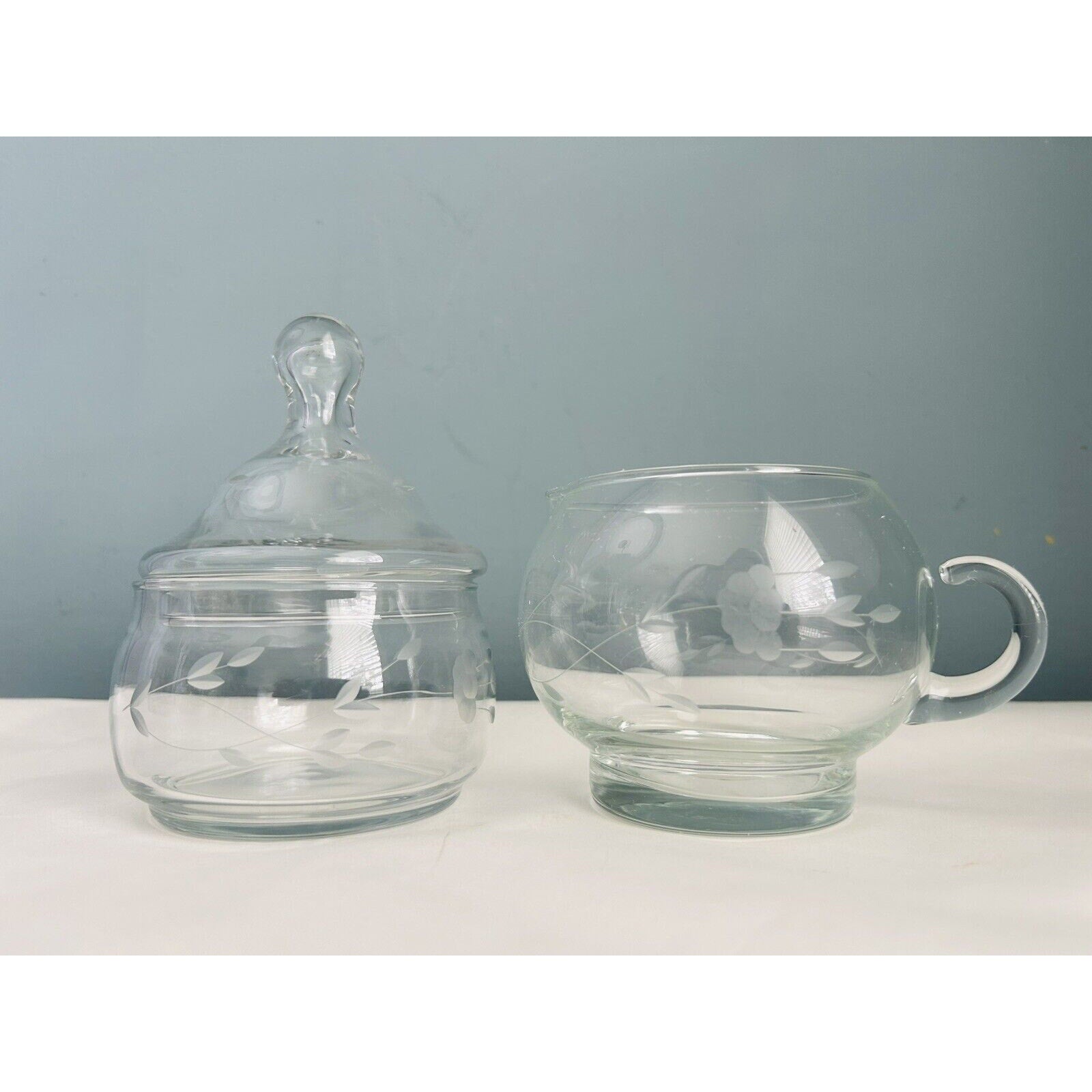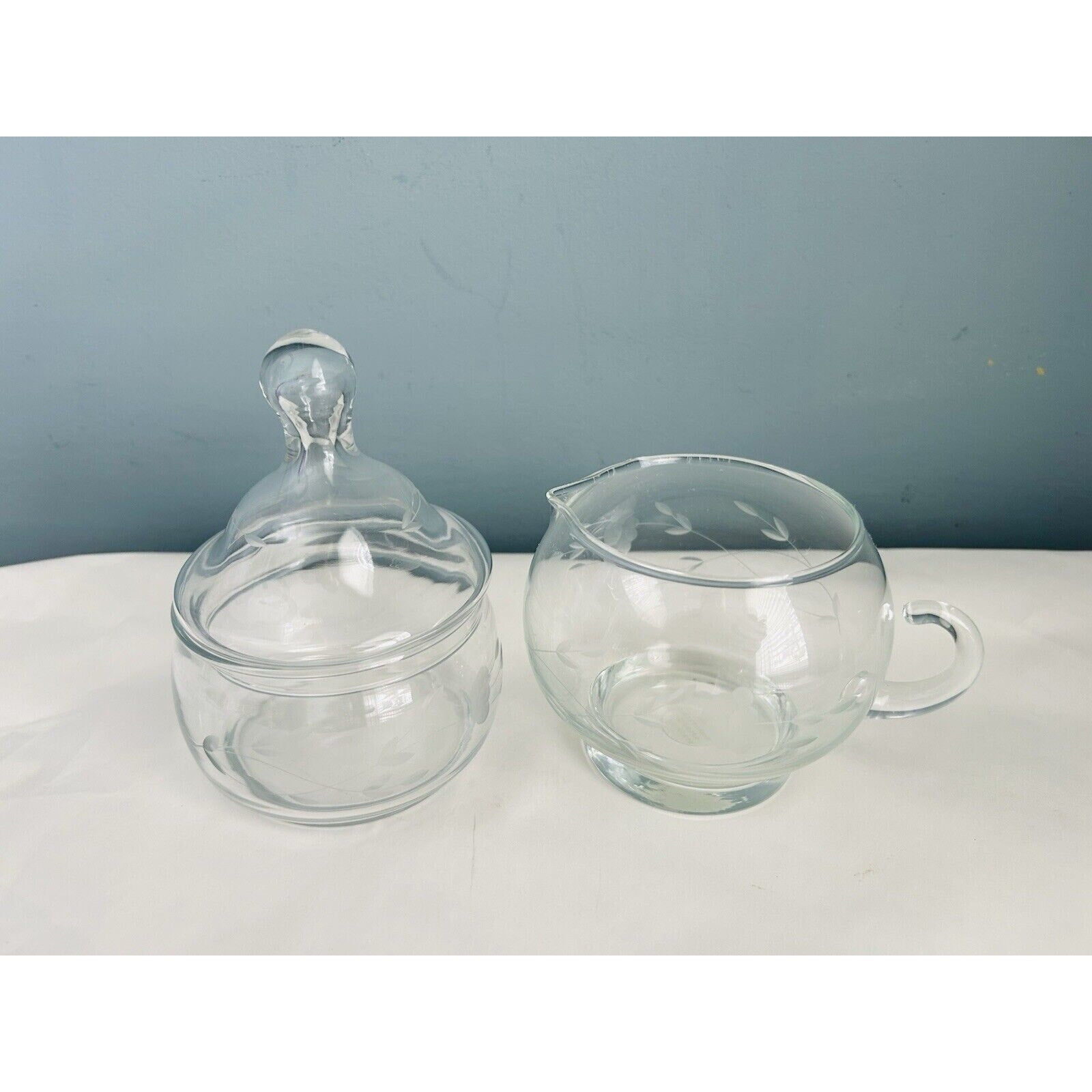 Princess House Heritage Creamer & Sugar Set Lid Vintage Etched Glass Floral