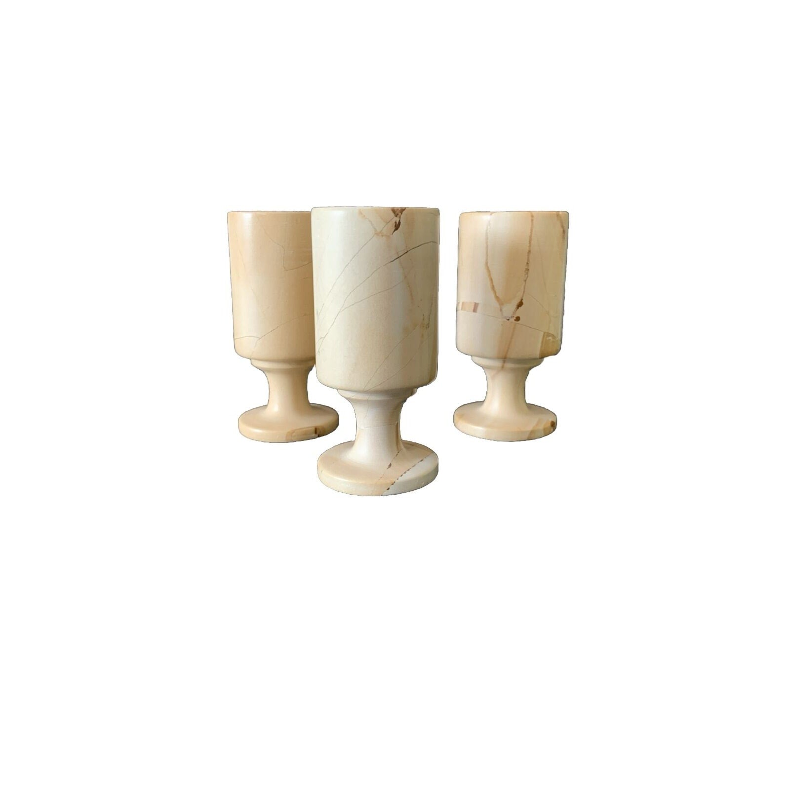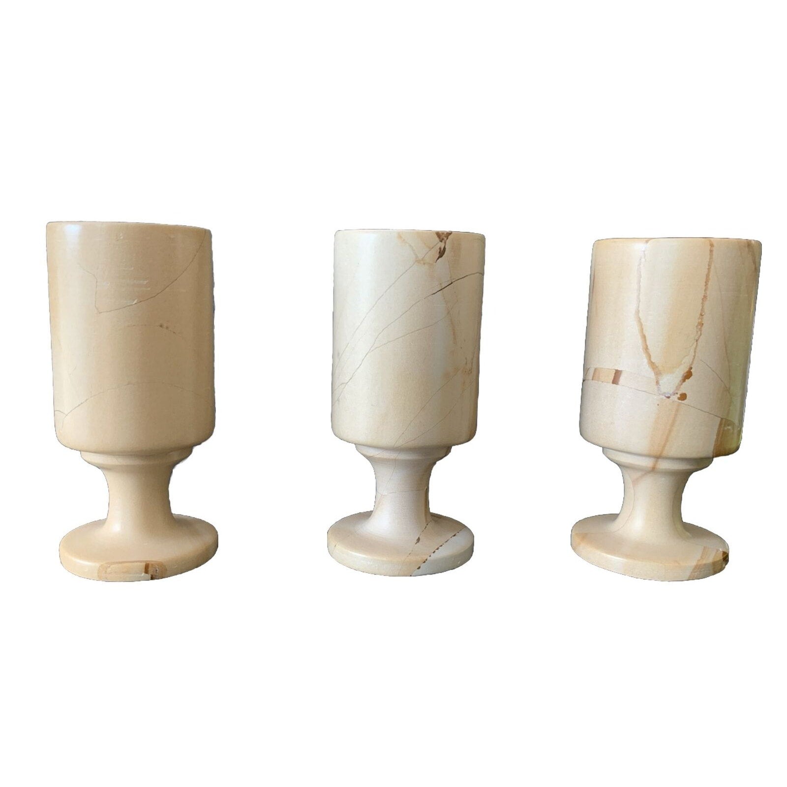 Elevate your drinking experience with this exquisite set of three handmade shot glasses/cups. Made from beautiful brown marbled onyx, these vintage cups have a 2 oz capacity and stand at 4 inches tall. Perfect for serving your favorite cold beverages, each cup has an item diameter of 1.5 inches and is lightweight at just .5 ounces.