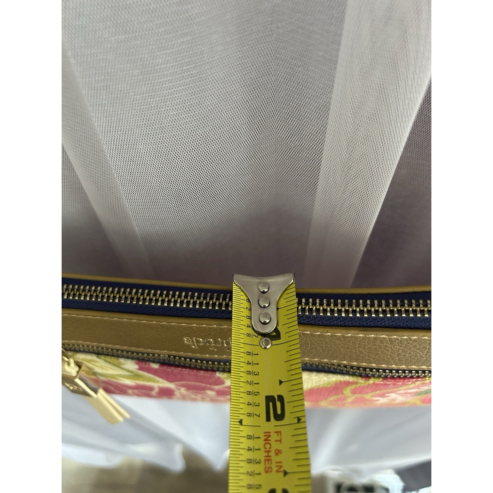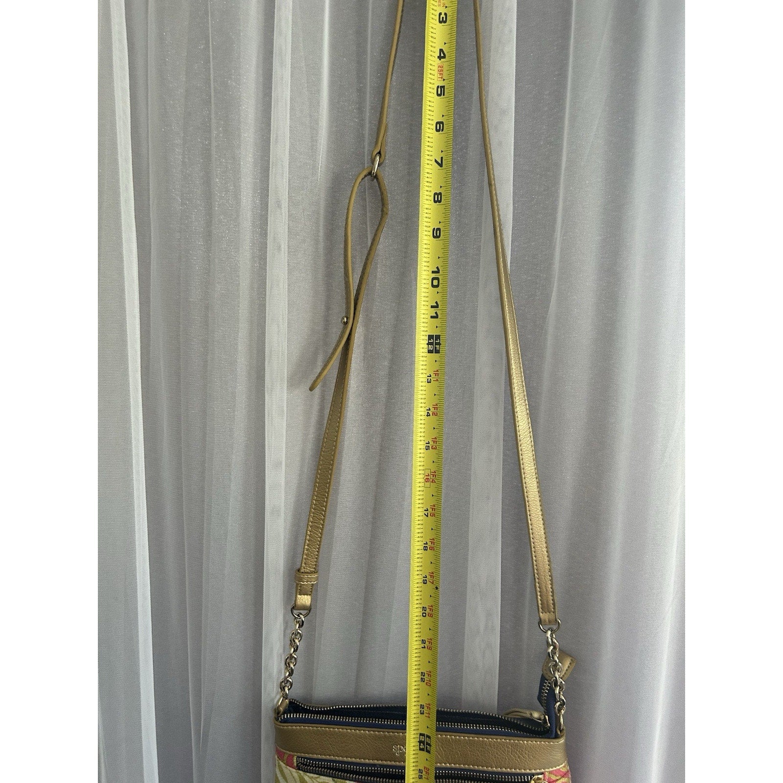 This Spartina 449 Carson Cottage East West Hipster Purse features pink and orange floral patterns on a multicolor exterior, with green handles/straps and gold hardware. It has a zip closure and is made of leather and linen. The bag is 5" tall, 1" deep, and 1.5" wide, making it a stylish crossbody option for women.
