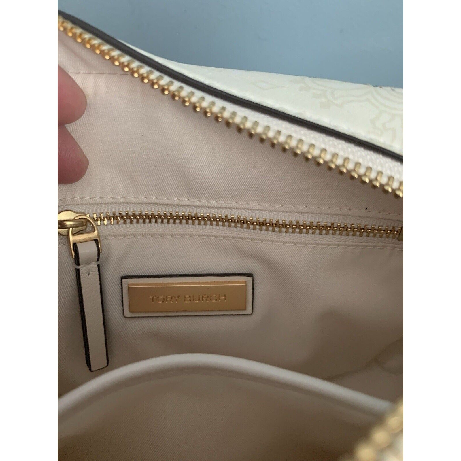 Elevate your style with this stunning Tory Burch Fleming crossbody bag. The ivory leather exterior is accented with a beautiful floral pattern and a strap detail that adds a touch of elegance to the bag. The bag has a zipper closure and features a cross-body strap that can be adjusted to your desired drop.