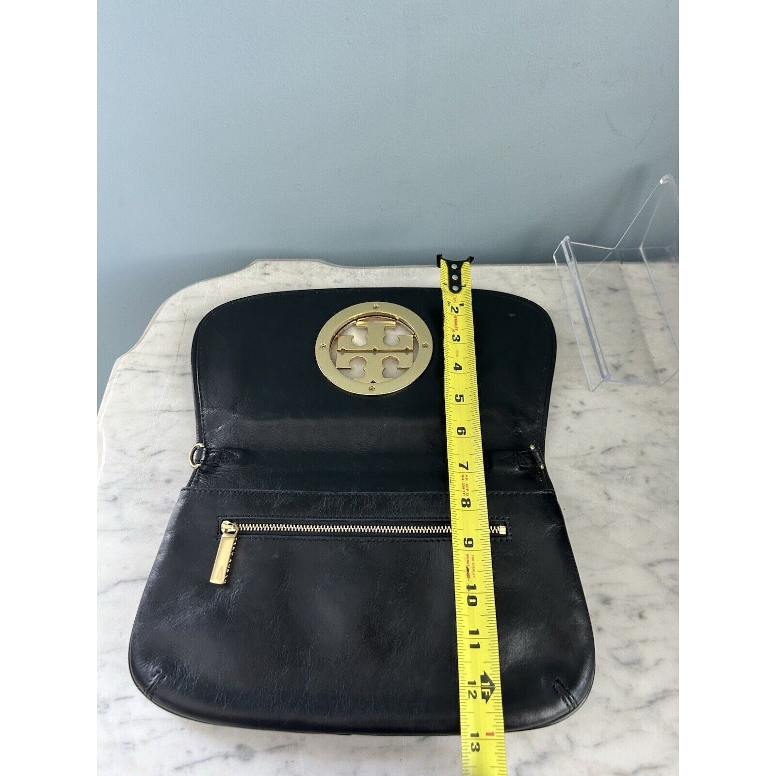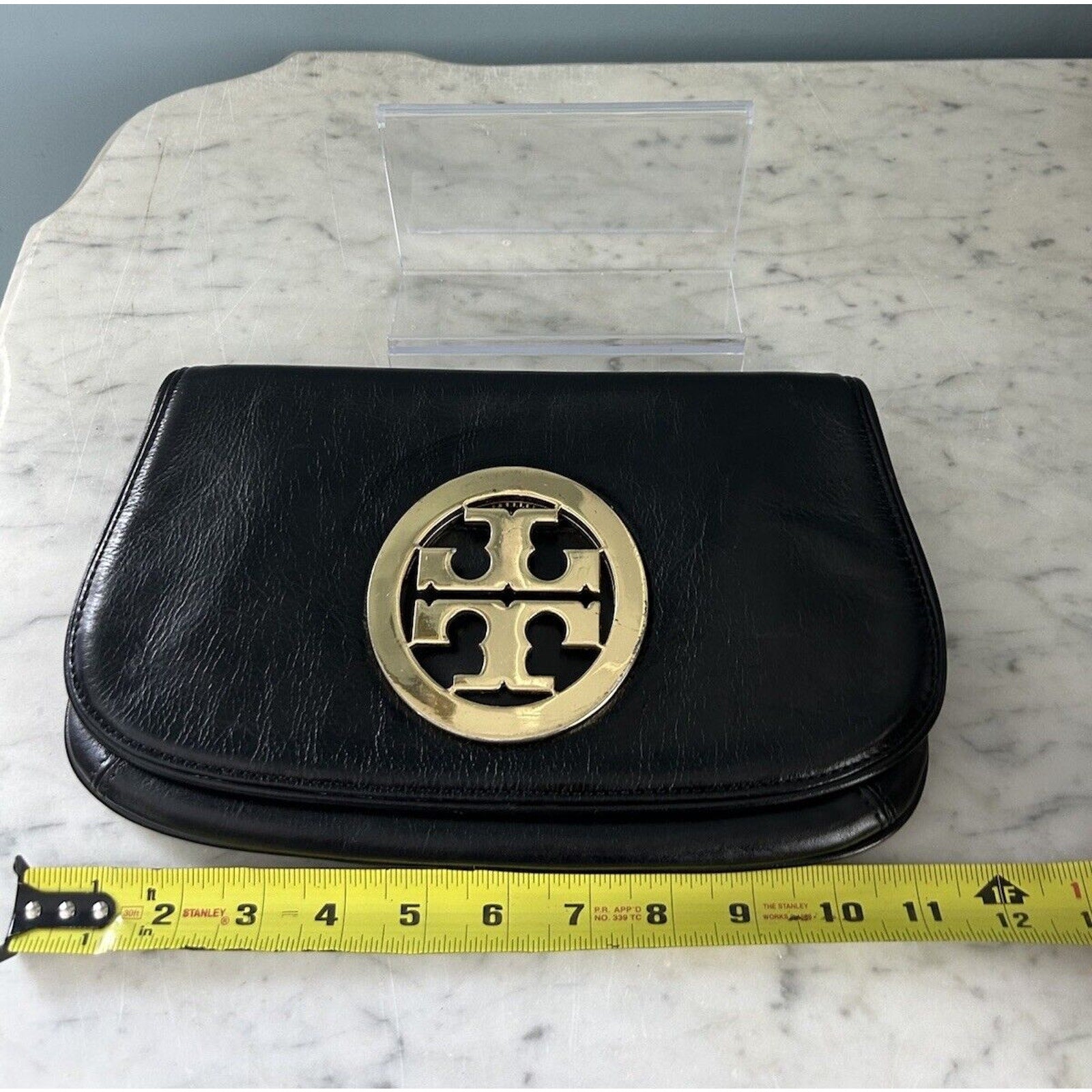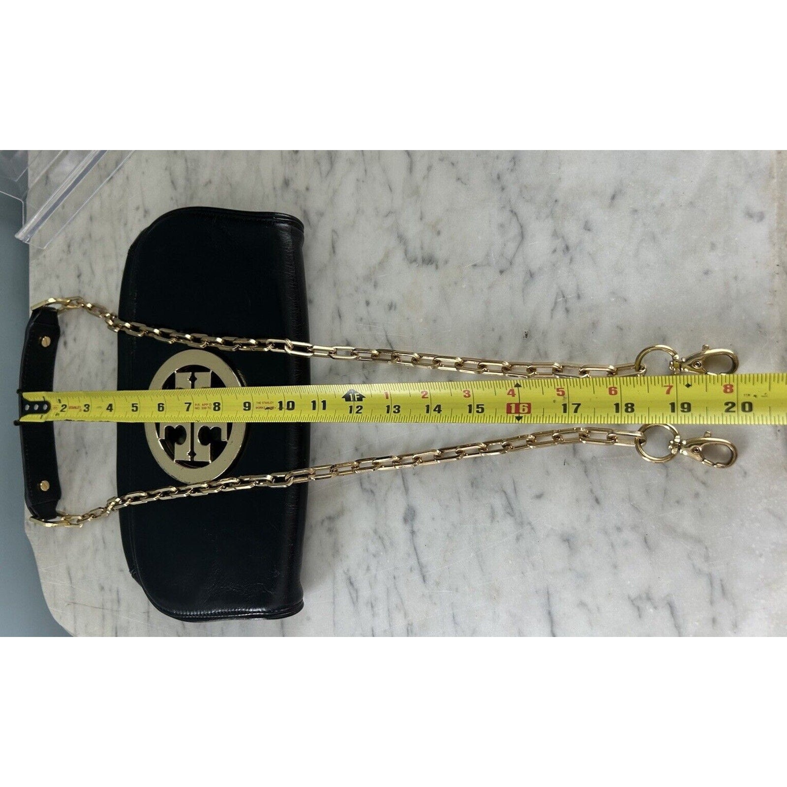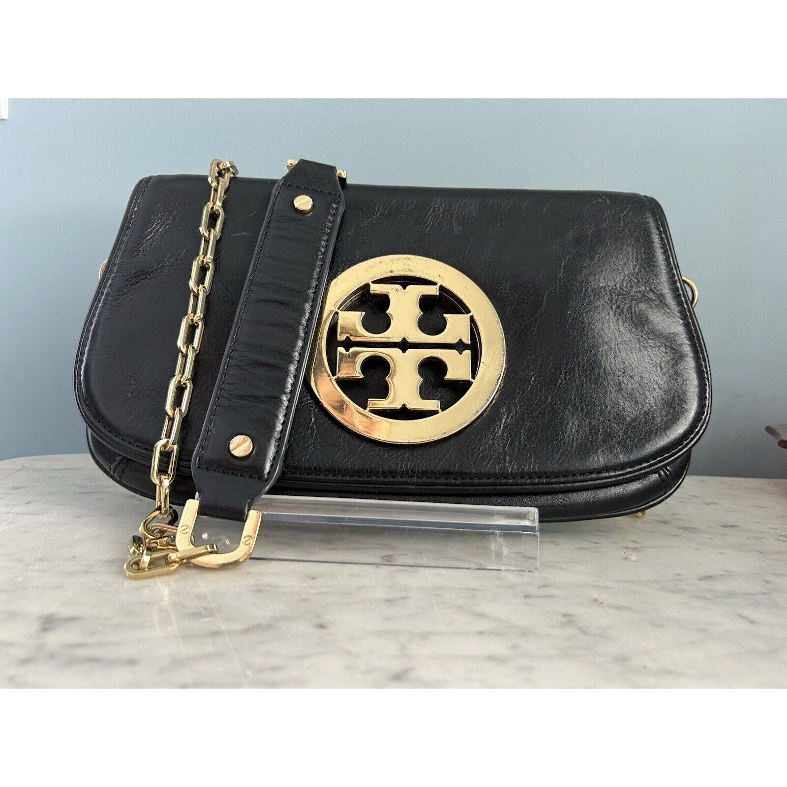 Tory Burch Reva Black Leather Purse Detachable Gold Chain Strap Crossbody Clutch