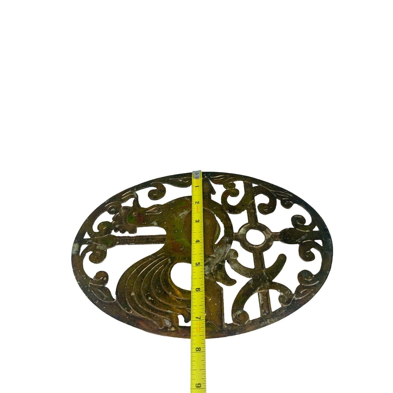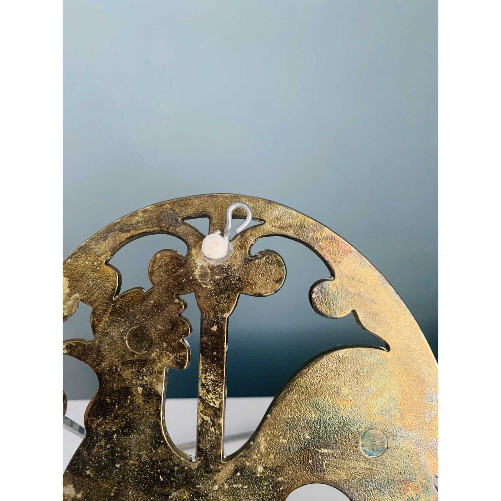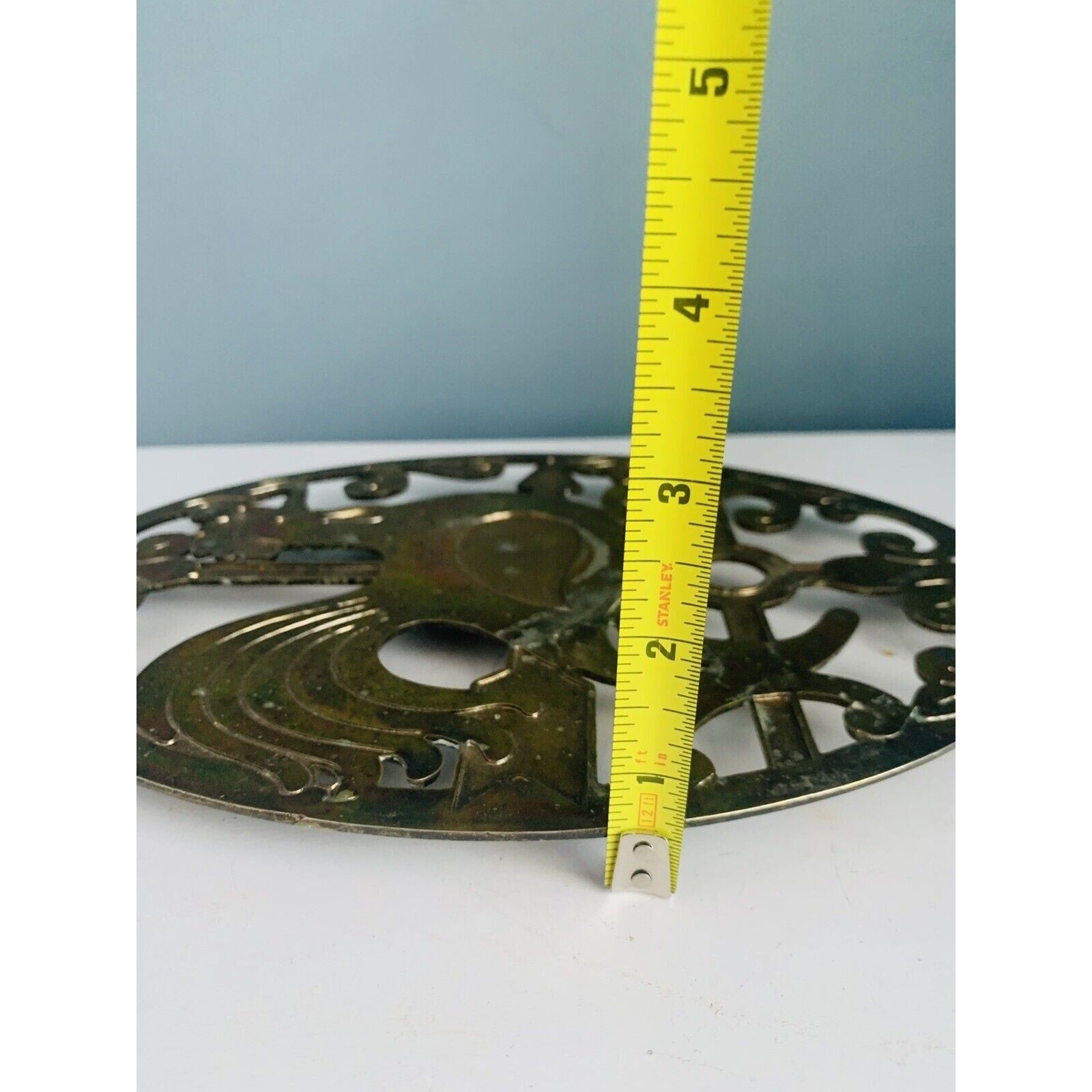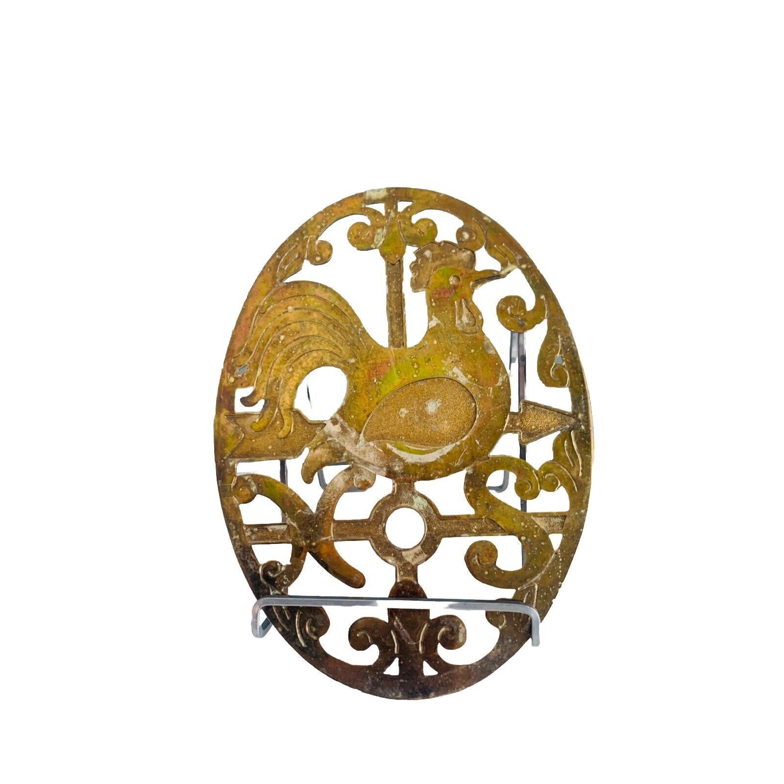 Add a touch of farmhouse charm to your kitchen with this vintage trivet hot plate featuring a rooster design. Made in Italy from silver plate metal, this oval-shaped trivet is perfect for protecting your countertops and table surfaces from hot dishes. Whether you're cooking up a storm or simply displaying it as a decorative piece, this trivet is sure to add a touch of whimsy to your space. The intricate details of the rooster design make it a great addition to any collection of farm-themed decor.