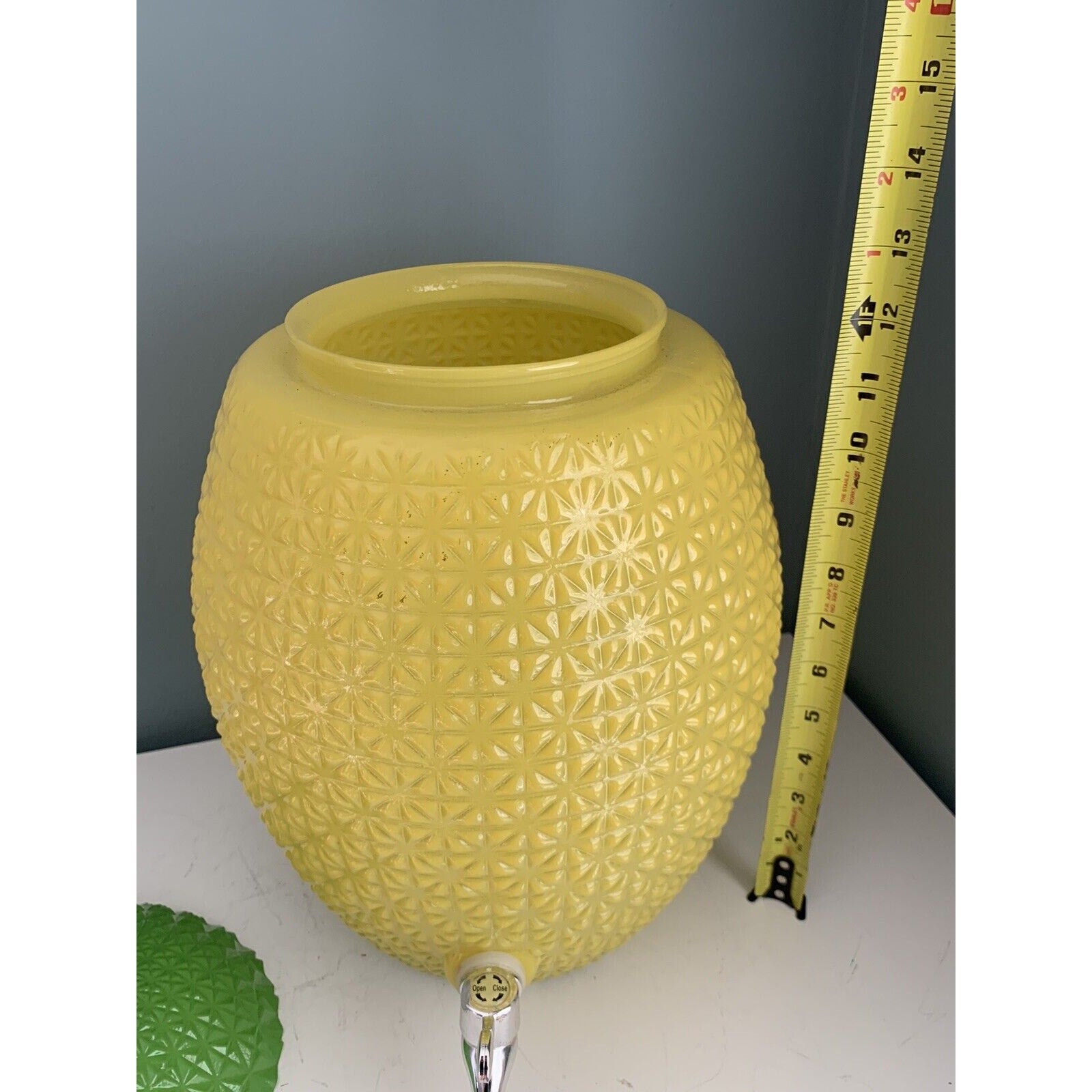 The dispenser has a large size with a diameter of 5.5 inches, a height of 17 inches, and a width of 8 inches. It comes in a set of 2 and is an original product from the brand. The item is recommended to be hand-washed only. This Pineapple Glass Beverage Dispenser is a great addition to your collection or as a standalone statement piece.