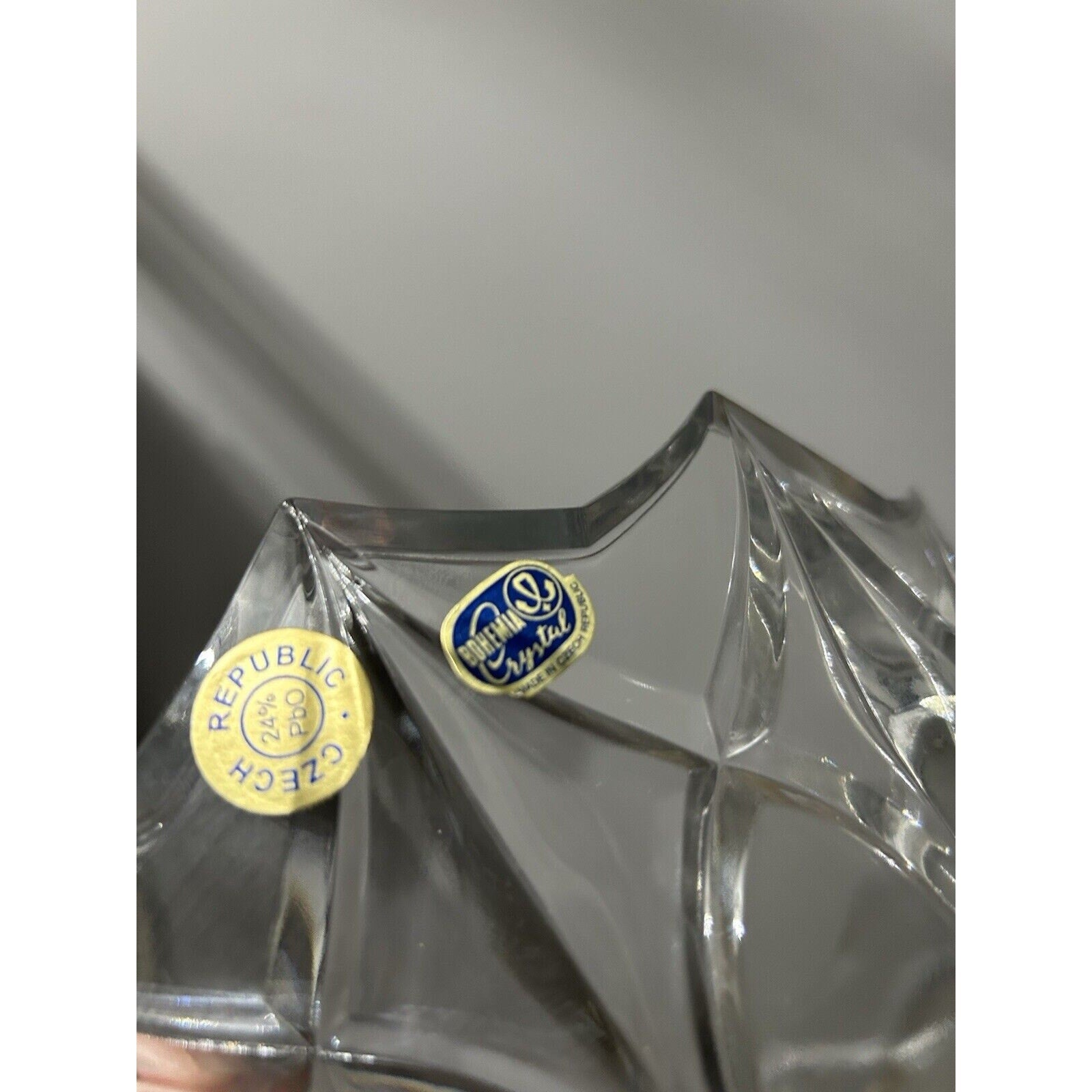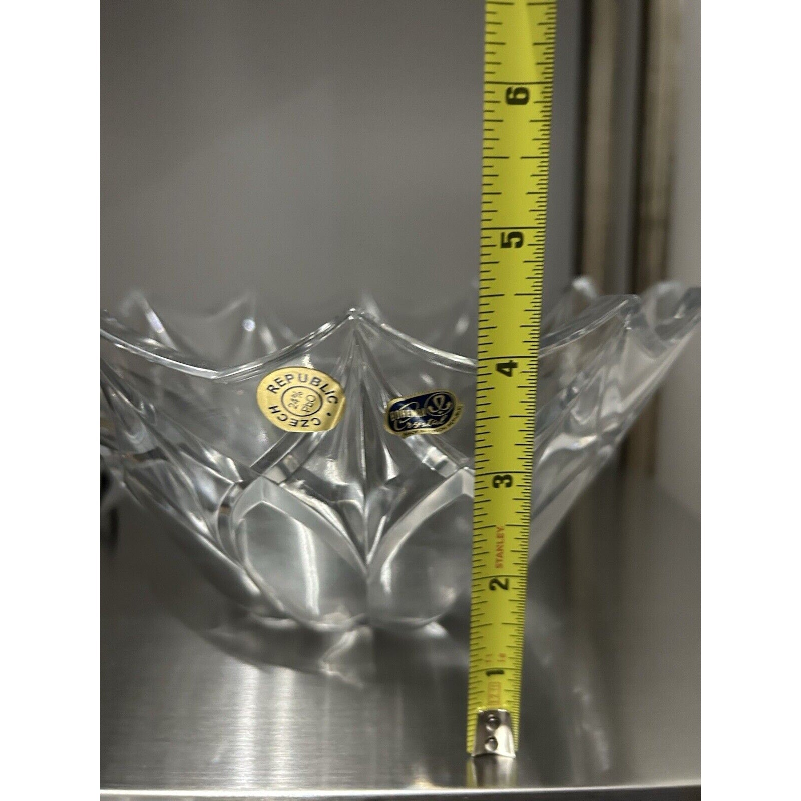 Excellent condition - no chips or cracks. Original stickers on crystal bowl. Vintage Bohemia Crystal 12 Point Serving Bowl from Czech Republic, made of 24% PbO crystal glass. This decorative bowl compote has a clear color, standing at 4.5 inches tall and measuring 9 1/4 inches wide. Weighing 3 pounds and 7 ounces, this original vintage piece by Bohemia features intricate detailing and is a stunning addition to any collection.