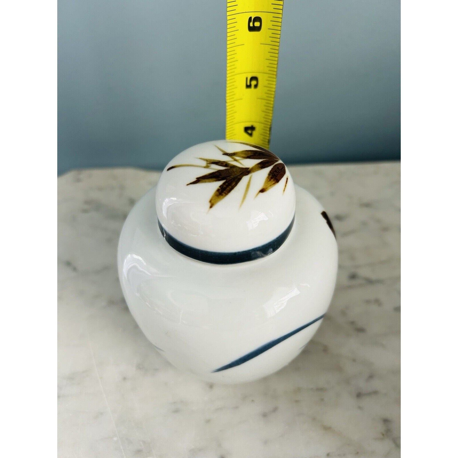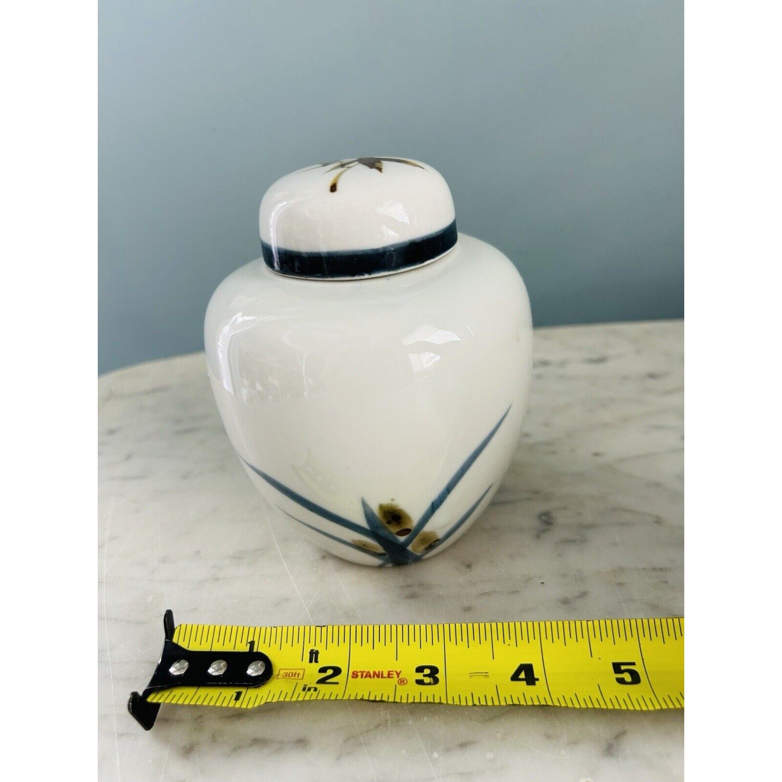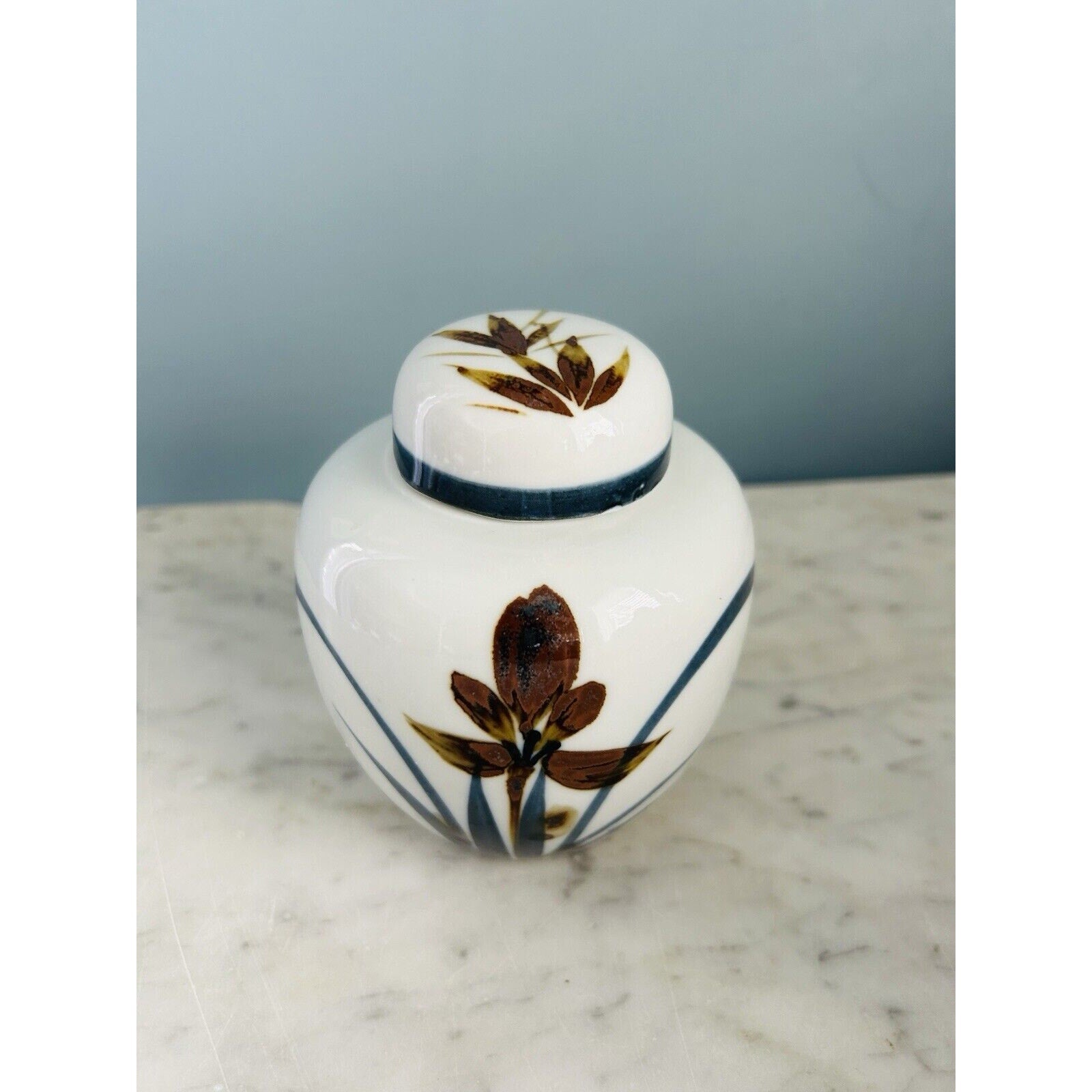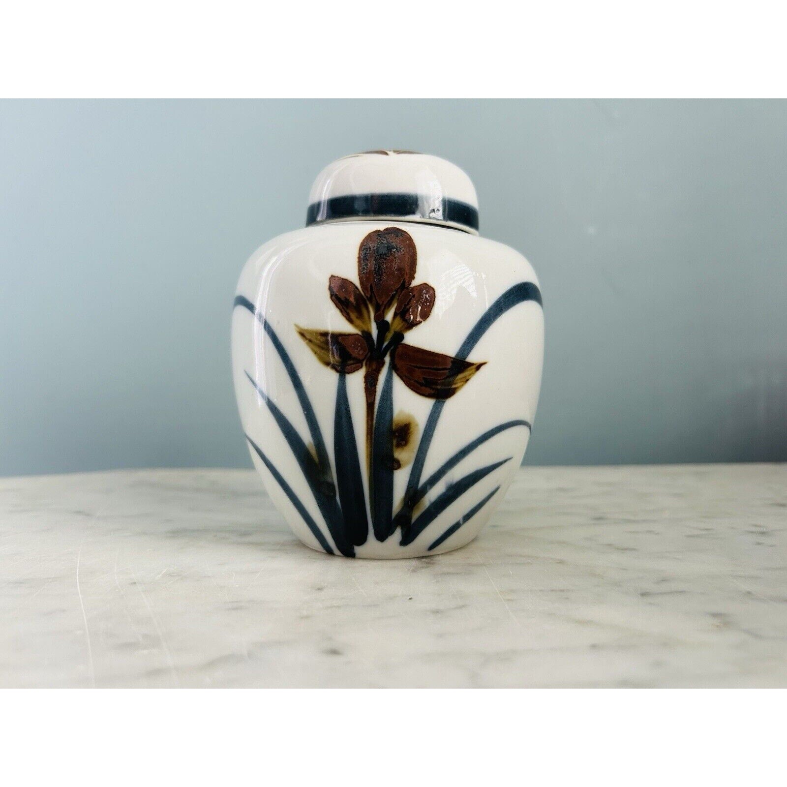 Great condition. No chips or cracks. This is a small round ceramic vase with a multicolor floral design, hand-painted in an Asian style. It features a lid and is part of the Oriental Collection by the brand Ginger. Handmade in Japan, this vase showcases a brown Lily flower subject and has an item height of 4 inches and an item width of 5 inches. The item weight is 11 ounces. Blue leaves.