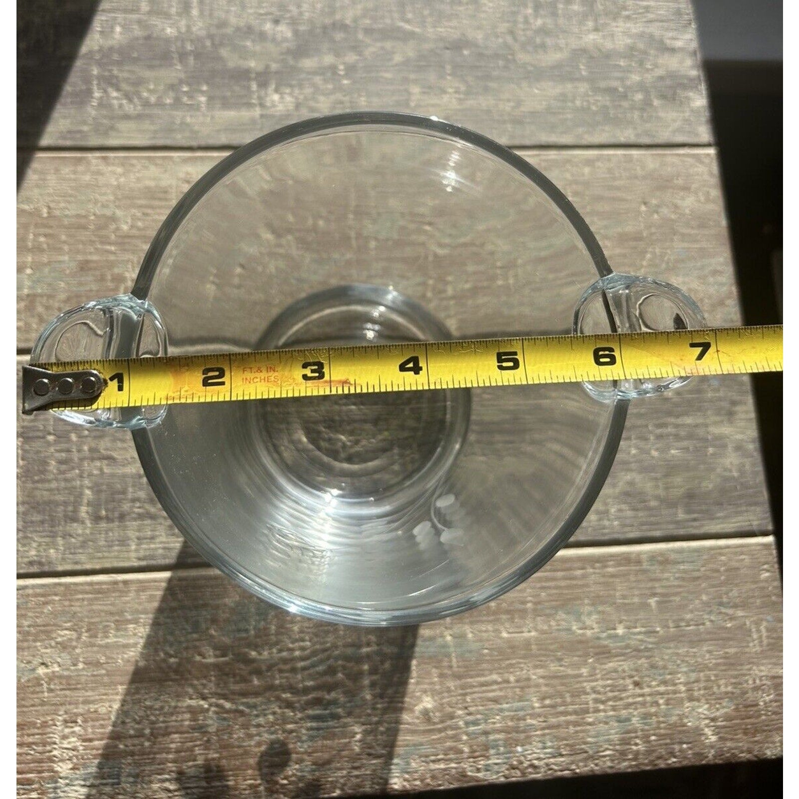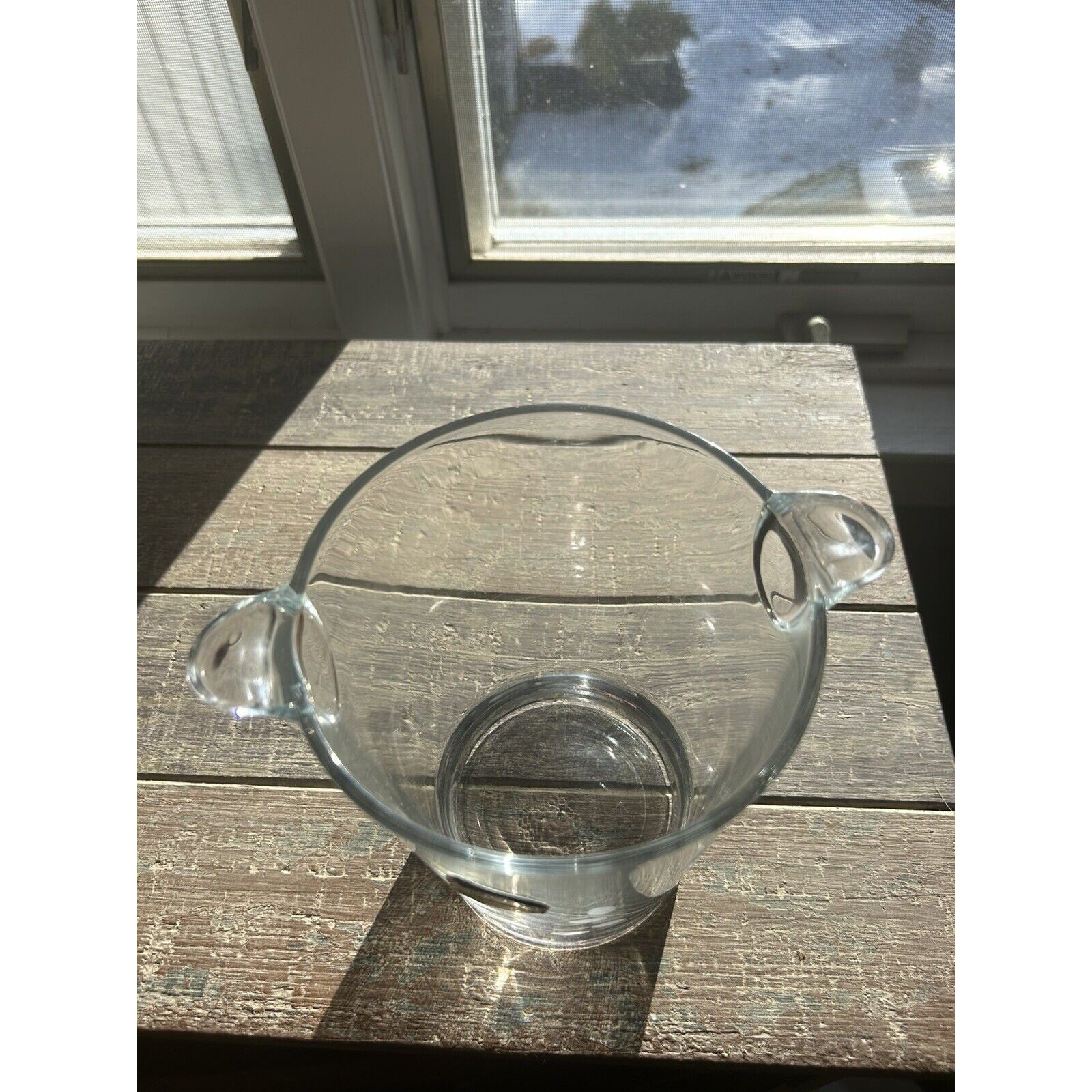 This is a vintage ice bucket by Cristal Mode, handcrafted in Italy. It is made of clear crystal with silver leaf etching, featuring a decorative handle. The item has a diameter of 5.5", height of 6.5", and length of 7". It weighs 2 pounds 12 ounces, and is an original piece.