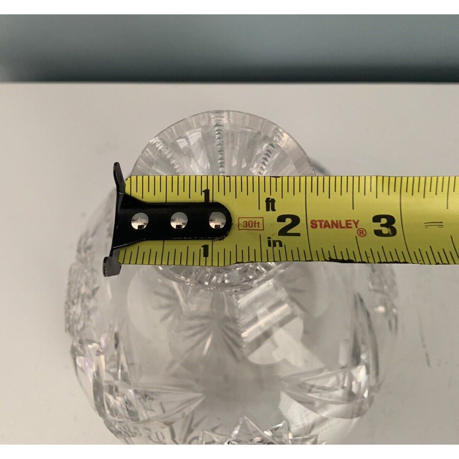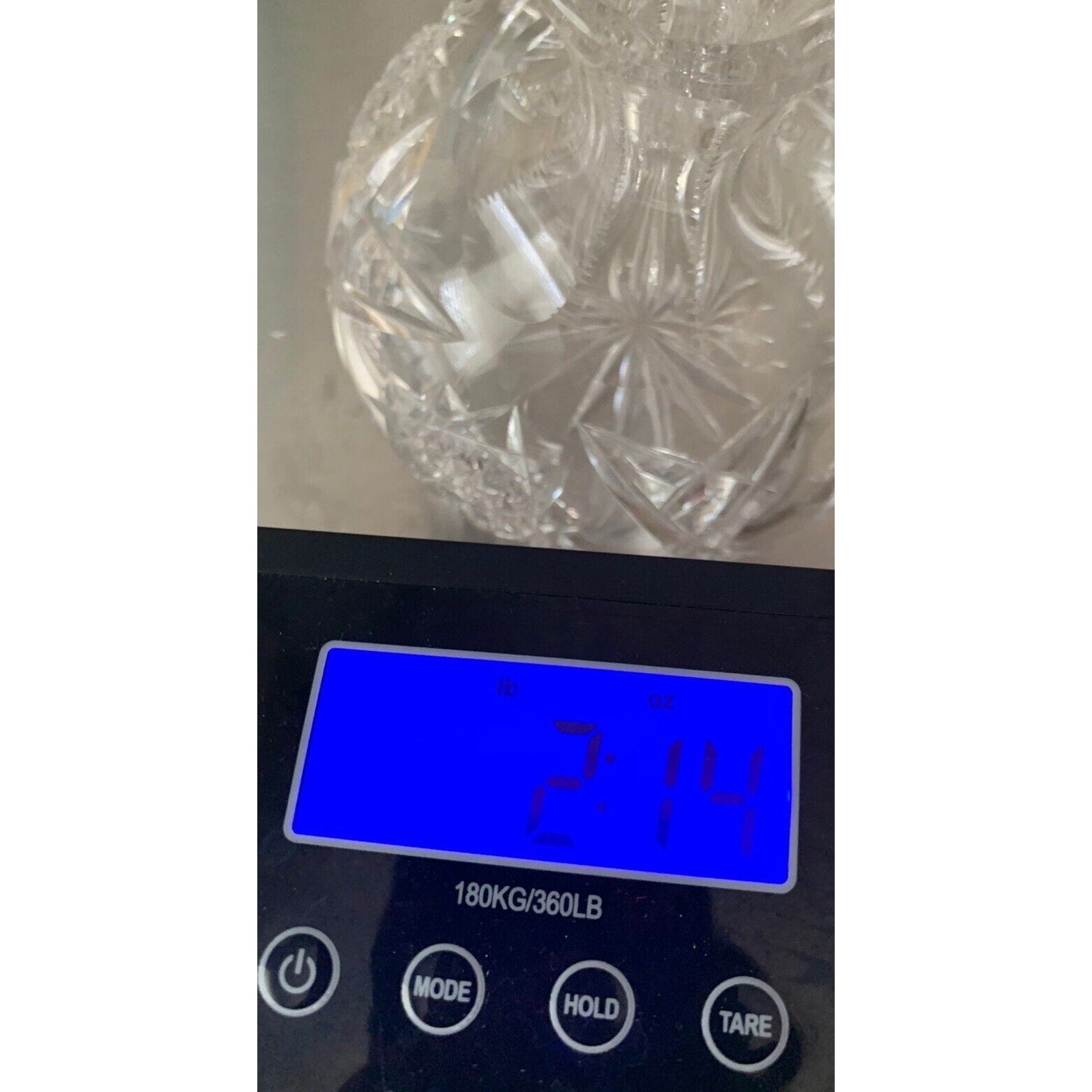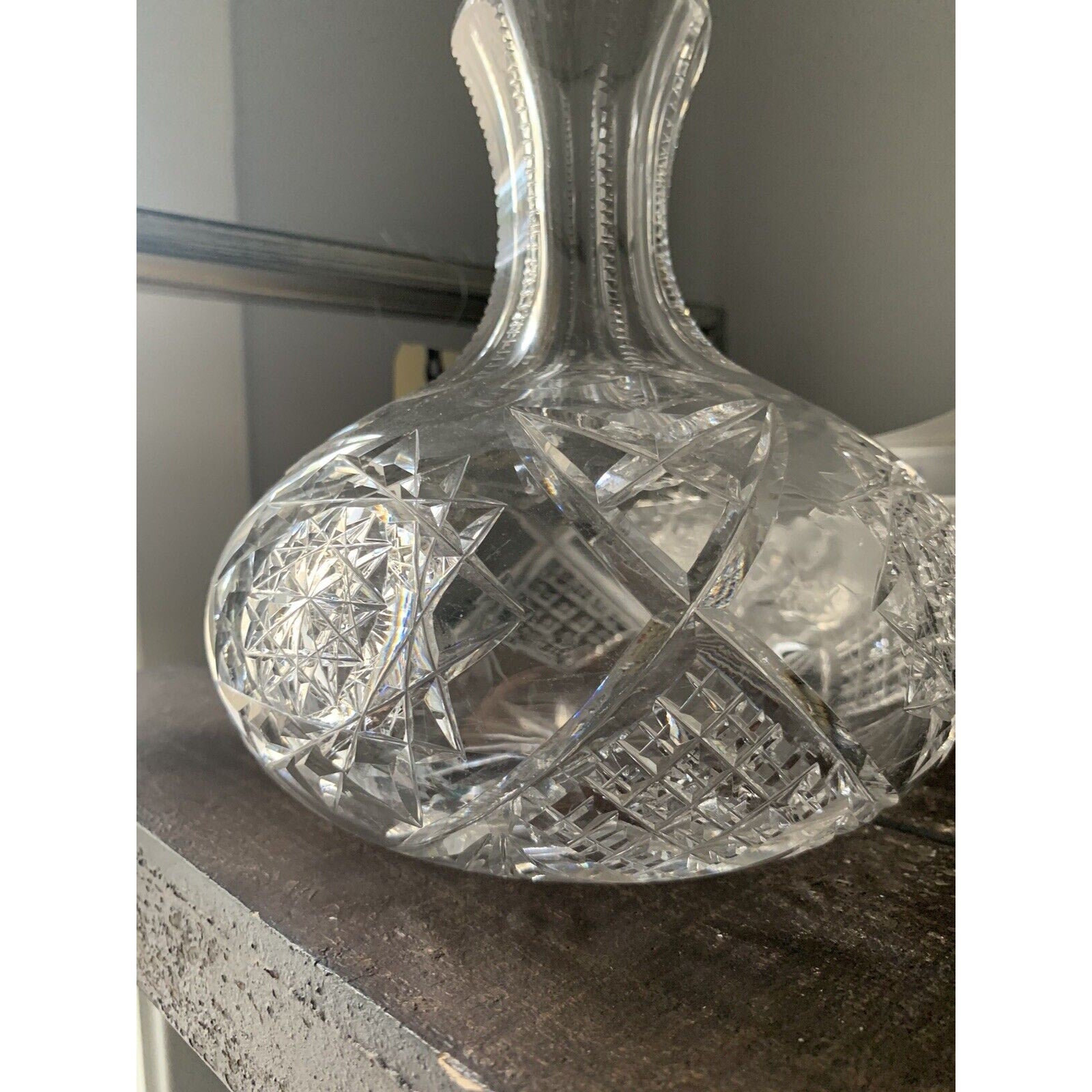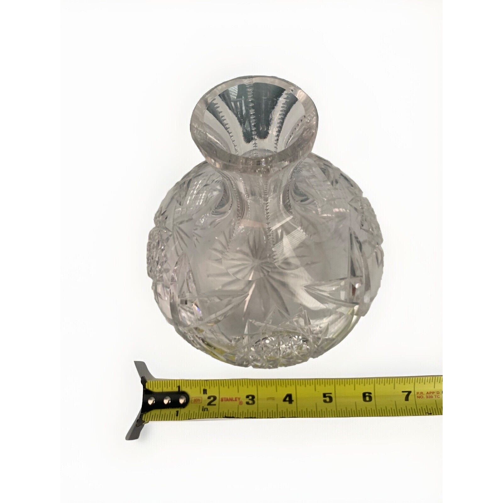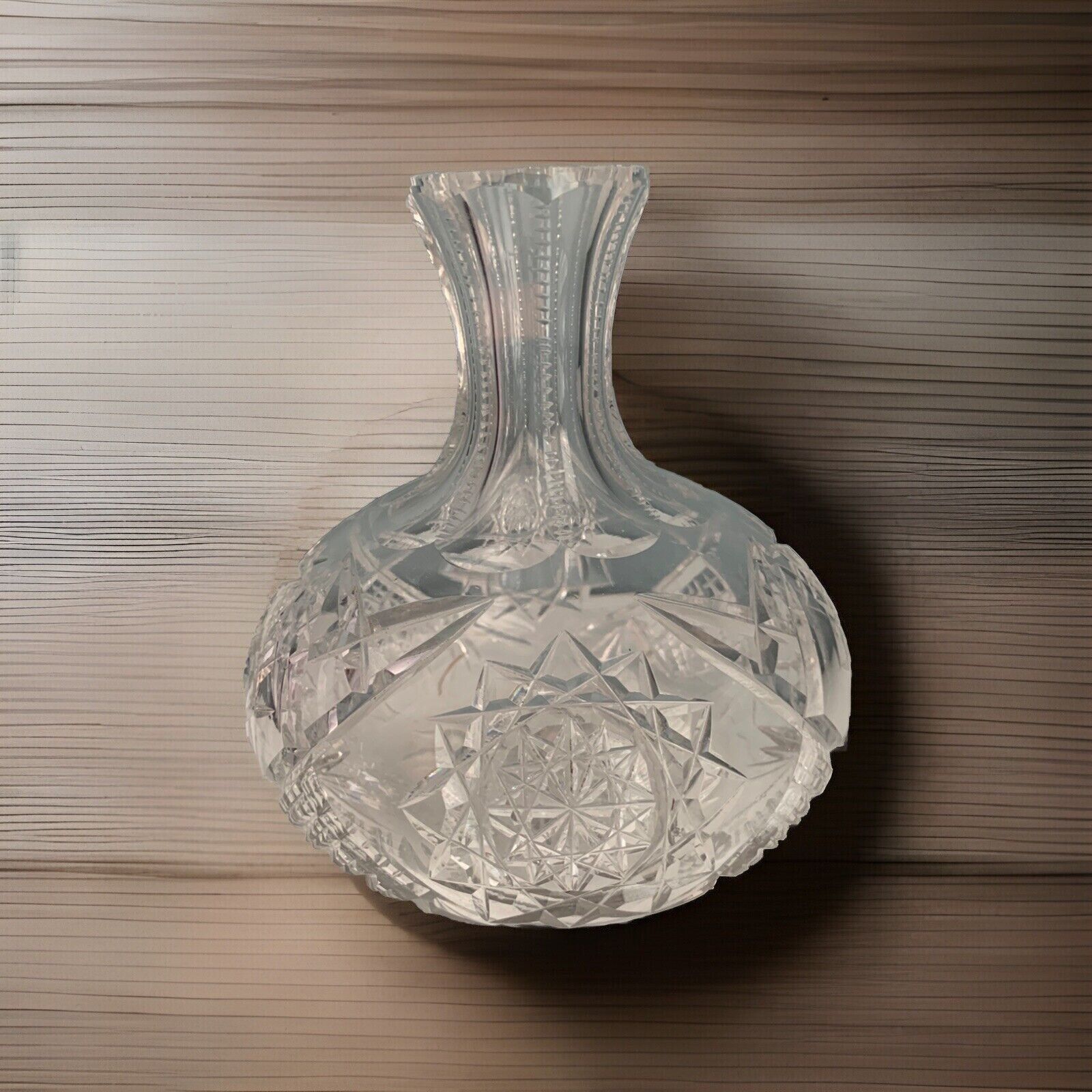 This original, unmarked vase stands at 7.5 inches tall and is 6.5 inches wide. It weighs 2 pounds and 14 ounces, making it a substantial piece for any home or office. The production technique of cut glass adds to its uniqueness and charm. This carafe vase is perfect for displaying flowers or as a standalone decorative item.